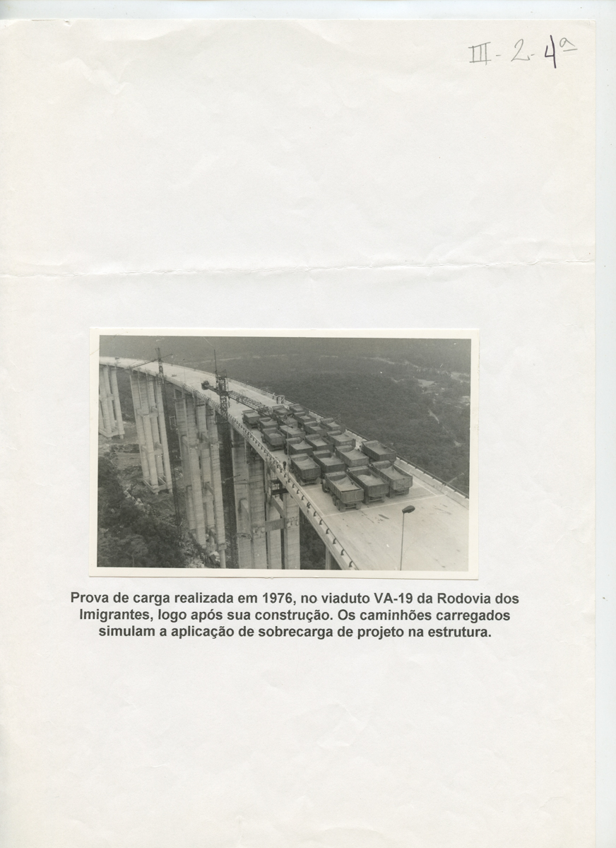 3 FOTOS - Foto 1 – 14x9cm. P&B. Foto colada em folha A4. Caminhões em linha numa ponte. Notação: Prova de carca realizada em 1976, no viaduti VA-19 da Rodovia dos Imigrantes, logo após sua construção. Os caminhões carregados simulam a aplicação de sobrecarga de projeto na estrutura. III. 2.4ª”.