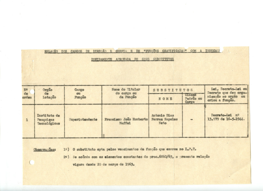 Documentos 01.001.0016.0104 Baixar ApresentaçãoNúmero de registro01.001.0016.0104ConteúdoRelação de cargos de Direção e Chefia e de "Funções gratificadas" com a indicação devidamente aprovada de seus substitutos.GrupoRecursos HumanosSubgrupoExpediente de pessoal e controle de frequênciaSérieDocumentos institucionaisSuportePapelGêneroTextualDataSem dataNível de descriçãoIndividual Metadados TipologiaRelação de cargosTécnica de registroDatilografiaFormatoFolhaQuantidade de documentos1 documento, 1 folhaNúmero de Itens do conjunto001MaterialpapelIdiomaPortuguêsProcedênciaMemória Histórica IPT Conservação Estado de conservaçãoBomAcondicionamentoCaixa Filifold | Caixa poliondas | Papel glassine Item anteriorNota Próximo itemCurrículo