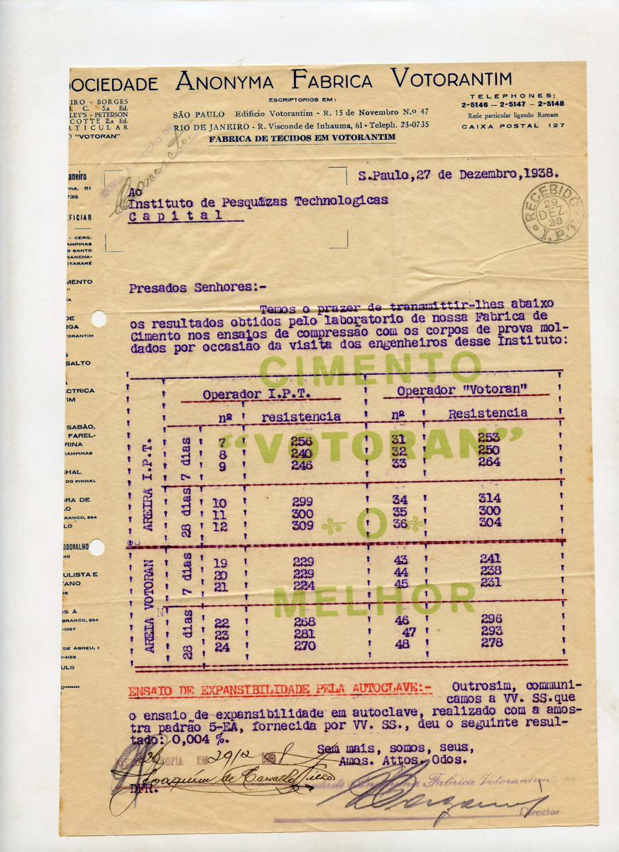Documentos 01.001.0112.0163 Baixar ApresentaçãoNúmero de registro01.001.0112.0163 | 01.001.0112.0164ConteúdoTabelas com resultados obtidos pelo laboratório da Fabrica de Cimento VotorantimGrupoMemória InstitucionalSubgrupoMemória da ciênciaSérieDossiêsSuportePapelGêneroTextualData[27/12/1938]Nível de descriçãoConjunto Metadados TipologiaTabela de resultadosTécnica de registroDatilografiaFormatoFolhaQuantidade de documentosA4, 4 folhasNúmero de Itens do conjunto002MaterialpapelIdiomaPortuguêsProcedênciaMemória Histórica IPT Conservação Estado de conservaçãoBomOutros aspectos físicosApresenta dobras e manchasAcondicionamentoCaixa Filifold | Papel glassine Itens deste conjunto Mídias dos conjuntosConjunto de itens Ver todos os 2 itens relacionados Item anteriorRelatório Próximo itemCarta Outros itens deste Grupo 01.020.0024.0001 01.020.0023.0001 01.020.0019.0001 01.020.0016.0001