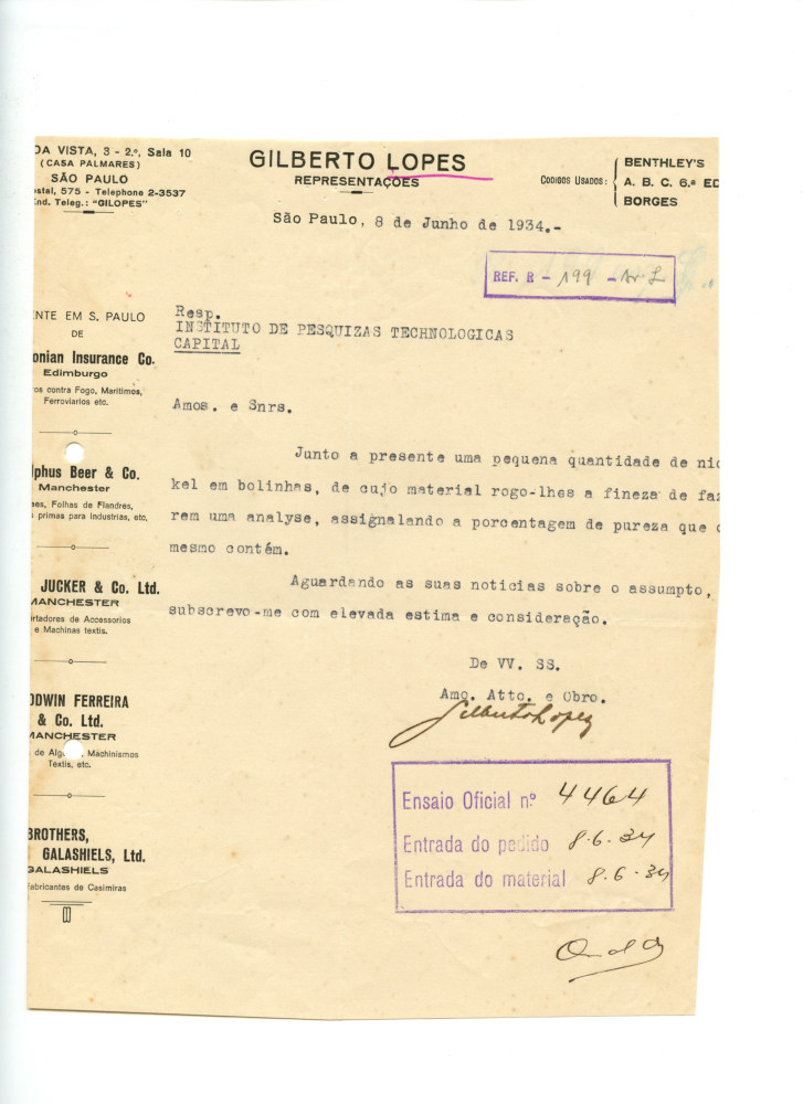 01.001.0013.0021 Baixar Número de registro01.001.0013.0021Conjunto de itens Conteúdo Correspondências diversas trocada entre o IPT e instituições, empresas e particulares. São encontrados pedidos de material, de ensaios químicos e físicos, consultas técnicas, pedidos de estágio, entre outros. GA a GI Grupo Memória Institucional Subgrupo Memória da ciência Data __/__/1934 - __/__/1967 Quantidade de documentos 282 documentos, 322 folhas Procedência Memória Histórica IPT Item anterior01.001.0013.0020 Próximo item01.001.0013.0022