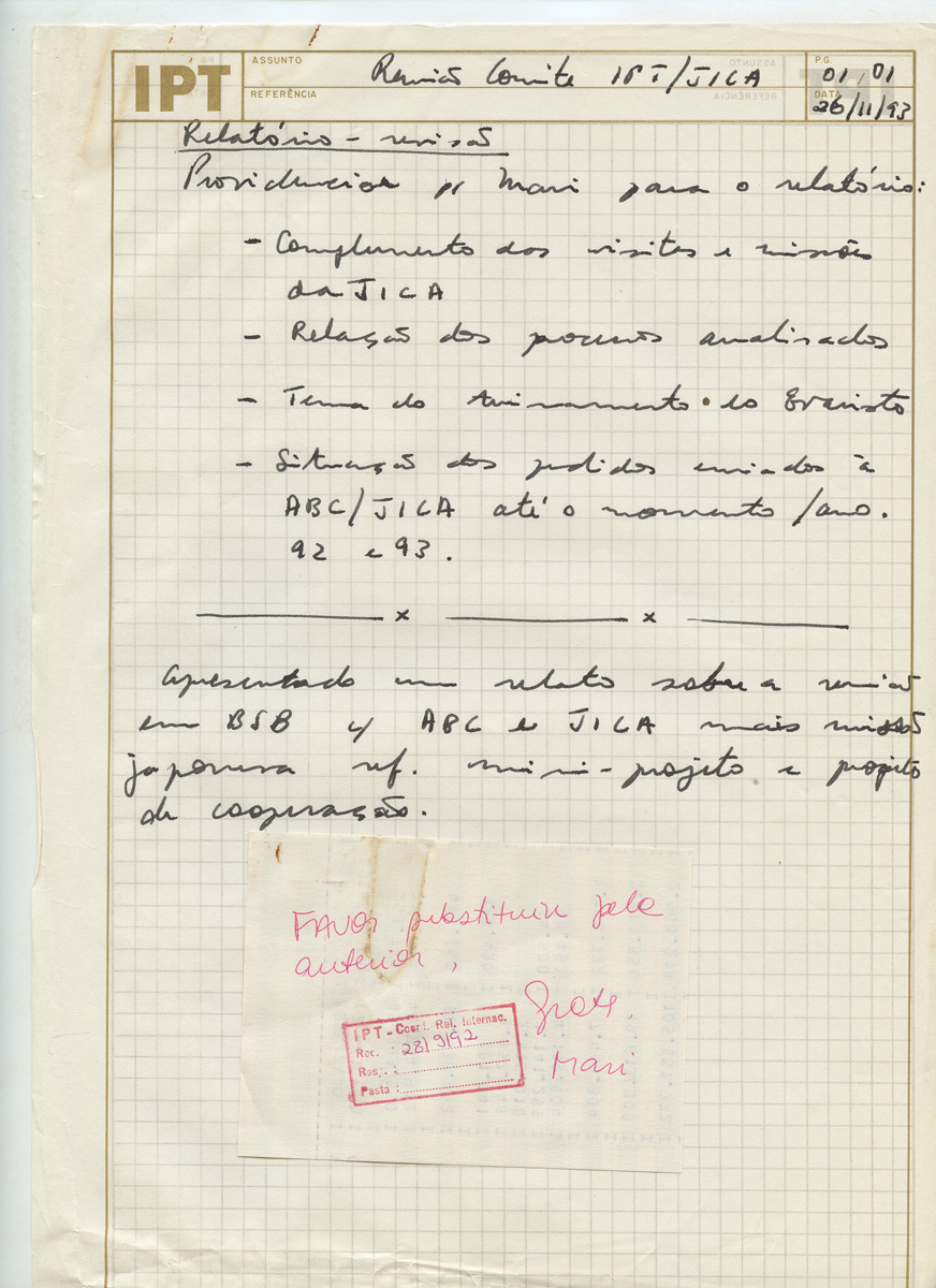 Correspondências do comitê da JICA (fax, cartas, memorandos, minutas, circular), atas de reuniões, relatórios de projetos e atividades desenvolvidas pelo comitê. Presidente/Diretor Superintendente: Fracisco de Assis Souza Dantas; Vice-Presidente/Coordenador da Divisão de Tecnologia de Transportes: Toshi-Ichi Tachibana; Secretária Executiva: Mari Tomita Katayama; Membros: Amantino Ramos de Freitas, Izabel Margarida Geve, Saburo Ikeda, Sussumo Niyama e Paulo Affonso Doin; Instruções normativas quanto a de recepção pelo IPT de um especialista técnico, enviado através da JICA, que não se encontrava vinculada a nenhum projeto custeado pela JICA; Roteiro da palestra para o simpósio Cooperação Técnica: um caminho para a harmonia da humanidade, palestra "Melhorias obtidas através de projetos para o desenvolvimento de tecnologias industriais e temas para futuras considerações"