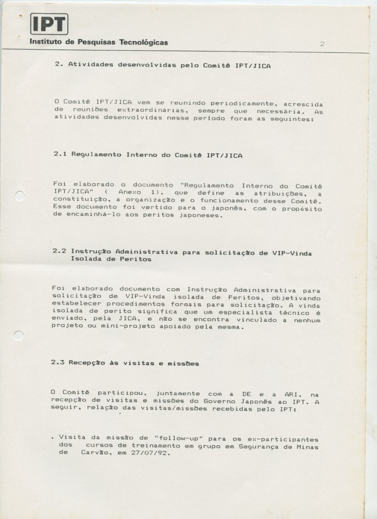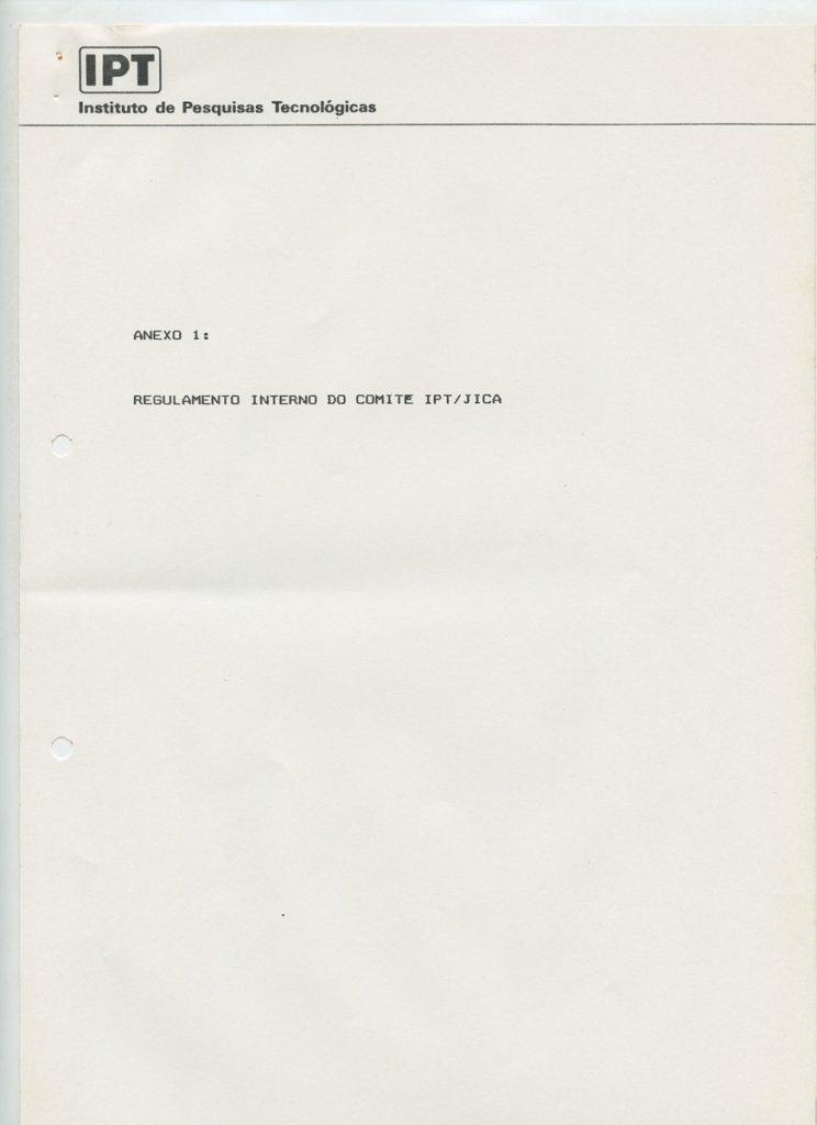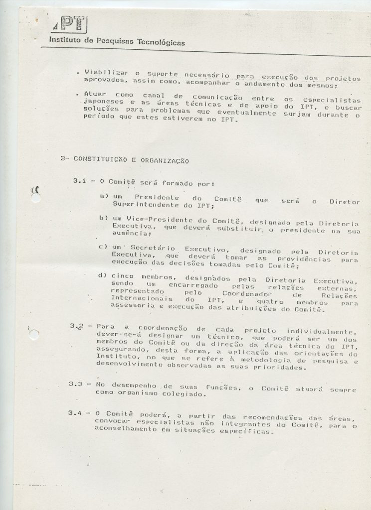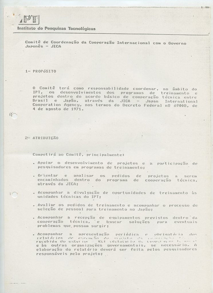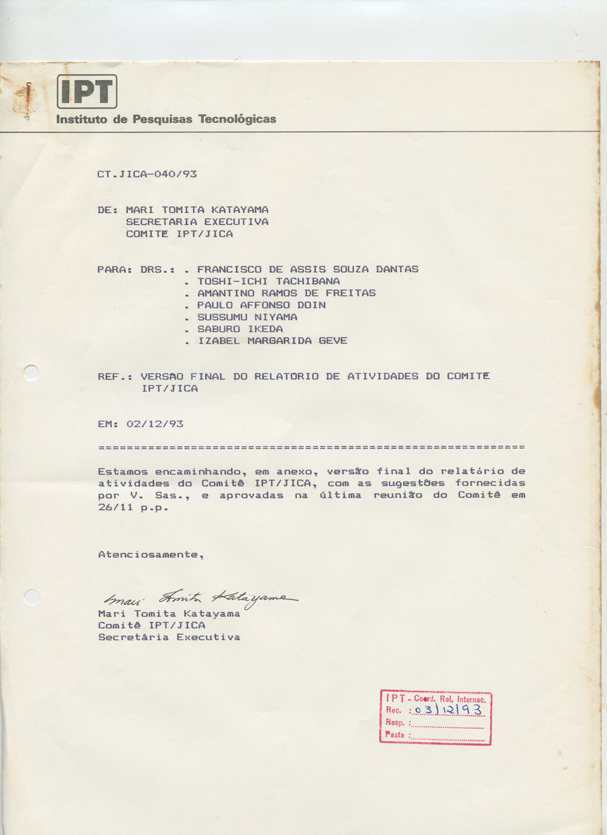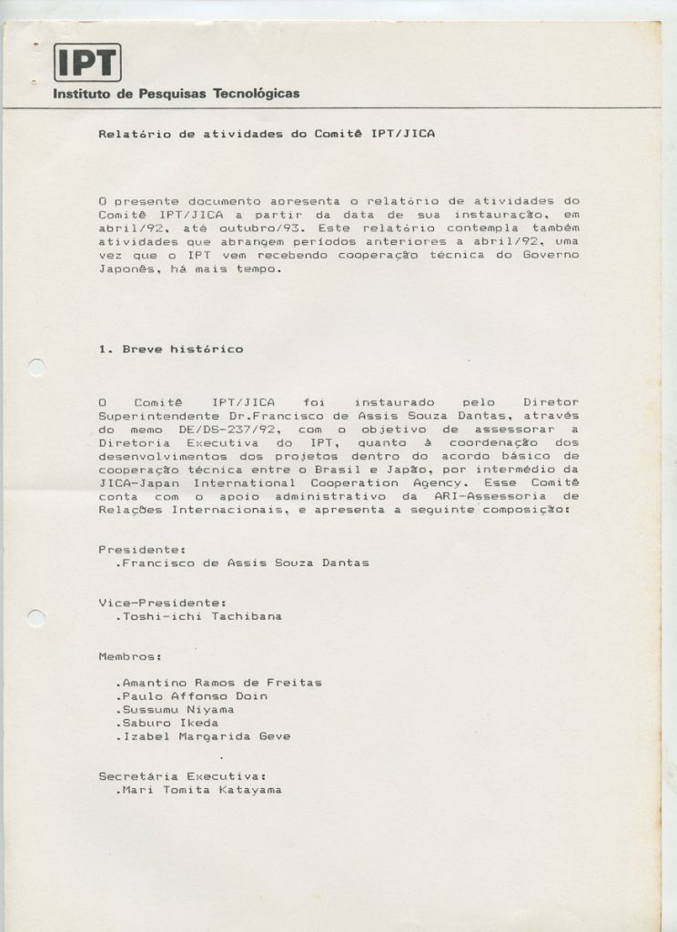Correspondências do comitê da JICA (fax, cartas, memorandos, minutas, circular), atas de reuniões, relatórios de projetos e atividades desenvolvidas pelo comitê. Presidente/Diretor Superintendente: Fracisco de Assis Souza Dantas; Vice-Presidente/Coordenador da Divisão de Tecnologia de Transportes: Toshi-Ichi Tachibana; Secretária Executiva: Mari Tomita Katayama; Membros: Amantino Ramos de Freitas, Izabel Margarida Geve, Saburo Ikeda, Sussumo Niyama e Paulo Affonso Doin; Instruções normativas quanto a de recepção pelo IPT de um especialista técnico, enviado através da JICA, que não se encontrava vinculada a nenhum projeto custeado pela JICA; Roteiro da palestra para o simpósio Cooperação Técnica: um caminho para a harmonia da humanidade, palestra "Melhorias obtidas através de projetos para o desenvolvimento de tecnologias industriais e temas para futuras considerações"