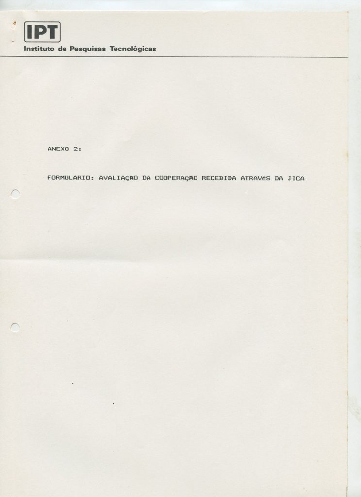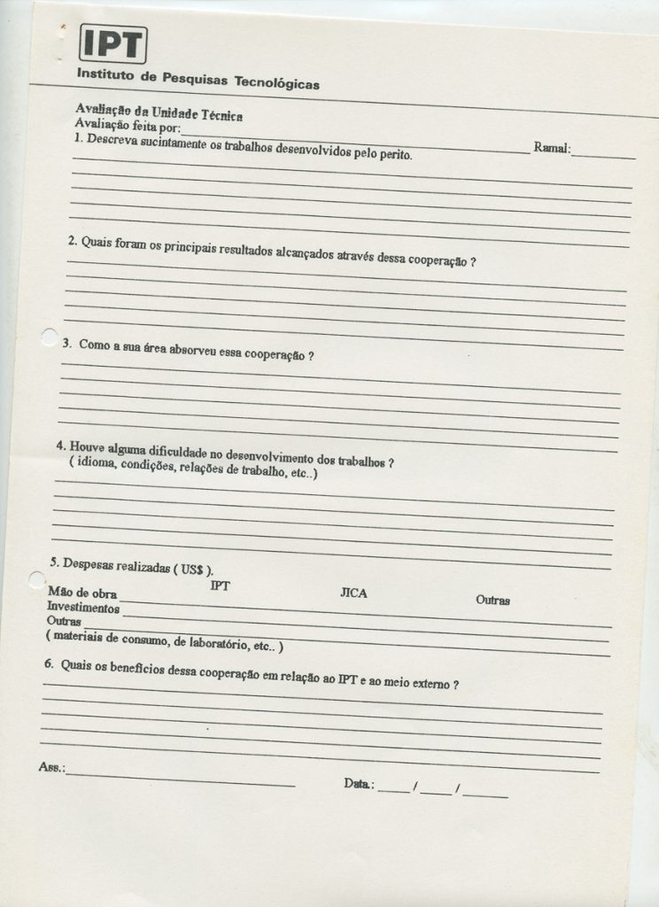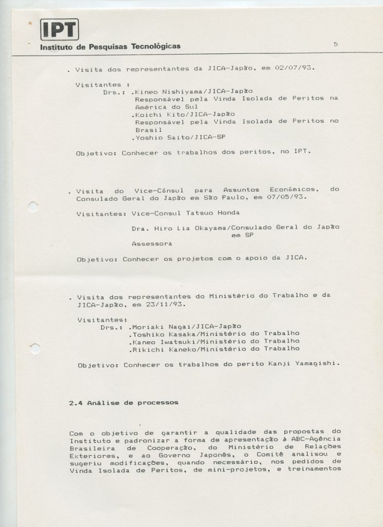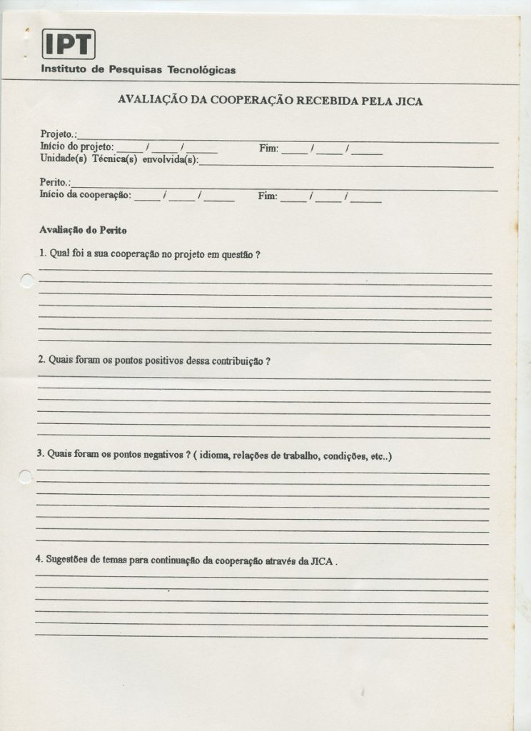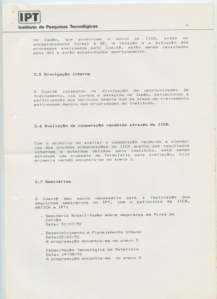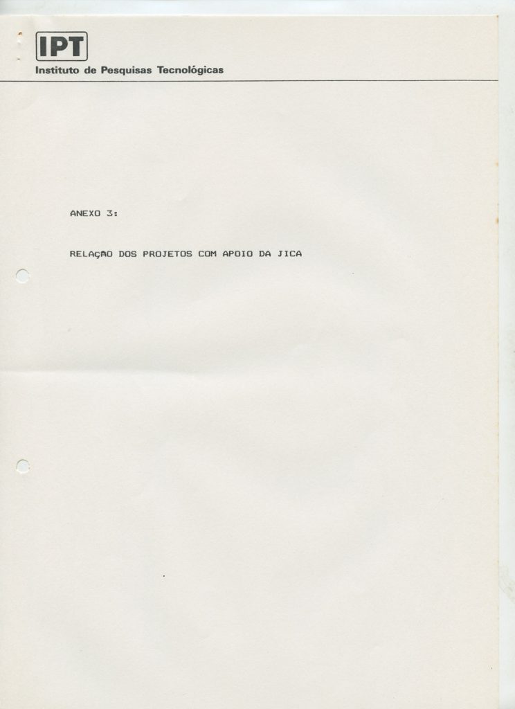 Correspondências do comitê da JICA (fax, cartas, memorandos, minutas, circular), atas de reuniões, relatórios de projetos e atividades desenvolvidas pelo comitê. Presidente/Diretor Superintendente: Fracisco de Assis Souza Dantas; Vice-Presidente/Coordenador da Divisão de Tecnologia de Transportes: Toshi-Ichi Tachibana; Secretária Executiva: Mari Tomita Katayama; Membros: Amantino Ramos de Freitas, Izabel Margarida Geve, Saburo Ikeda, Sussumo Niyama e Paulo Affonso Doin; Instruções normativas quanto a de recepção pelo IPT de um especialista técnico, enviado através da JICA, que não se encontrava vinculada a nenhum projeto custeado pela JICA; Roteiro da palestra para o simpósio Cooperação Técnica: um caminho para a harmonia da humanidade, palestra "Melhorias obtidas através de projetos para o desenvolvimento de tecnologias industriais e temas para futuras considerações"