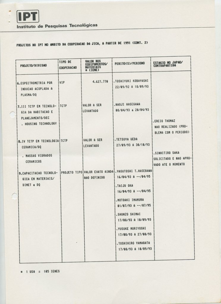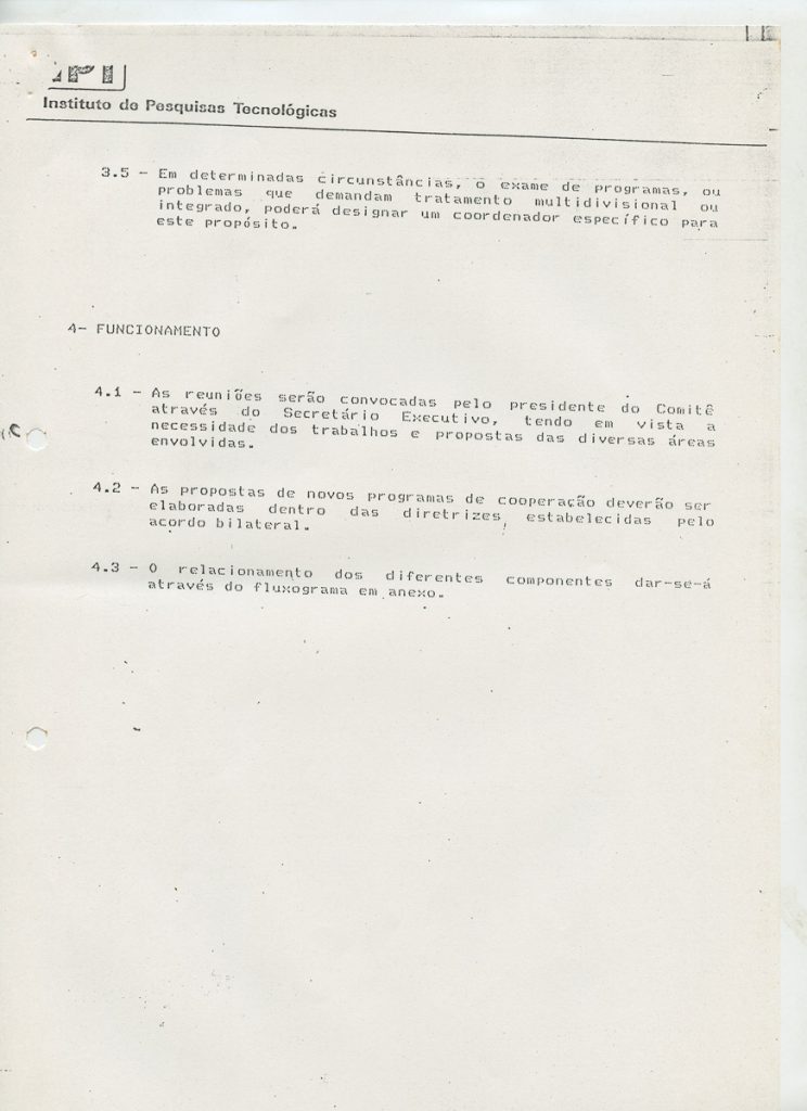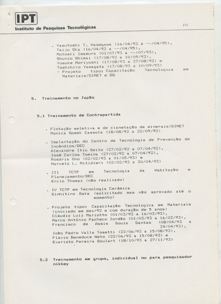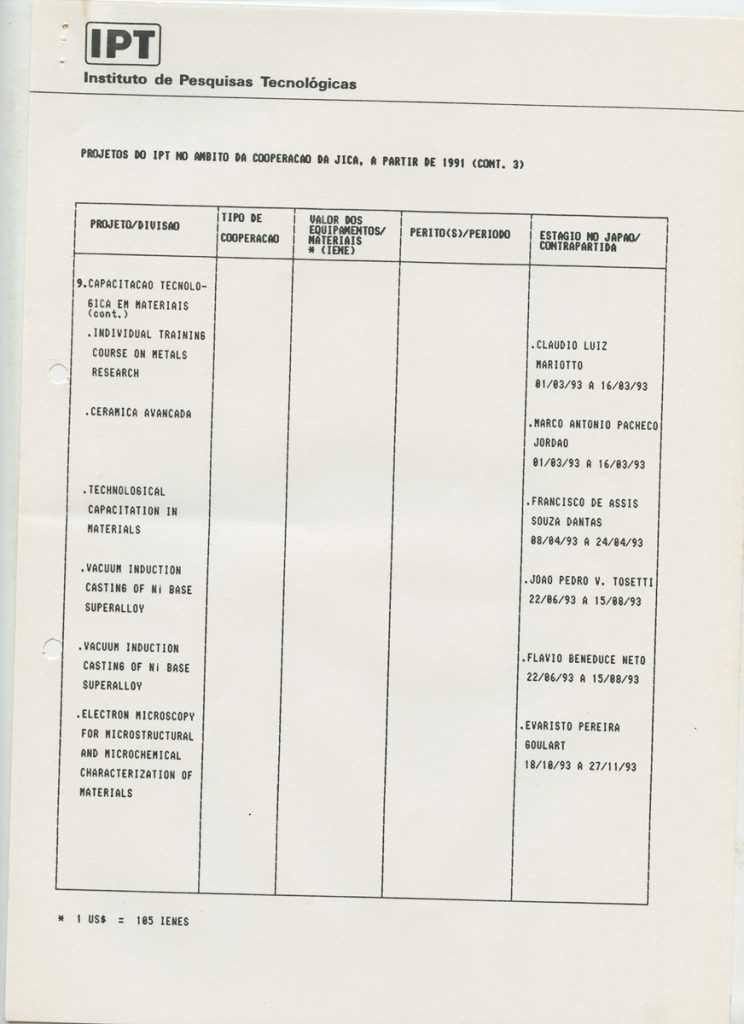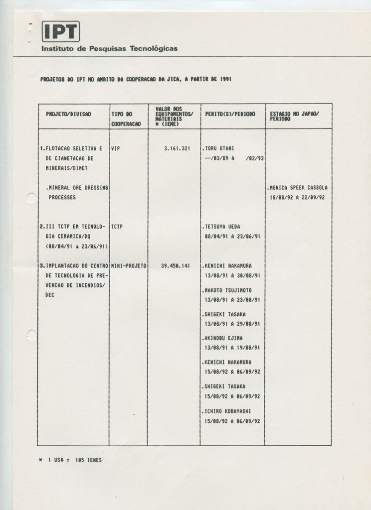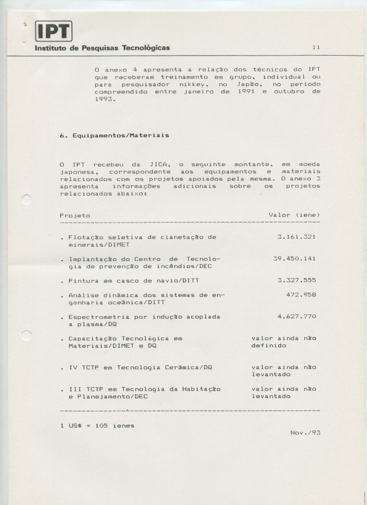 Correspondências do comitê da JICA (fax, cartas, memorandos, minutas, circular), atas de reuniões, relatórios de projetos e atividades desenvolvidas pelo comitê. Presidente/Diretor Superintendente: Fracisco de Assis Souza Dantas; Vice-Presidente/Coordenador da Divisão de Tecnologia de Transportes: Toshi-Ichi Tachibana; Secretária Executiva: Mari Tomita Katayama; Membros: Amantino Ramos de Freitas, Izabel Margarida Geve, Saburo Ikeda, Sussumo Niyama e Paulo Affonso Doin; Instruções normativas quanto a de recepção pelo IPT de um especialista técnico, enviado através da JICA, que não se encontrava vinculada a nenhum projeto custeado pela JICA; Roteiro da palestra para o simpósio Cooperação Técnica: um caminho para a harmonia da humanidade, palestra "Melhorias obtidas através de projetos para o desenvolvimento de tecnologias industriais e temas para futuras considerações"