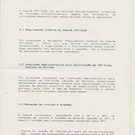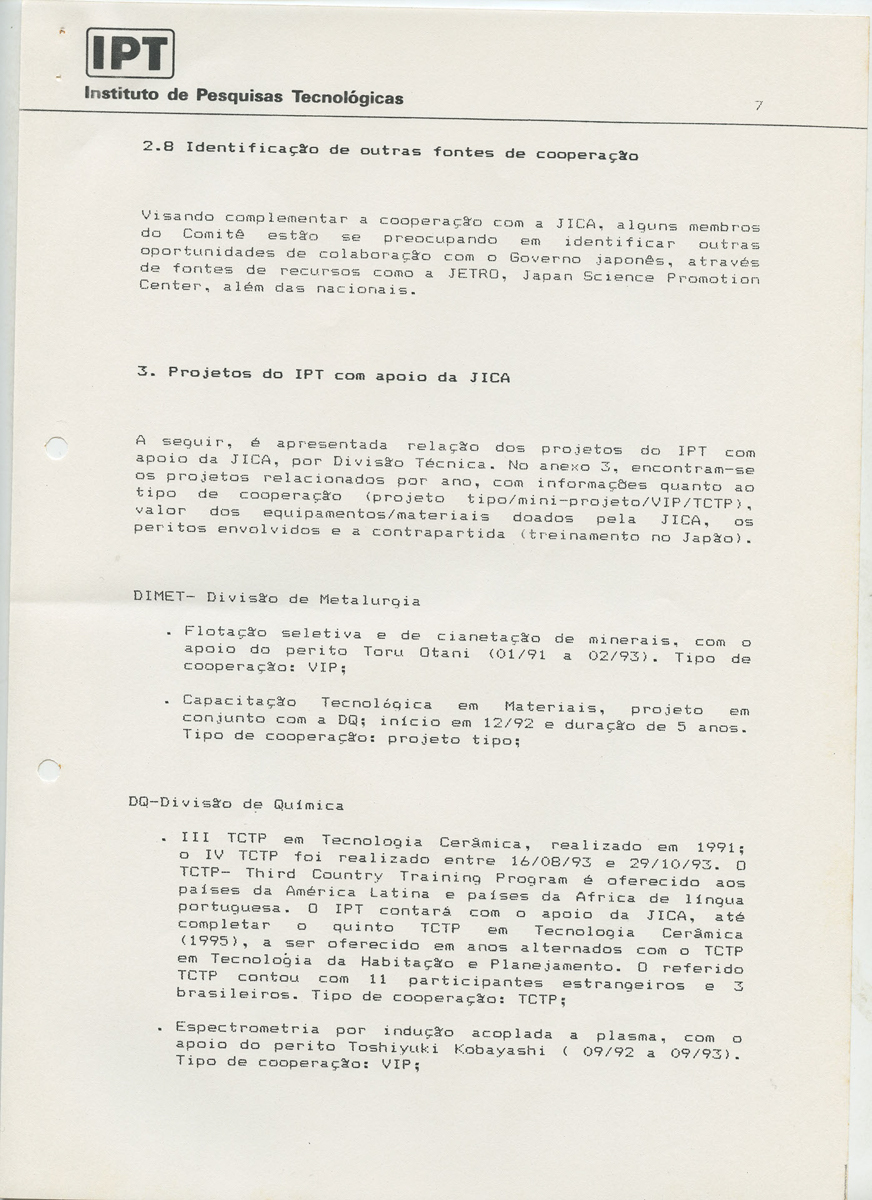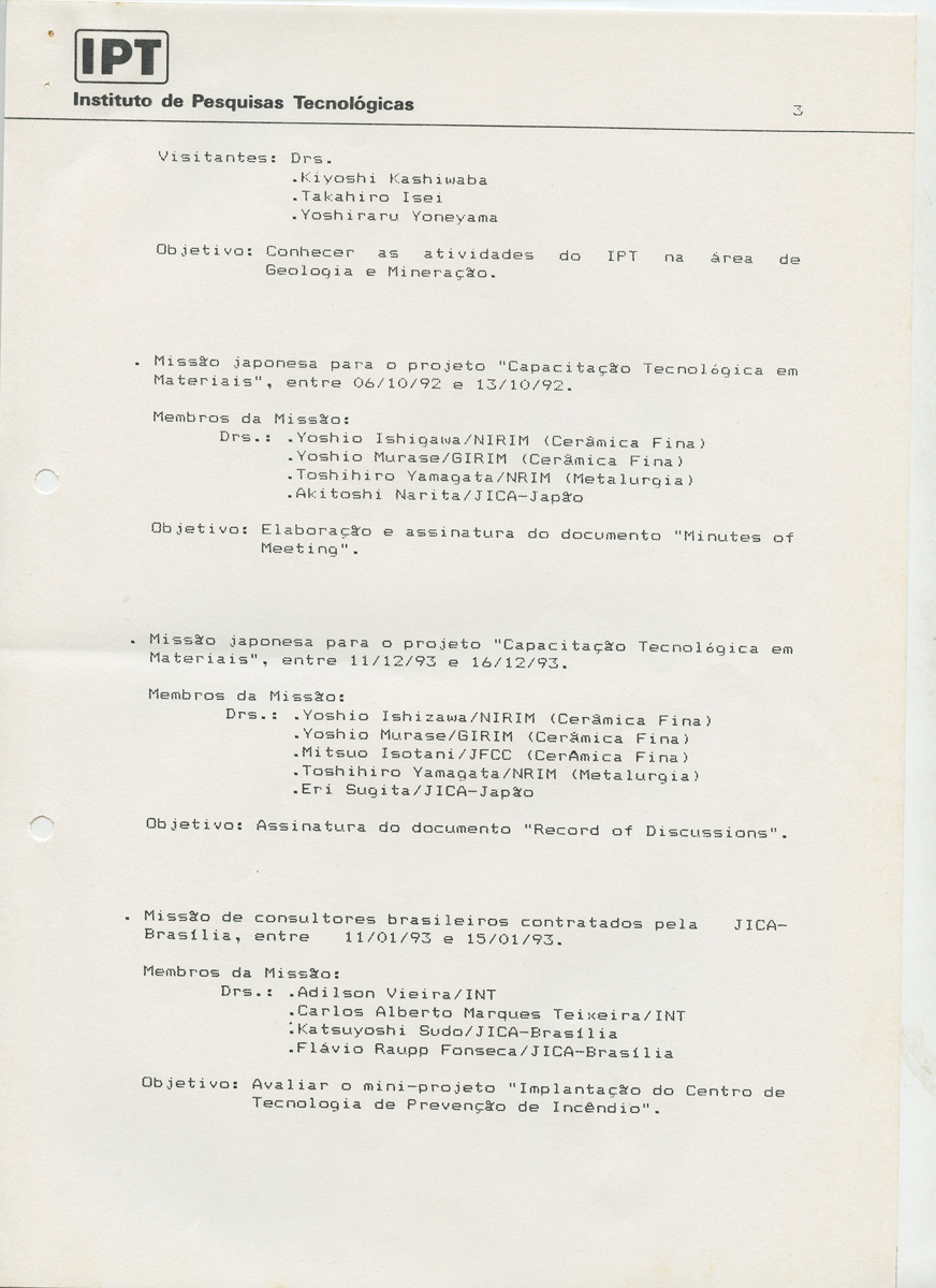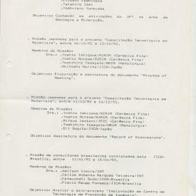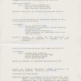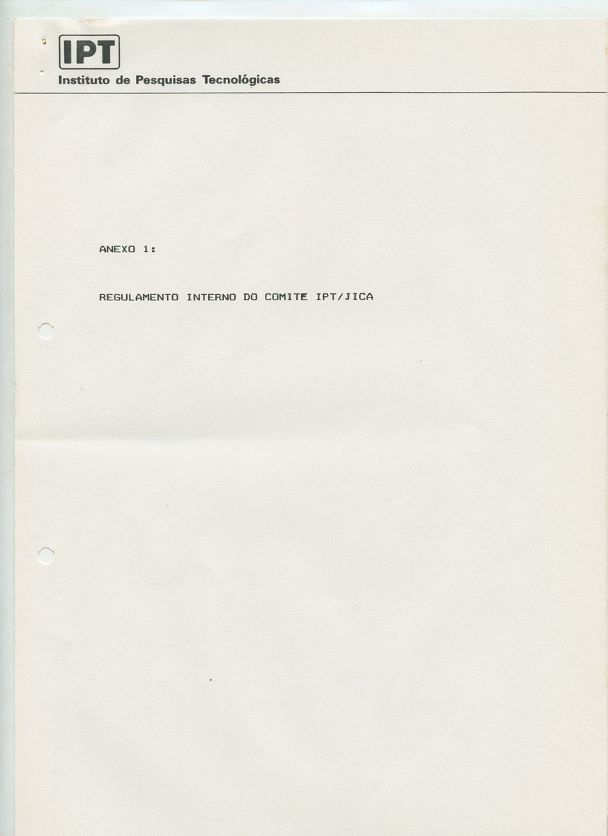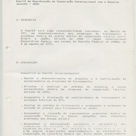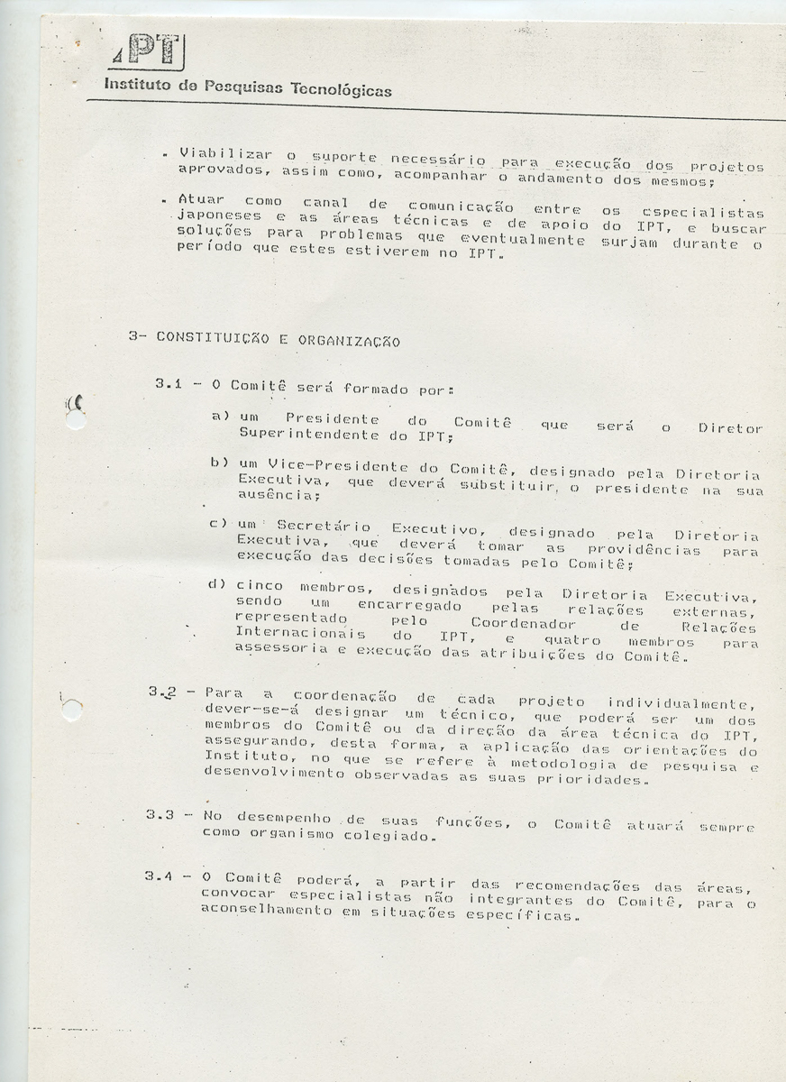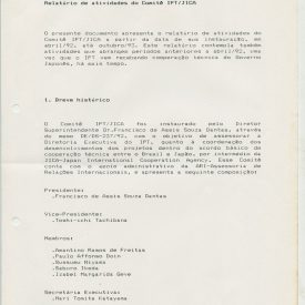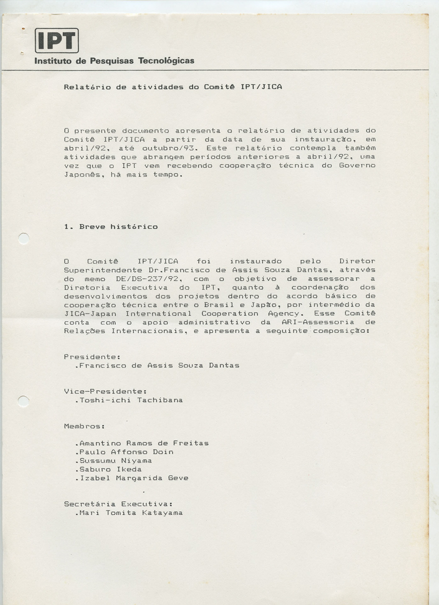 Correspondências do comitê da JICA (fax, cartas, memorandos, minutas, circular), atas de reuniões, relatórios de projetos e atividades desenvolvidas pelo comitê. Presidente/Diretor Superintendente: Fracisco de Assis Souza Dantas; Vice-Presidente/Coordenador da Divisão de Tecnologia de Transportes: Toshi-Ichi Tachibana; Secretária Executiva: Mari Tomita Katayama; Membros: Amantino Ramos de Freitas, Izabel Margarida Geve, Saburo Ikeda, Sussumo Niyama e Paulo Affonso Doin; Instruções normativas quanto a de recepção pelo IPT de um especialista técnico, enviado através da JICA, que não se encontrava vinculada a nenhum projeto custeado pela JICA; Roteiro da palestra para o simpósio Cooperação Técnica: um caminho para a harmonia da humanidade, palestra "Melhorias obtidas através de projetos para o desenvolvimento de tecnologias industriais e temas para futuras considerações"
