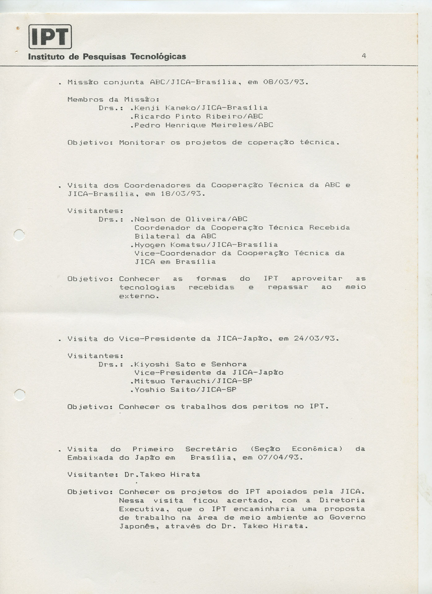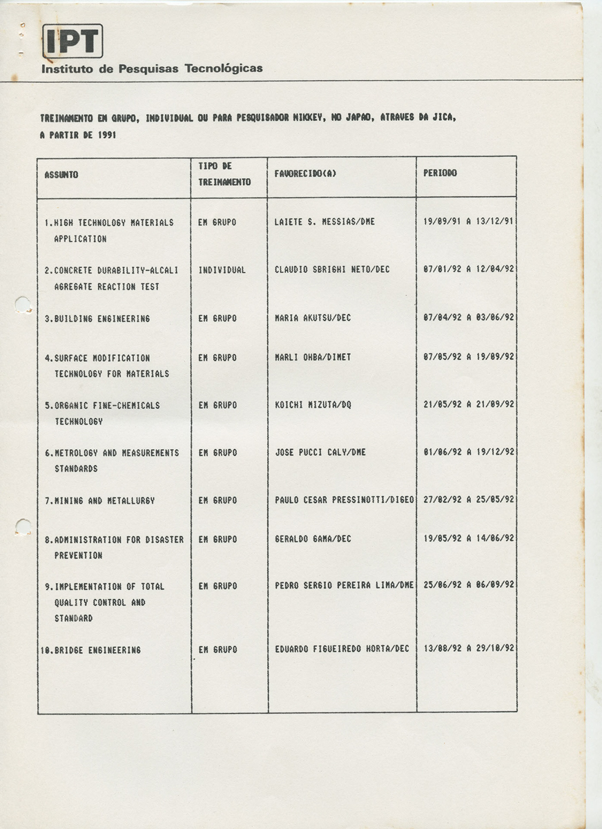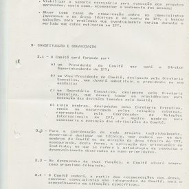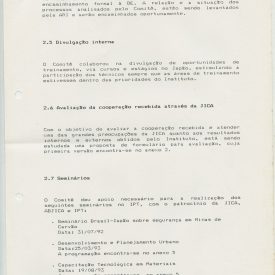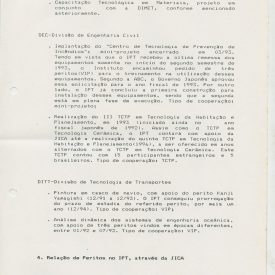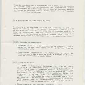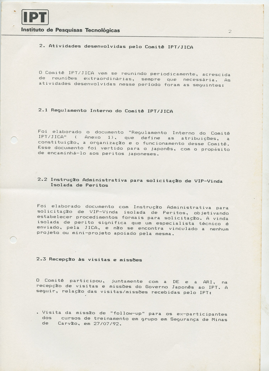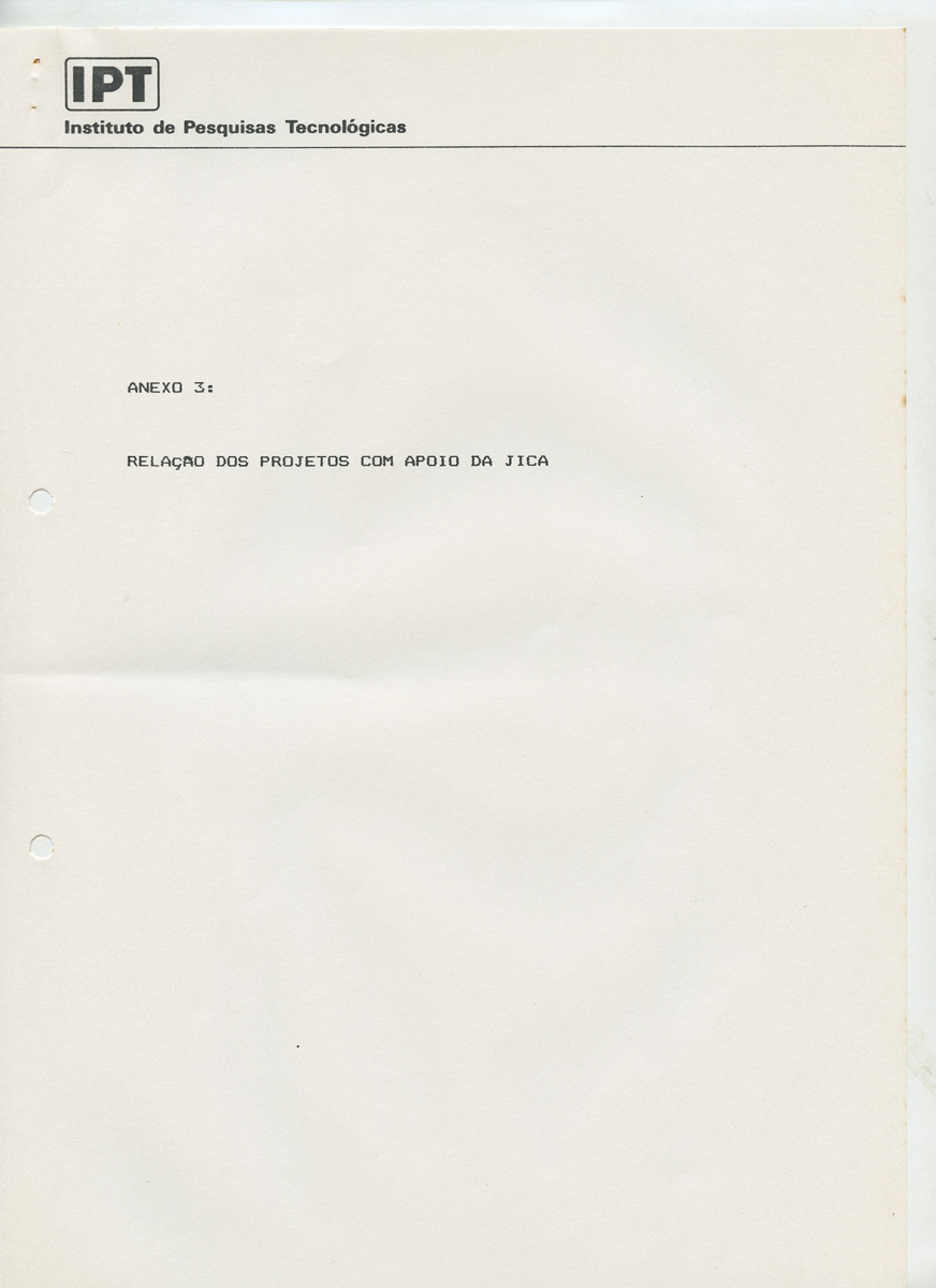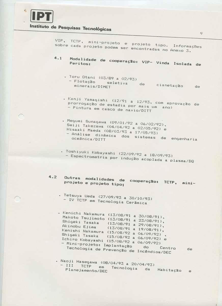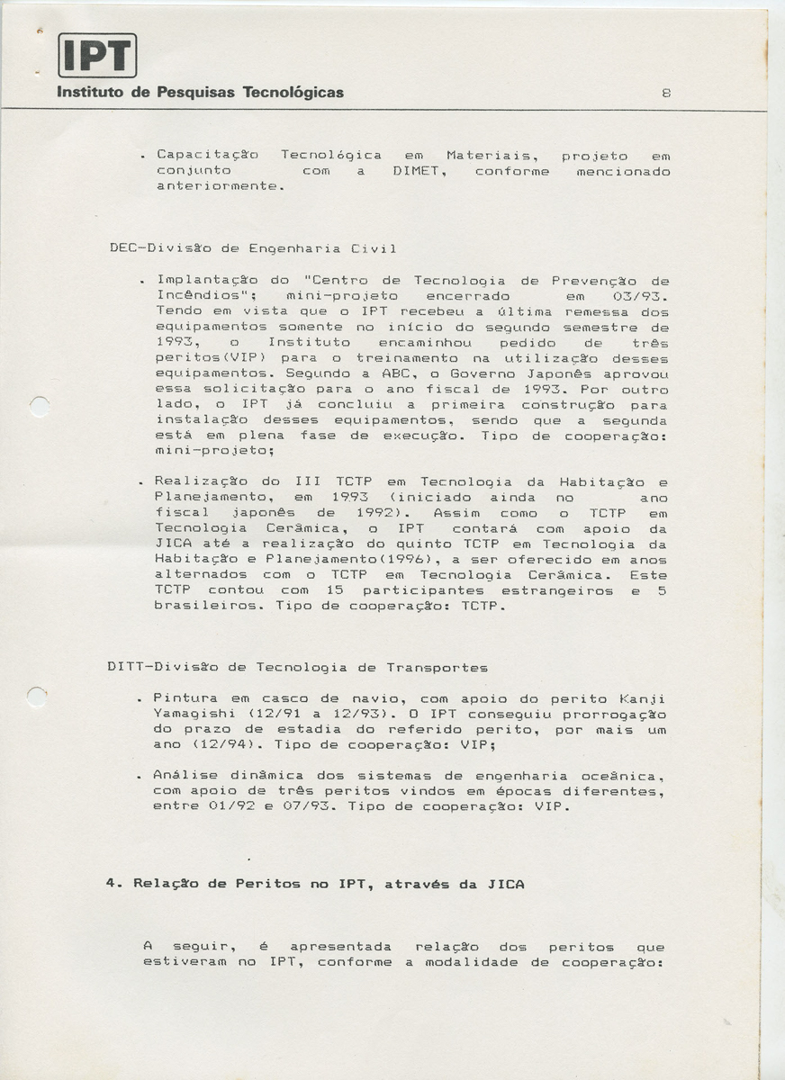 Correspondências do comitê da JICA (fax, cartas, memorandos, minutas, circular), atas de reuniões, relatórios de projetos e atividades desenvolvidas pelo comitê. Presidente/Diretor Superintendente: Fracisco de Assis Souza Dantas; Vice-Presidente/Coordenador da Divisão de Tecnologia de Transportes: Toshi-Ichi Tachibana; Secretária Executiva: Mari Tomita Katayama; Membros: Amantino Ramos de Freitas, Izabel Margarida Geve, Saburo Ikeda, Sussumo Niyama e Paulo Affonso Doin; Instruções normativas quanto a de recepção pelo IPT de um especialista técnico, enviado através da JICA, que não se encontrava vinculada a nenhum projeto custeado pela JICA; Roteiro da palestra para o simpósio Cooperação Técnica: um caminho para a harmonia da humanidade, palestra "Melhorias obtidas através de projetos para o desenvolvimento de tecnologias industriais e temas para futuras considerações"