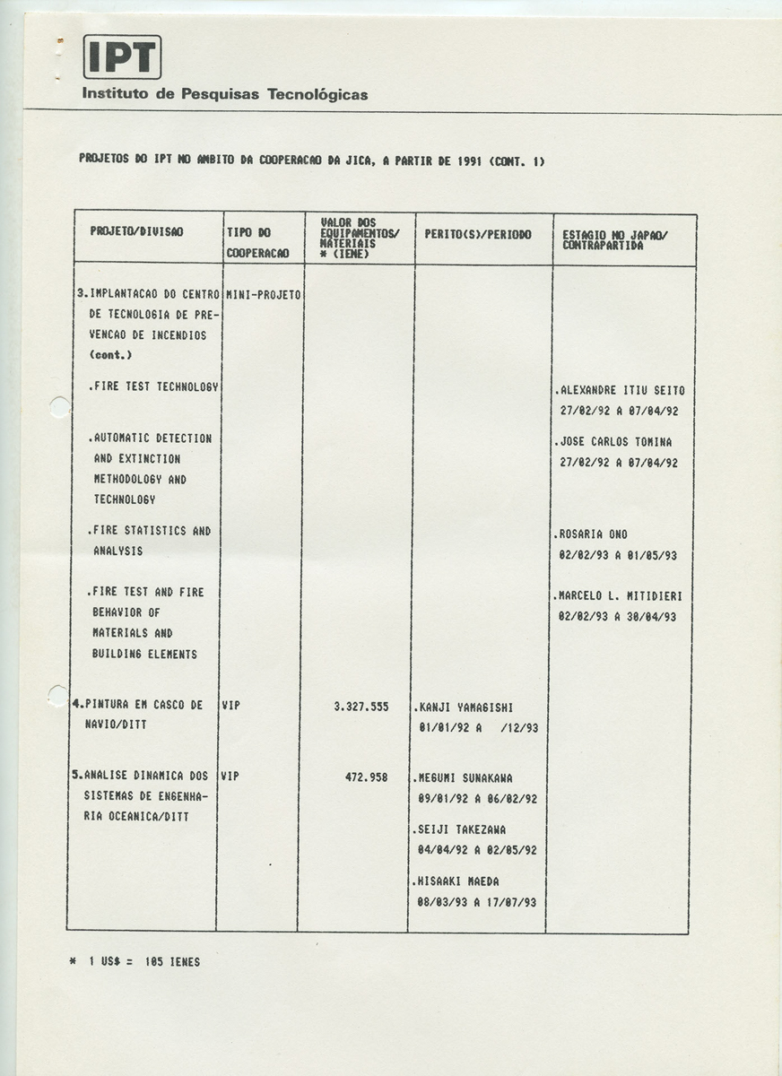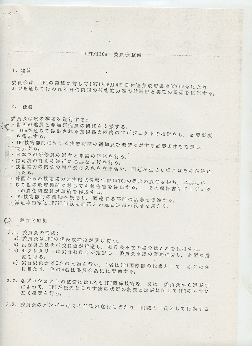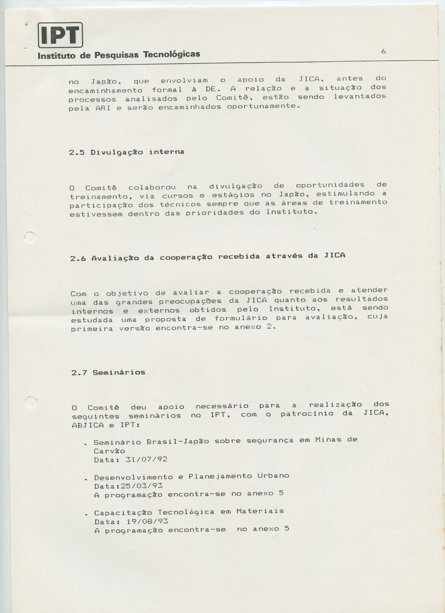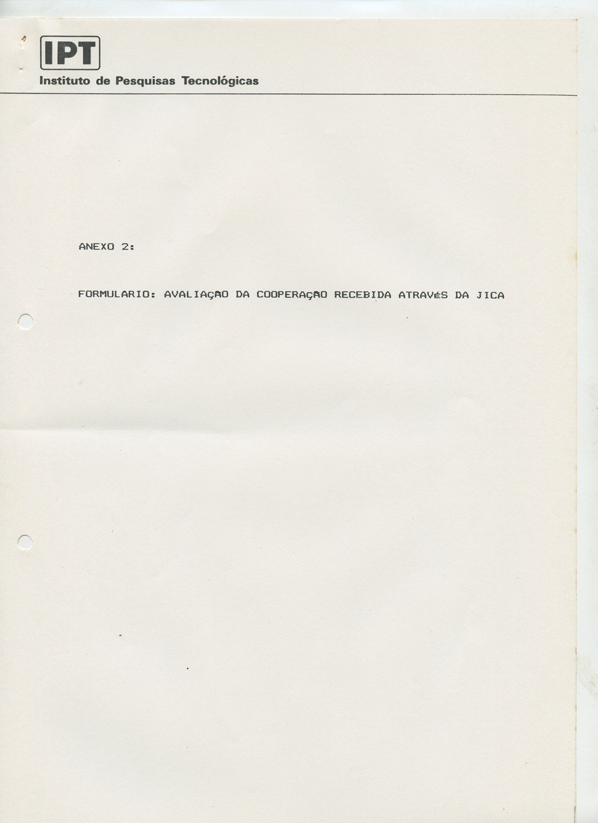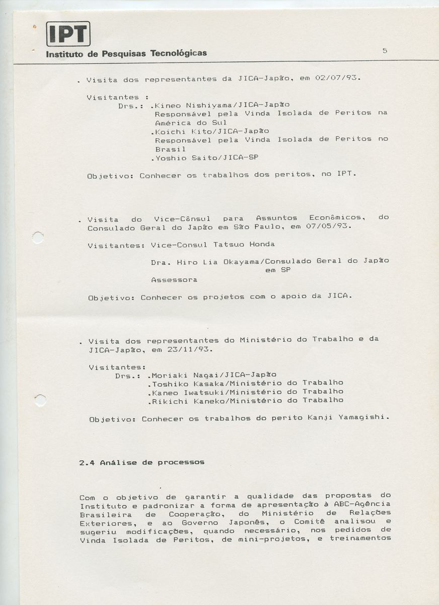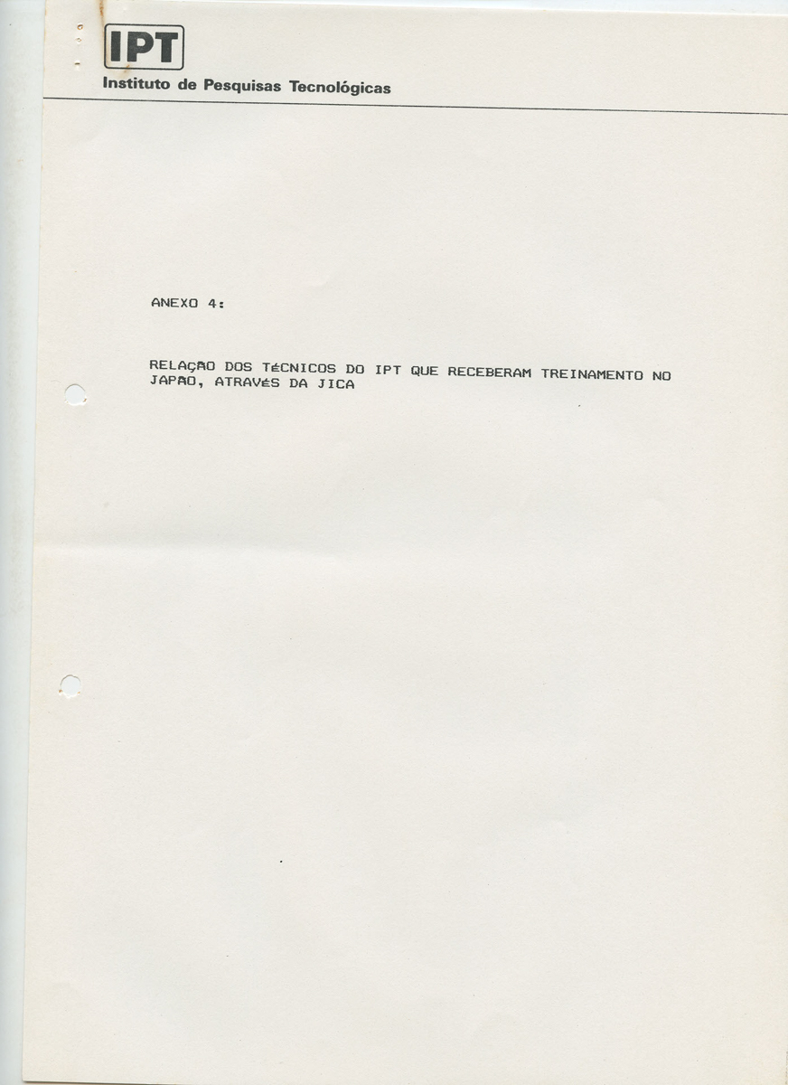 Correspondências do comitê da JICA (fax, cartas, memorandos, minutas, circular), atas de reuniões, relatórios de projetos e atividades desenvolvidas pelo comitê. Presidente/Diretor Superintendente: Fracisco de Assis Souza Dantas; Vice-Presidente/Coordenador da Divisão de Tecnologia de Transportes: Toshi-Ichi Tachibana; Secretária Executiva: Mari Tomita Katayama; Membros: Amantino Ramos de Freitas, Izabel Margarida Geve, Saburo Ikeda, Sussumo Niyama e Paulo Affonso Doin; Instruções normativas quanto a de recepção pelo IPT de um especialista técnico, enviado através da JICA, que não se encontrava vinculada a nenhum projeto custeado pela JICA; Roteiro da palestra para o simpósio Cooperação Técnica: um caminho para a harmonia da humanidade, palestra "Melhorias obtidas através de projetos para o desenvolvimento de tecnologias industriais e temas para futuras considerações"