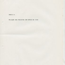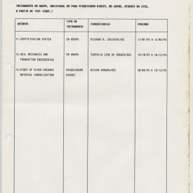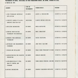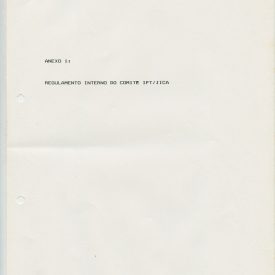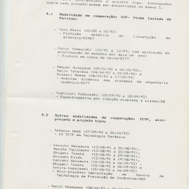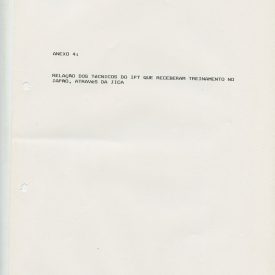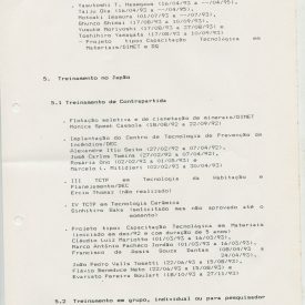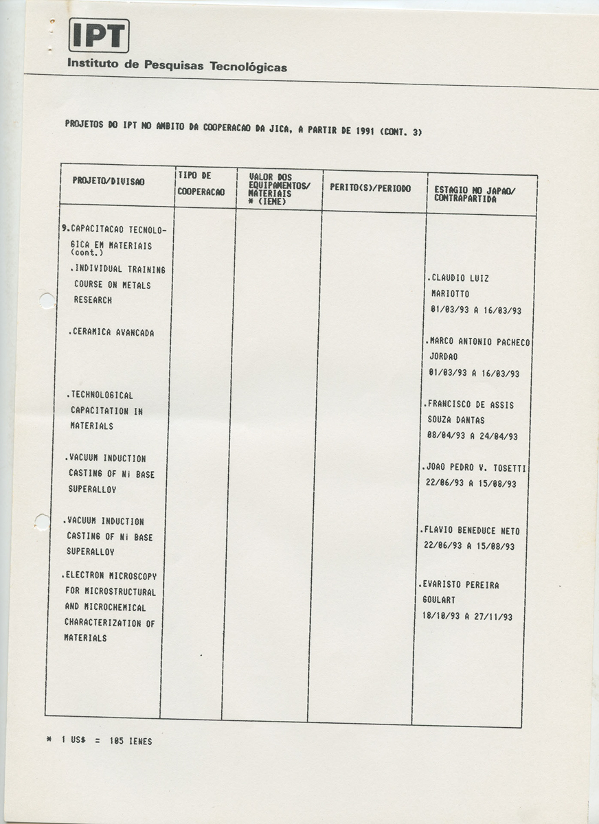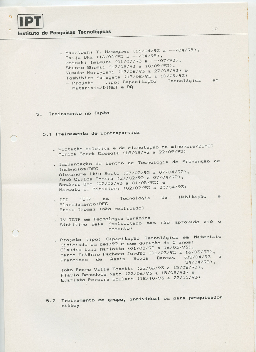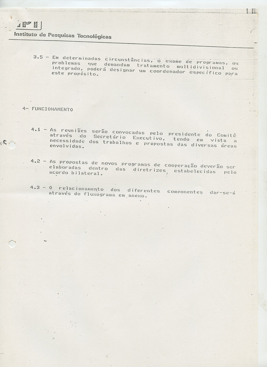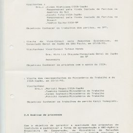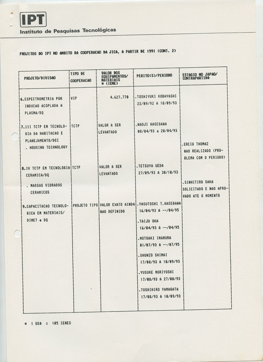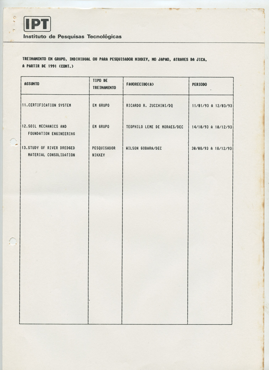 Correspondências do comitê da JICA (fax, cartas, memorandos, minutas, circular), atas de reuniões, relatórios de projetos e atividades desenvolvidas pelo comitê. Presidente/Diretor Superintendente: Fracisco de Assis Souza Dantas; Vice-Presidente/Coordenador da Divisão de Tecnologia de Transportes: Toshi-Ichi Tachibana; Secretária Executiva: Mari Tomita Katayama; Membros: Amantino Ramos de Freitas, Izabel Margarida Geve, Saburo Ikeda, Sussumo Niyama e Paulo Affonso Doin; Instruções normativas quanto a de recepção pelo IPT de um especialista técnico, enviado através da JICA, que não se encontrava vinculada a nenhum projeto custeado pela JICA; Roteiro da palestra para o simpósio Cooperação Técnica: um caminho para a harmonia da humanidade, palestra "Melhorias obtidas através de projetos para o desenvolvimento de tecnologias industriais e temas para futuras considerações"