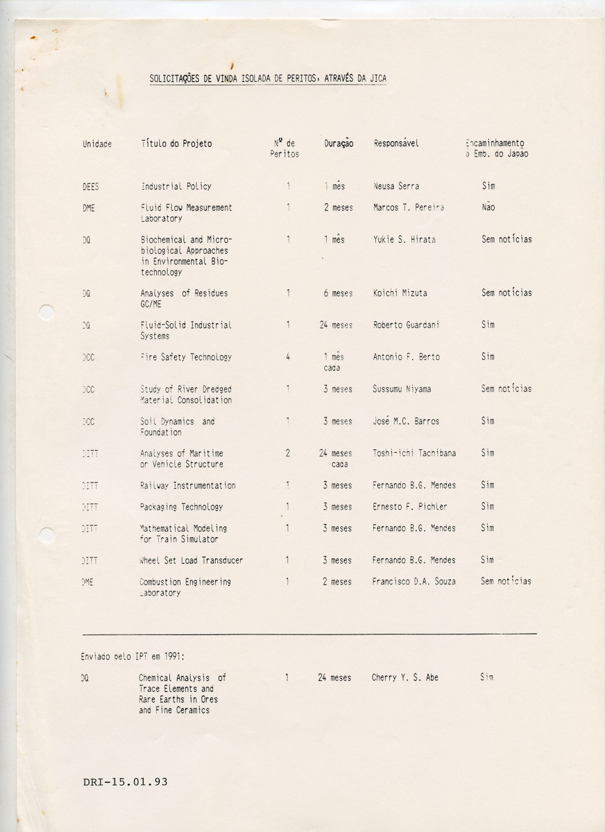Correspondências do comitê da JICA (fax, cartas, memorandos, minutas, circular), atas de reuniões, relatórios de projetos e atividades desenvolvidas pelo comitê. Presidente/Diretor Superintendente: Fracisco de Assis Souza Dantas; Vice-Presidente/Coordenador da Divisão de Tecnologia de Transportes: Toshi-Ichi Tachibana; Secretária Executiva: Mari Tomita Katayama; Membros: Amantino Ramos de Freitas, Izabel Margarida Geve, Saburo Ikeda, Sussumo Niyama e Paulo Affonso Doin; Instruções normativas quanto a de recepção pelo IPT de um especialista técnico, enviado através da JICA, que não se encontrava vinculada a nenhum projeto custeado pela JICA; Roteiro da palestra para o simpósio Cooperação Técnica: um caminho para a harmonia da humanidade, palestra "Melhorias obtidas através de projetos para o desenvolvimento de tecnologias industriais e temas para futuras considerações"