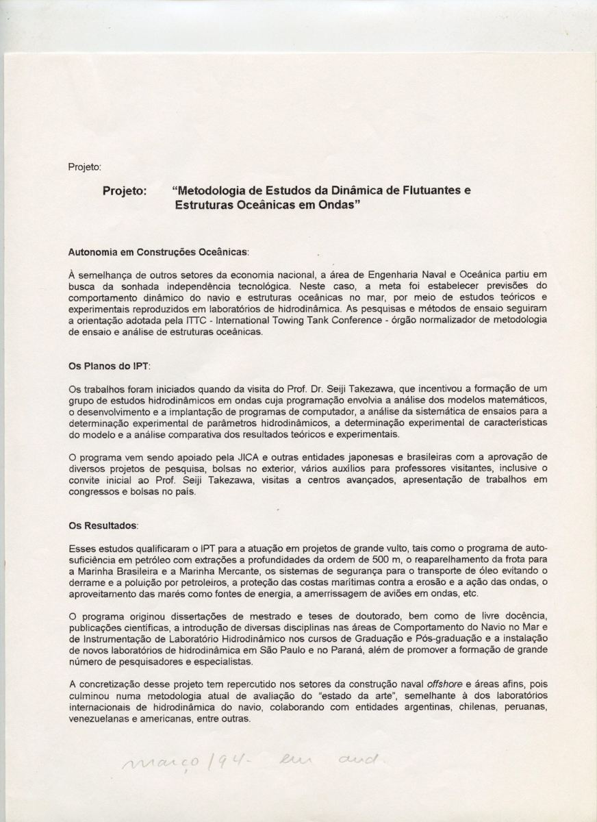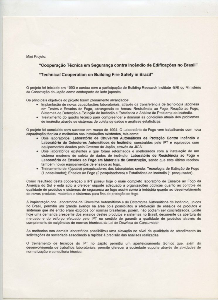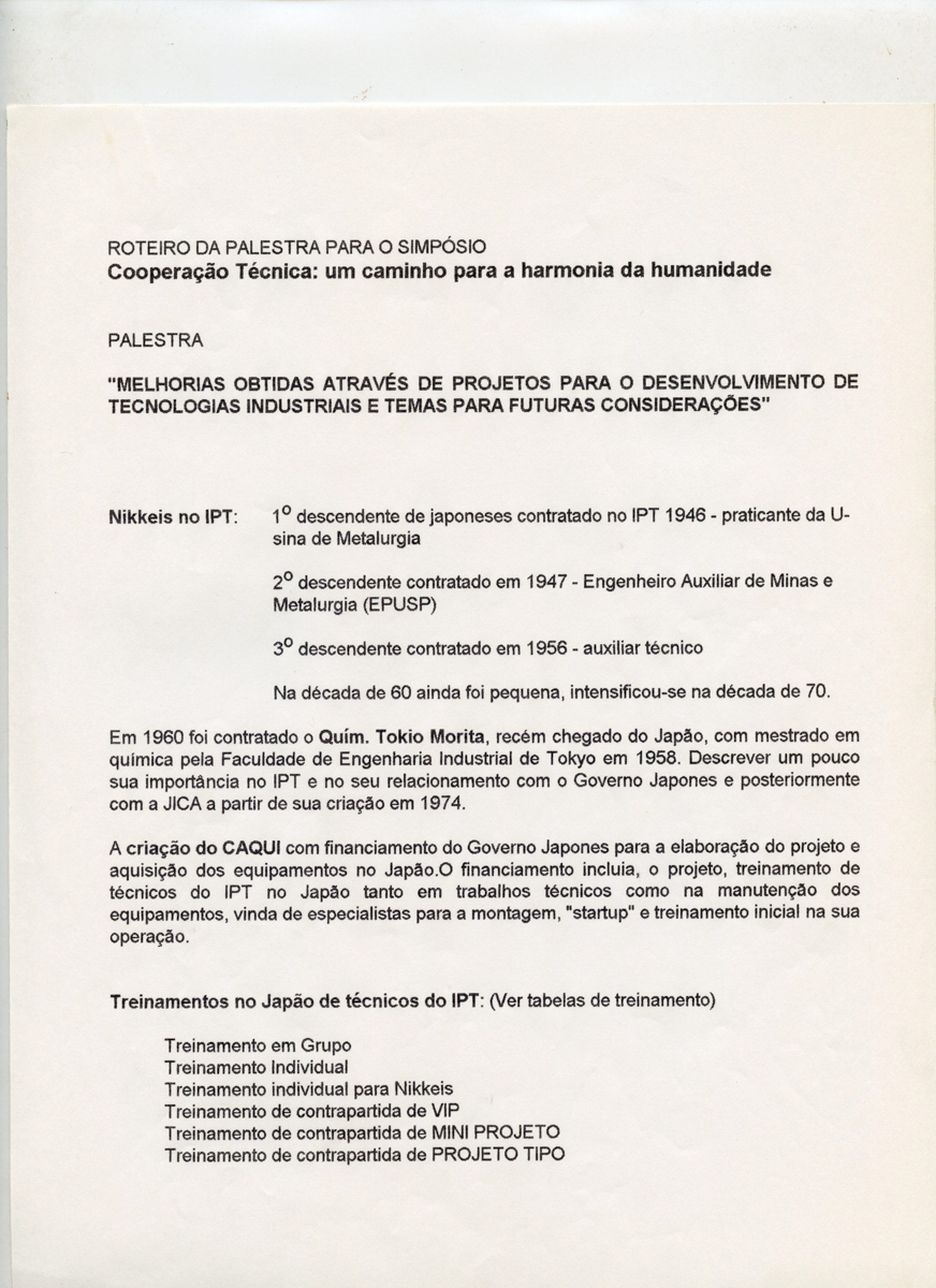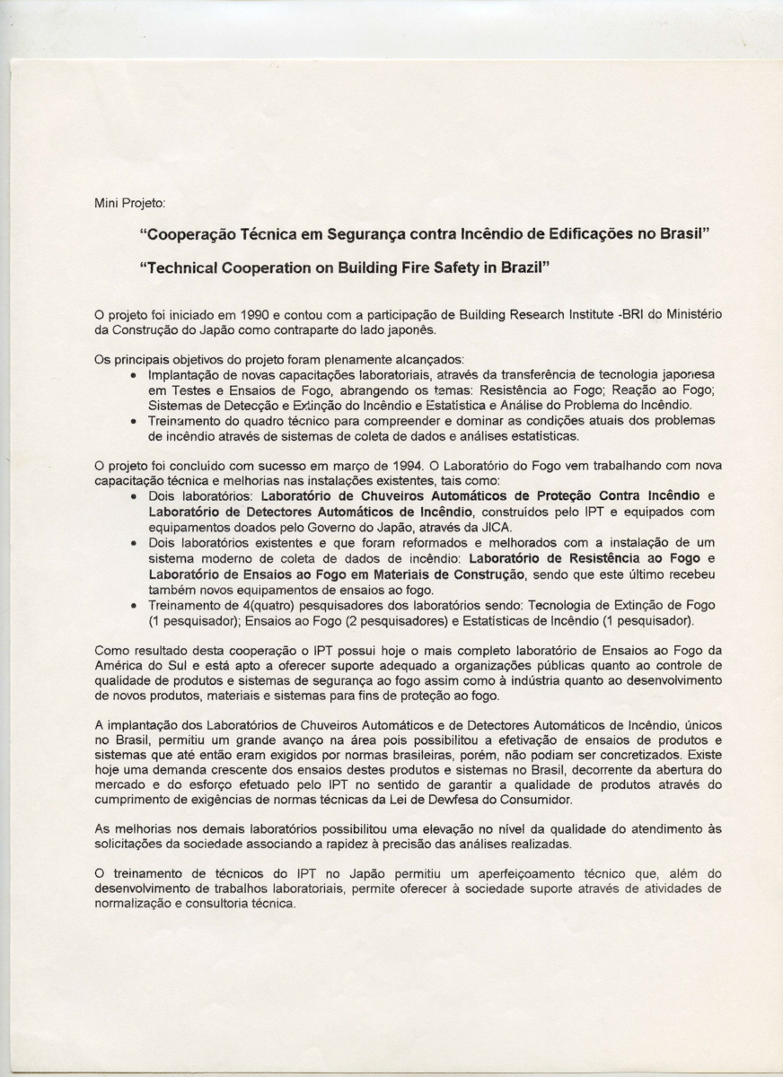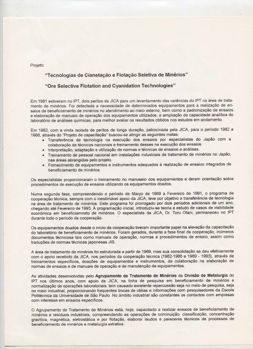 Correspondências do comitê da JICA (fax, cartas, memorandos, minutas, circular), atas de reuniões, relatórios de projetos e atividades desenvolvidas pelo comitê. Presidente/Diretor Superintendente: Fracisco de Assis Souza Dantas; Vice-Presidente/Coordenador da Divisão de Tecnologia de Transportes: Toshi-Ichi Tachibana; Secretária Executiva: Mari Tomita Katayama; Membros: Amantino Ramos de Freitas, Izabel Margarida Geve, Saburo Ikeda, Sussumo Niyama e Paulo Affonso Doin; Instruções normativas quanto a de recepção pelo IPT de um especialista técnico, enviado através da JICA, que não se encontrava vinculada a nenhum projeto custeado pela JICA; Roteiro da palestra para o simpósio Cooperação Técnica: um caminho para a harmonia da humanidade, palestra "Melhorias obtidas através de projetos para o desenvolvimento de tecnologias industriais e temas para futuras considerações"