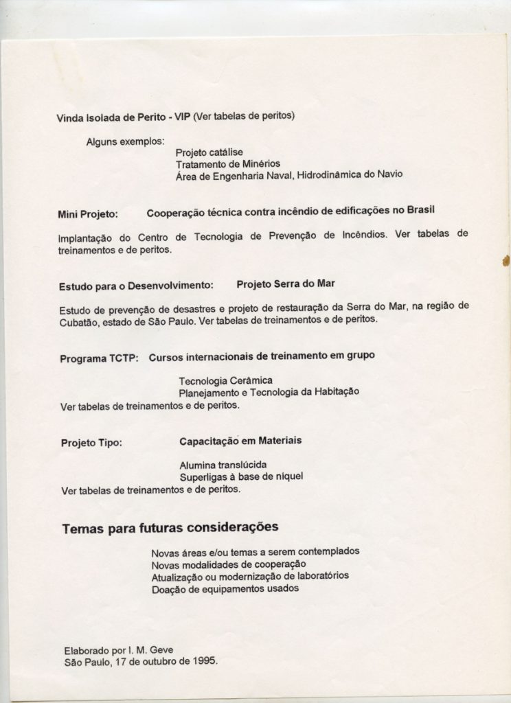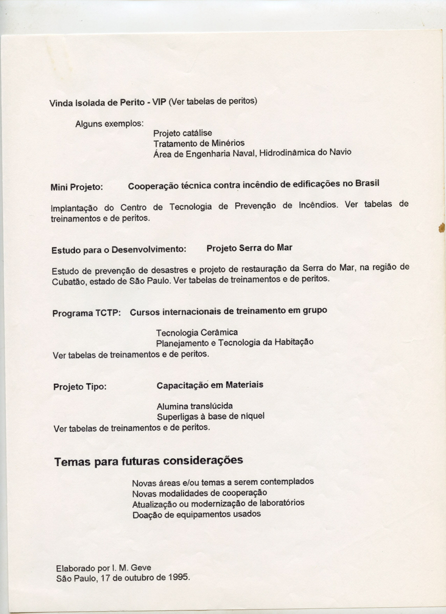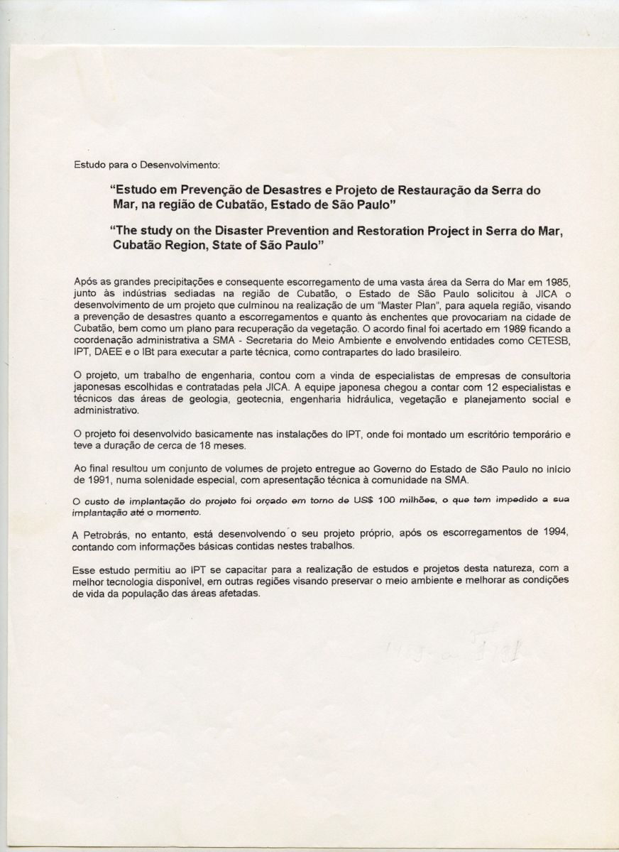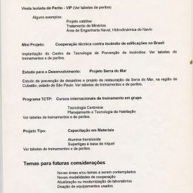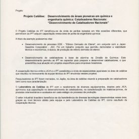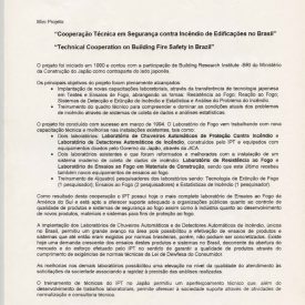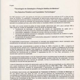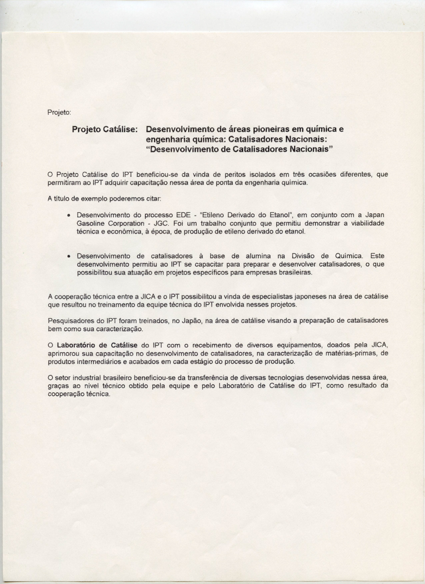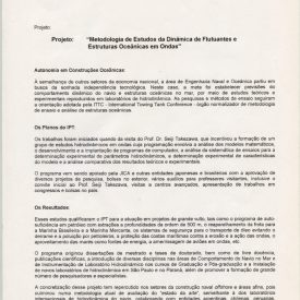 Correspondências do comitê da JICA (fax, cartas, memorandos, minutas, circular), atas de reuniões, relatórios de projetos e atividades desenvolvidas pelo comitê. Presidente/Diretor Superintendente: Fracisco de Assis Souza Dantas; Vice-Presidente/Coordenador da Divisão de Tecnologia de Transportes: Toshi-Ichi Tachibana; Secretária Executiva: Mari Tomita Katayama; Membros: Amantino Ramos de Freitas, Izabel Margarida Geve, Saburo Ikeda, Sussumo Niyama e Paulo Affonso Doin; Instruções normativas quanto a de recepção pelo IPT de um especialista técnico, enviado através da JICA, que não se encontrava vinculada a nenhum projeto custeado pela JICA; Roteiro da palestra para o simpósio Cooperação Técnica: um caminho para a harmonia da humanidade, palestra "Melhorias obtidas através de projetos para o desenvolvimento de tecnologias industriais e temas para futuras considerações"