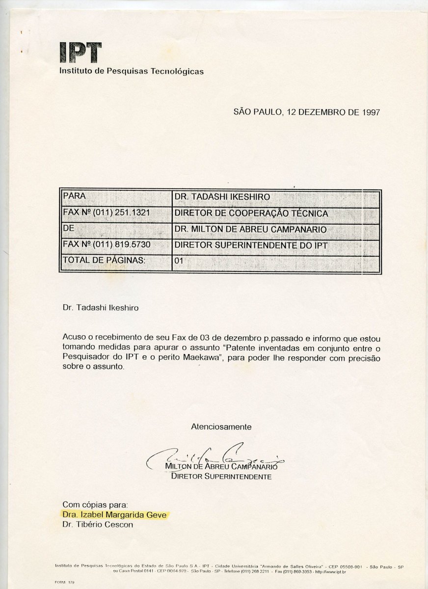Correspondências do comitê da JICA (fax, cartas, memorandos, minutas, circular), atas de reuniões, relatórios de projetos e atividades desenvolvidas pelo comitê. Presidente/Diretor Superintendente: Fracisco de Assis Souza Dantas; Vice-Presidente/Coordenador da Divisão de Tecnologia de Transportes: Toshi-Ichi Tachibana; Secretária Executiva: Mari Tomita Katayama; Membros: Amantino Ramos de Freitas, Izabel Margarida Geve, Saburo Ikeda, Sussumo Niyama e Paulo Affonso Doin; Instruções normativas quanto a de recepção pelo IPT de um especialista técnico, enviado através da JICA, que não se encontrava vinculada a nenhum projeto custeado pela JICA; Roteiro da palestra para o simpósio Cooperação Técnica: um caminho para a harmonia da humanidade, palestra "Melhorias obtidas através de projetos para o desenvolvimento de tecnologias industriais e temas para futuras considerações"