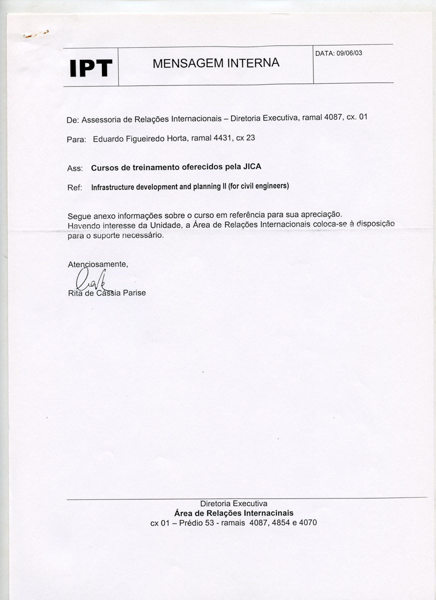 01.001.0041.0086_28129 Baixar 01.001.0041.0086_28229 Baixar 01.001.0041.0086_28129 01.001.0041.0086_28229 Número de registro01.001.0041.0086Conjunto de itens Conteúdo Correspondências eletrônicas referente aos cursos da JICA, entre os anos de 2003 à 2005 Grupo Memória Institucional Subgrupo Memória da ciência Data __/__/2003 - __/__/2005 Quantidade de documentos 30 documentos, 117 folhas Procedência ARI - Assessoria de Relações Internacionais Item anterior01.001.0041.0085 Próximo item01.001.0041.0087