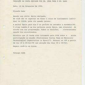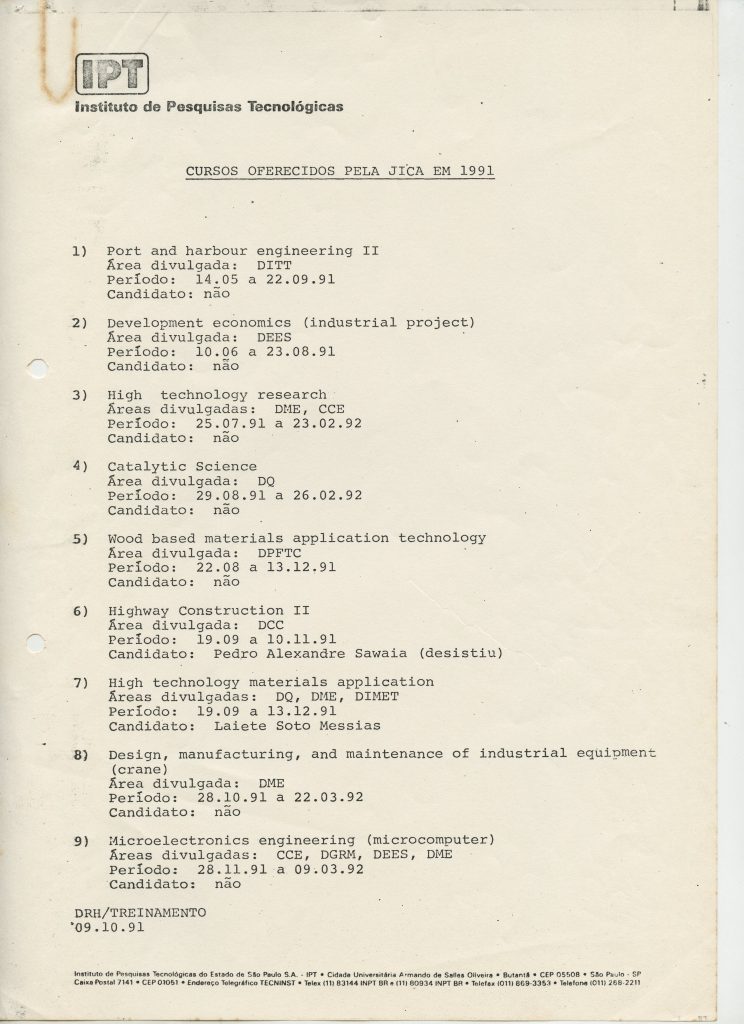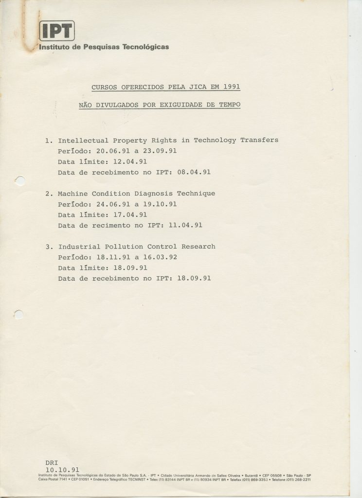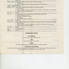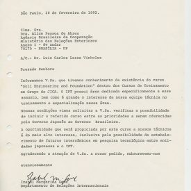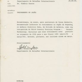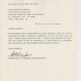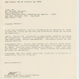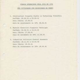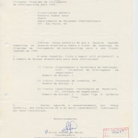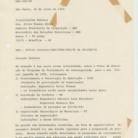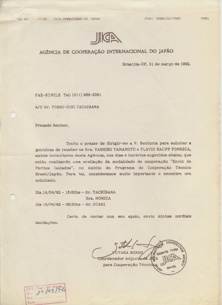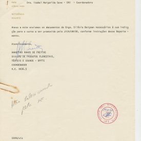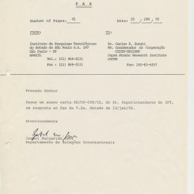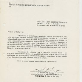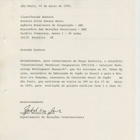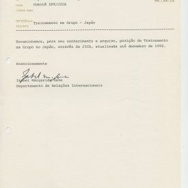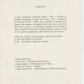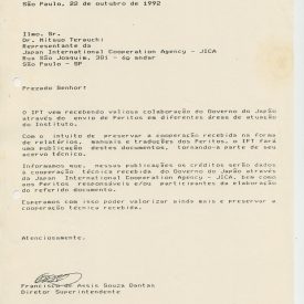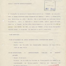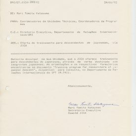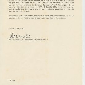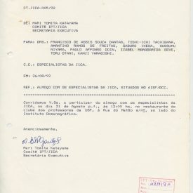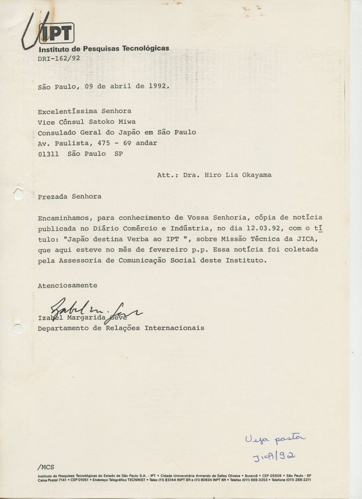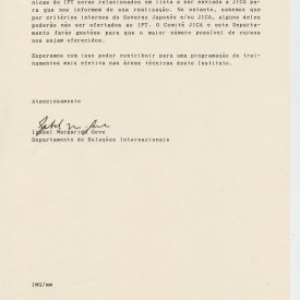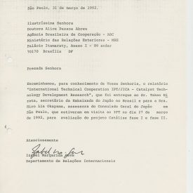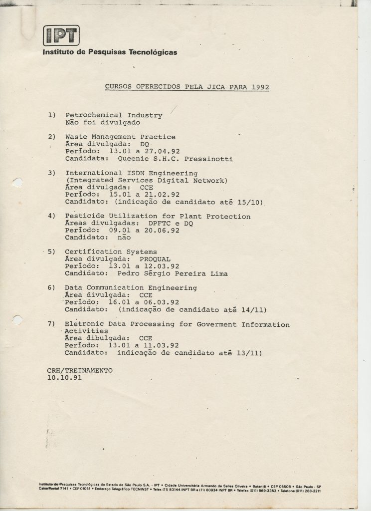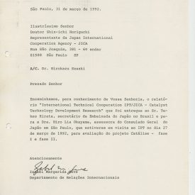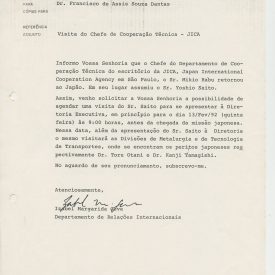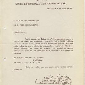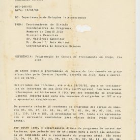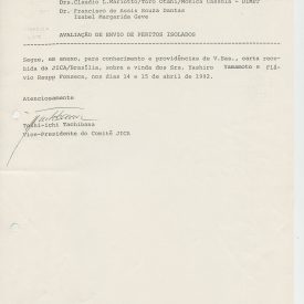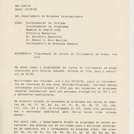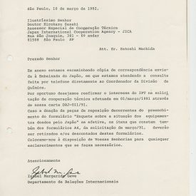 Correspondências gerais da JICA (fax, cartas, memorandos) sobre o comitê, seminários, cursos, relatórios, treinamentos e avaliações. Documentos sem relação e de assuntos diversos: bilhete solicitando doação a empresa Asahi Chemical Industry Co. Ltd., requisição de desembaraço aduaneiro de materiais e equipamentos, bilhete contendo telefone e endereço do Conselheiro Rubens de Souza Sarmento, folheto da campanha do agasalho, cópia de cartão de visita, e cartão de sugestão.