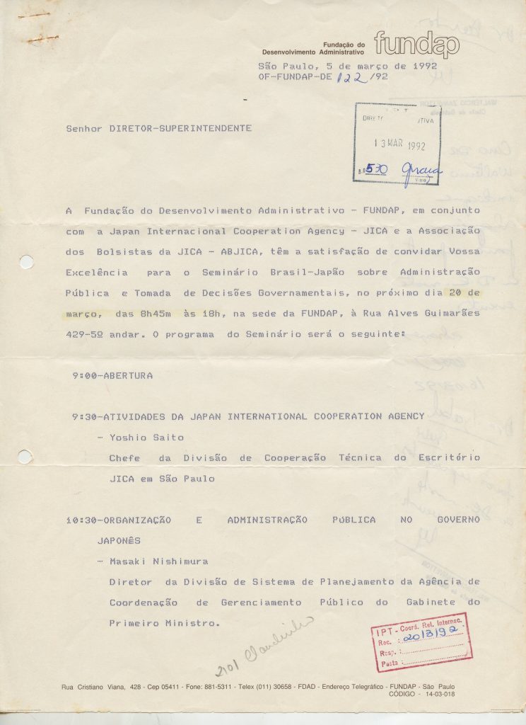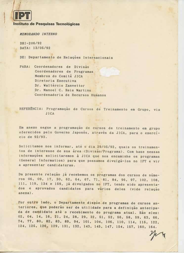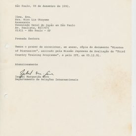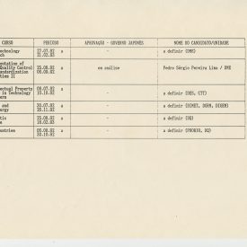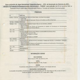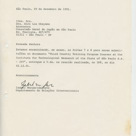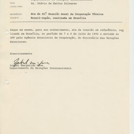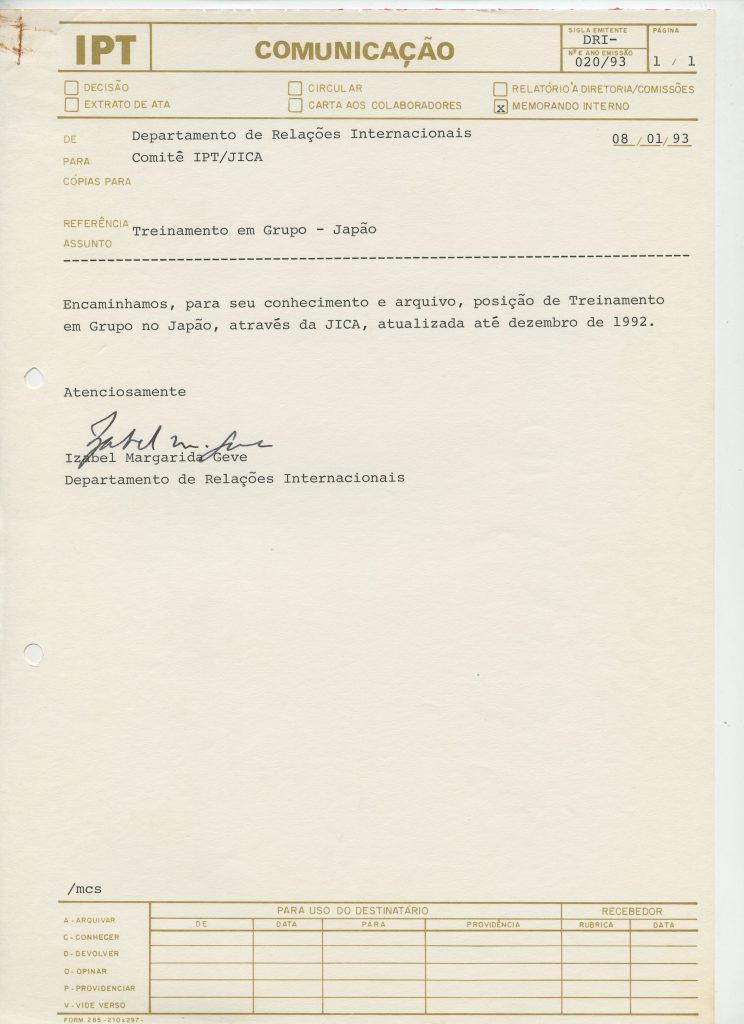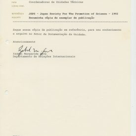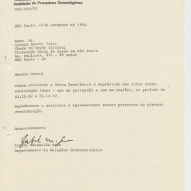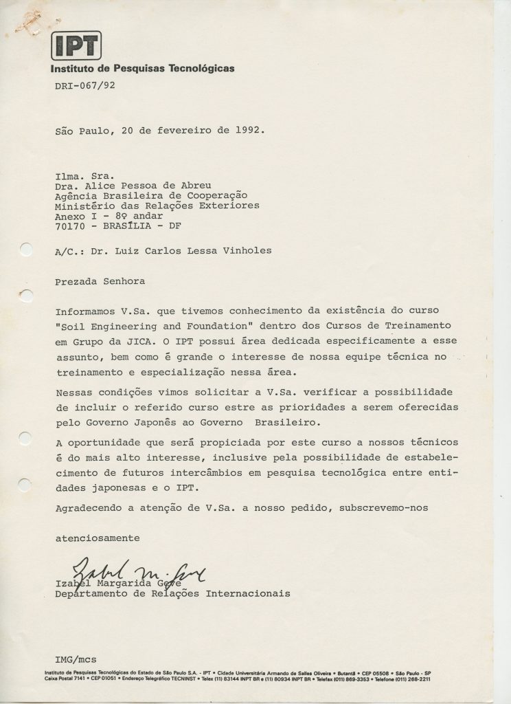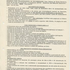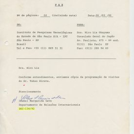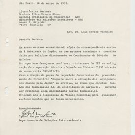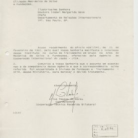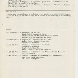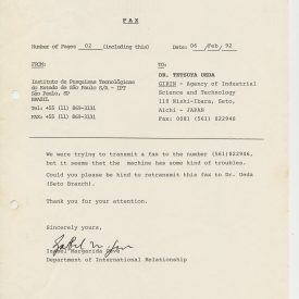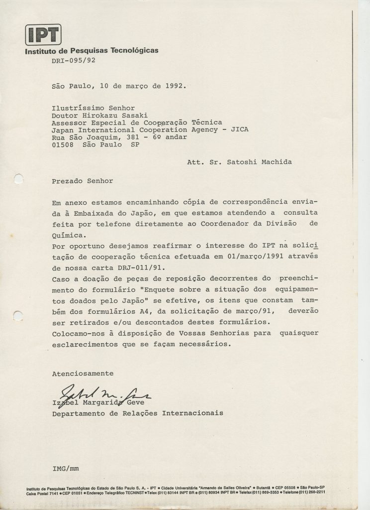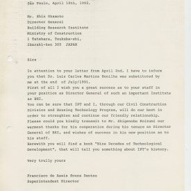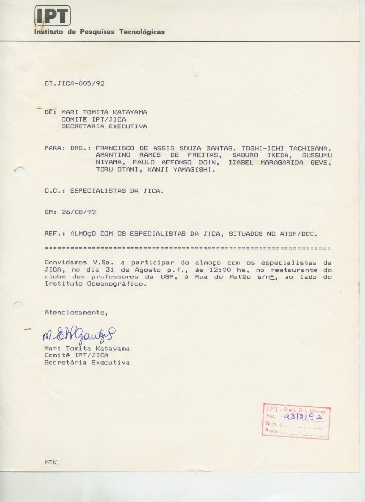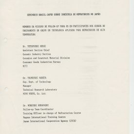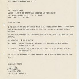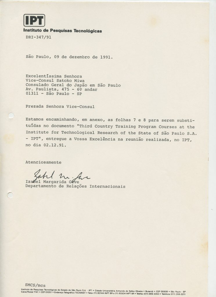 Correspondências gerais da JICA (fax, cartas, memorandos) sobre o comitê, seminários, cursos, relatórios, treinamentos e avaliações. Documentos sem relação e de assuntos diversos: bilhete solicitando doação a empresa Asahi Chemical Industry Co. Ltd., requisição de desembaraço aduaneiro de materiais e equipamentos, bilhete contendo telefone e endereço do Conselheiro Rubens de Souza Sarmento, folheto da campanha do agasalho, cópia de cartão de visita, e cartão de sugestão.