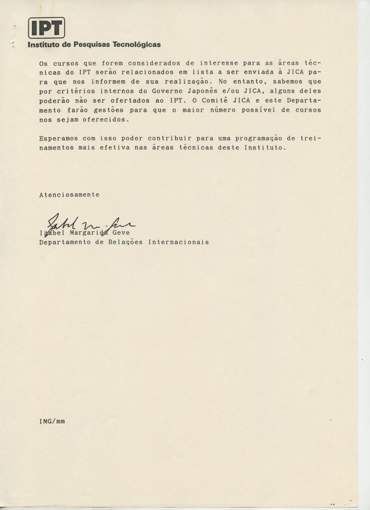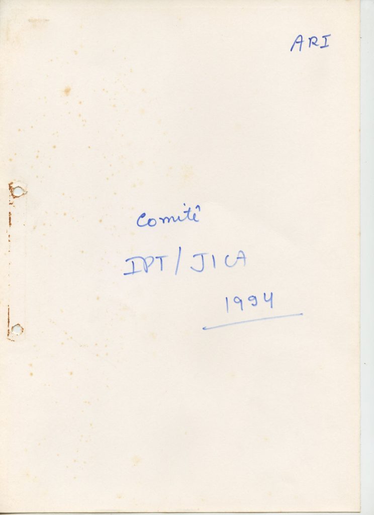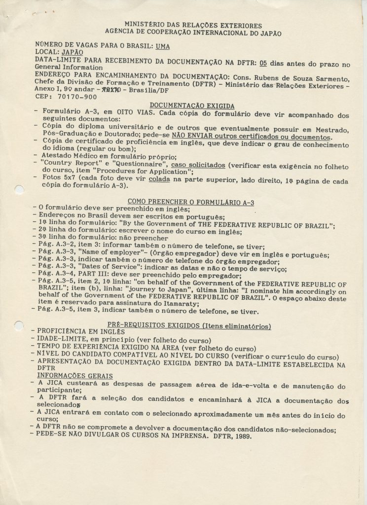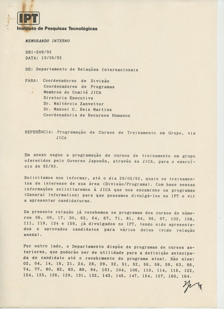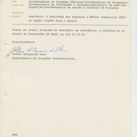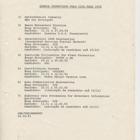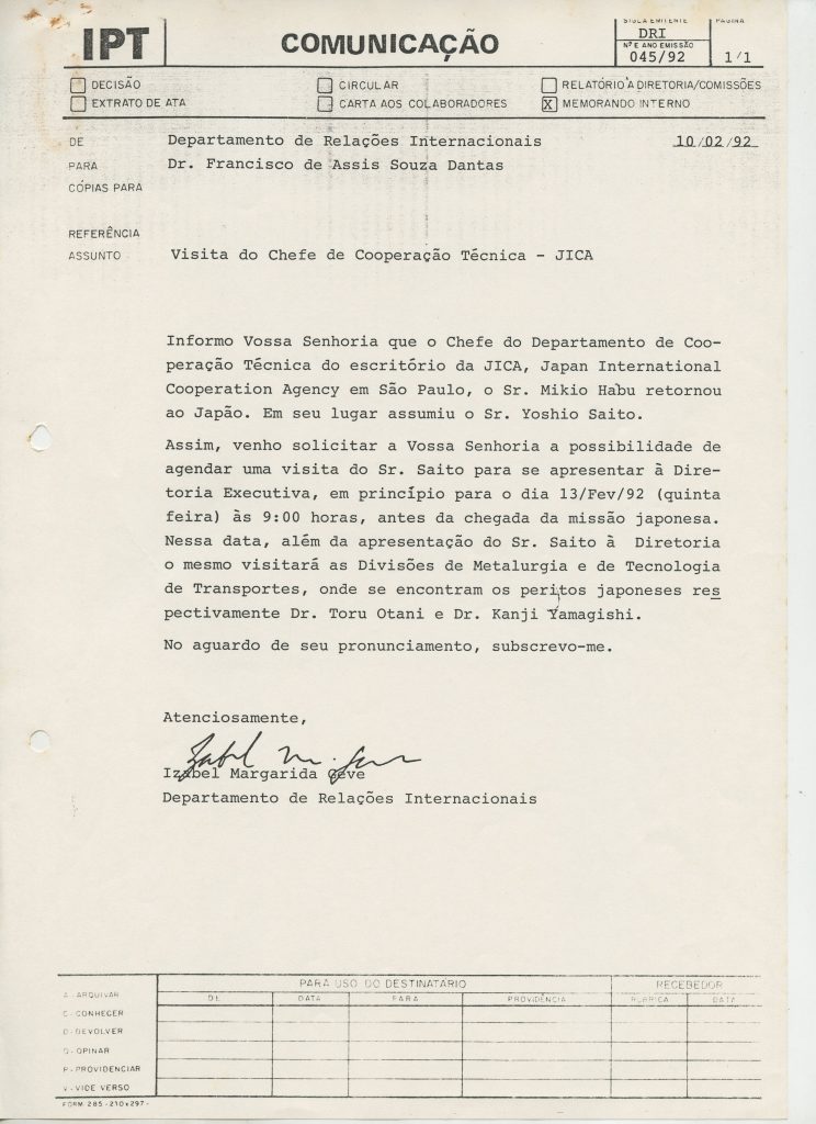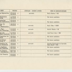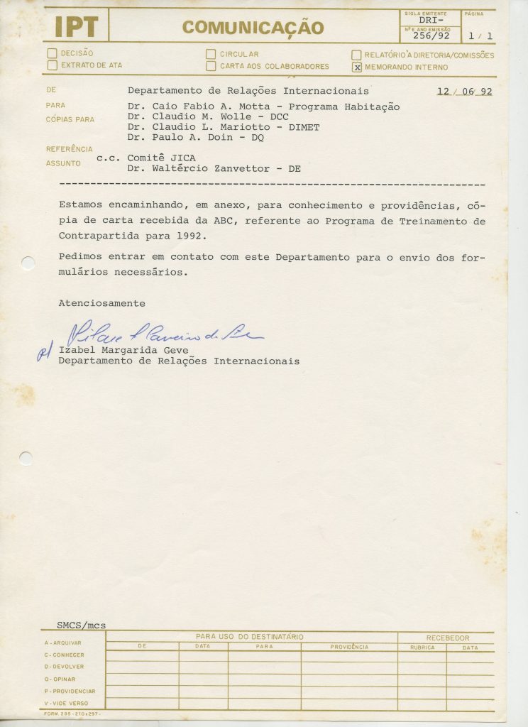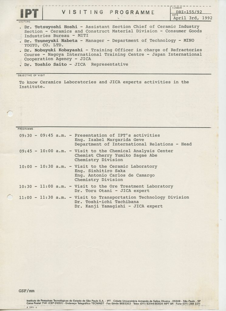 Correspondências gerais da JICA (fax, cartas, memorandos) sobre o comitê, seminários, cursos, relatórios, treinamentos e avaliações. Documentos sem relação e de assuntos diversos: bilhete solicitando doação a empresa Asahi Chemical Industry Co. Ltd., requisição de desembaraço aduaneiro de materiais e equipamentos, bilhete contendo telefone e endereço do Conselheiro Rubens de Souza Sarmento, folheto da campanha do agasalho, cópia de cartão de visita, e cartão de sugestão.