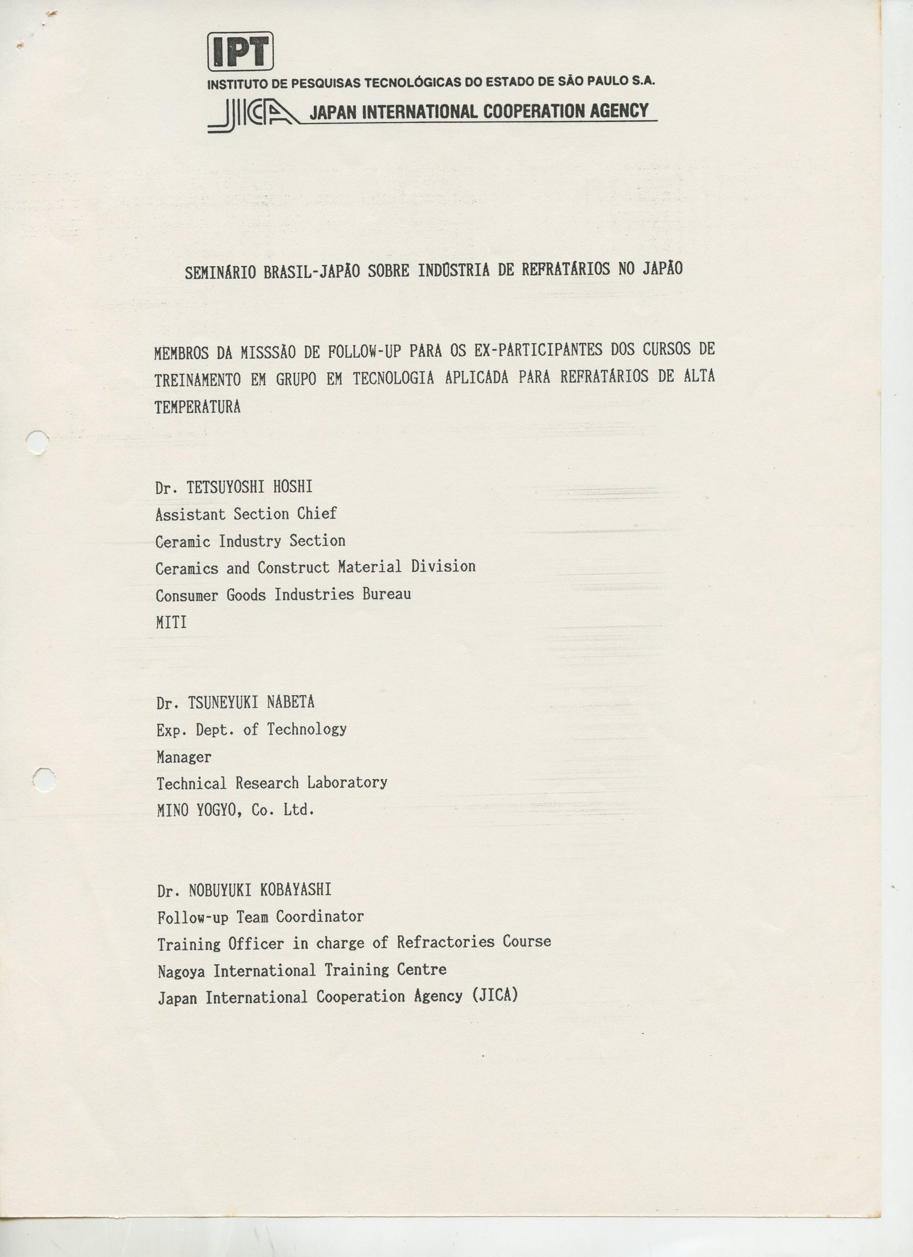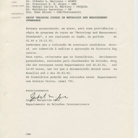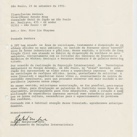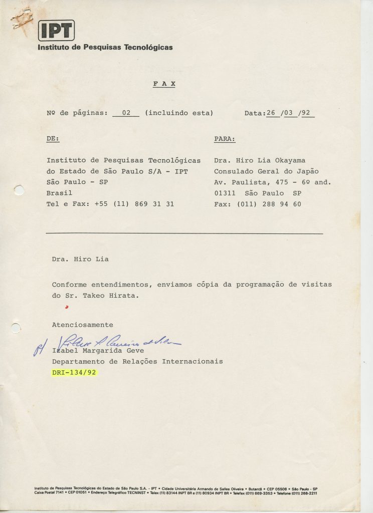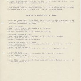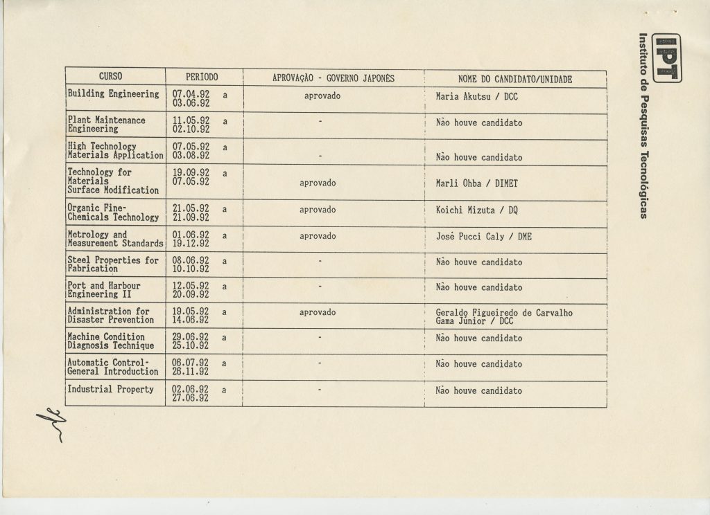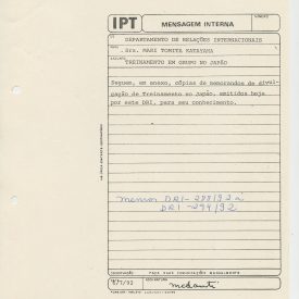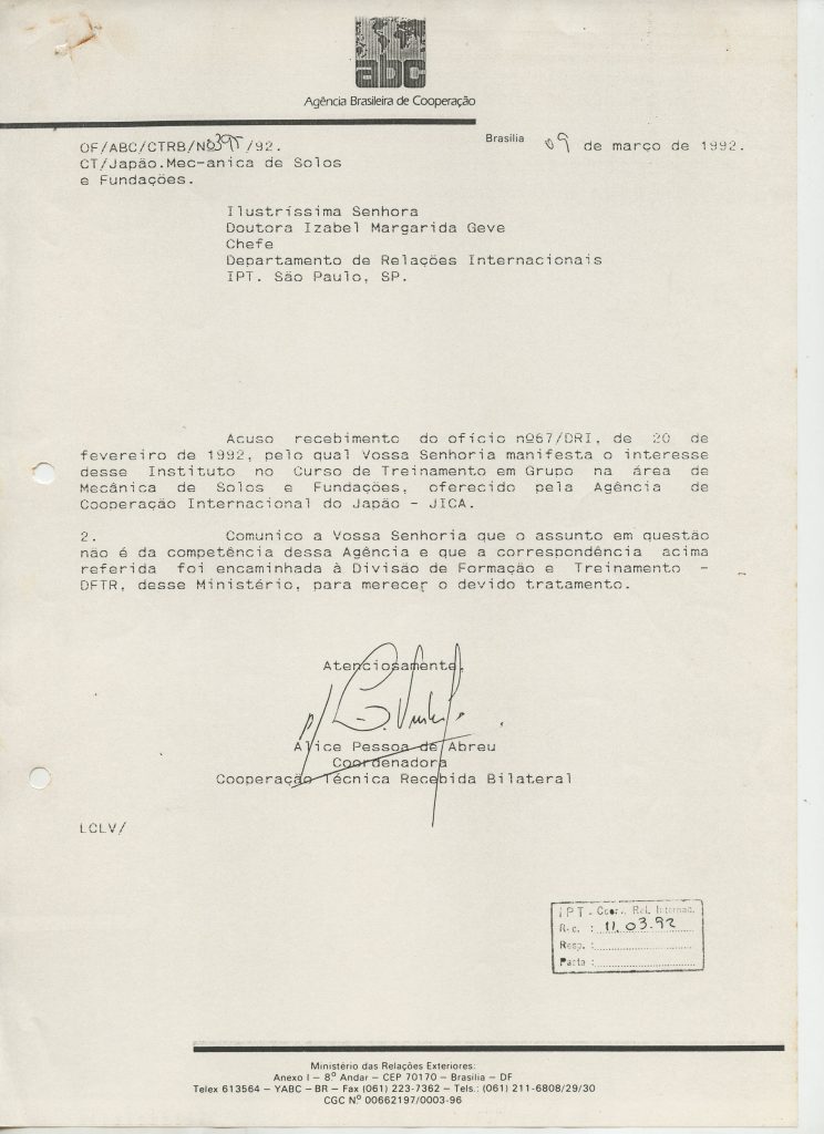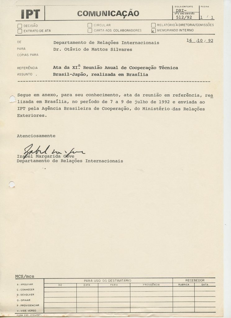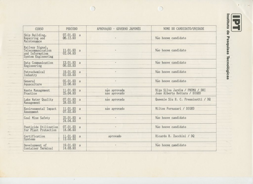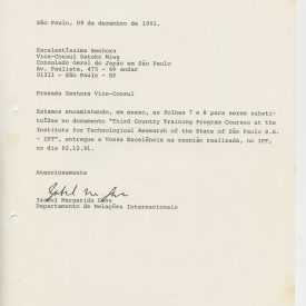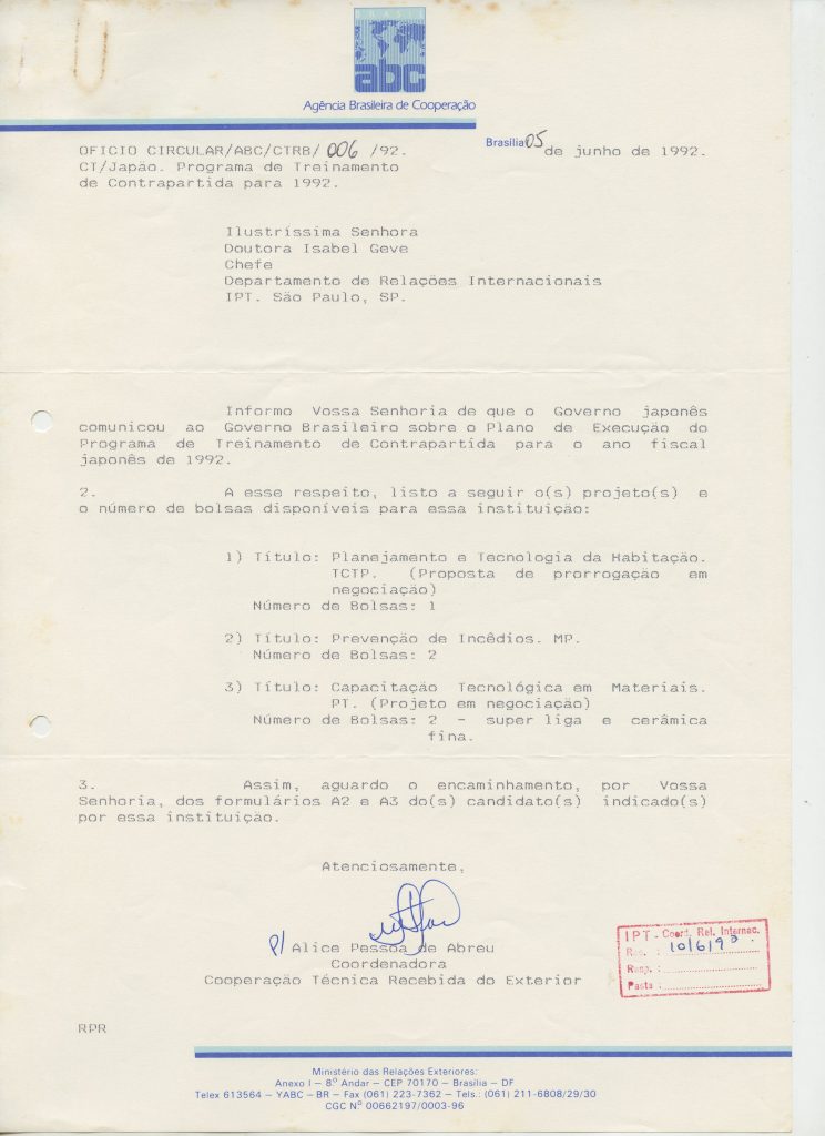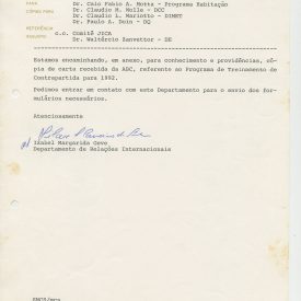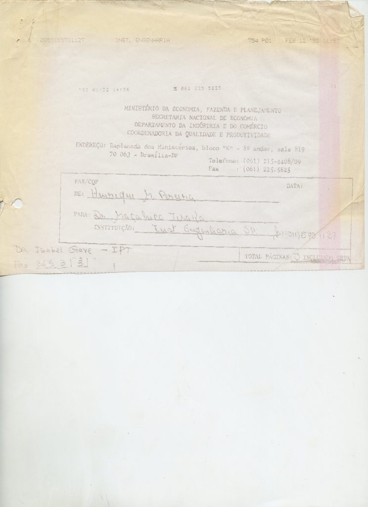 Correspondências gerais da JICA (fax, cartas, memorandos) sobre o comitê, seminários, cursos, relatórios, treinamentos e avaliações. Documentos sem relação e de assuntos diversos: bilhete solicitando doação a empresa Asahi Chemical Industry Co. Ltd., requisição de desembaraço aduaneiro de materiais e equipamentos, bilhete contendo telefone e endereço do Conselheiro Rubens de Souza Sarmento, folheto da campanha do agasalho, cópia de cartão de visita, e cartão de sugestão.