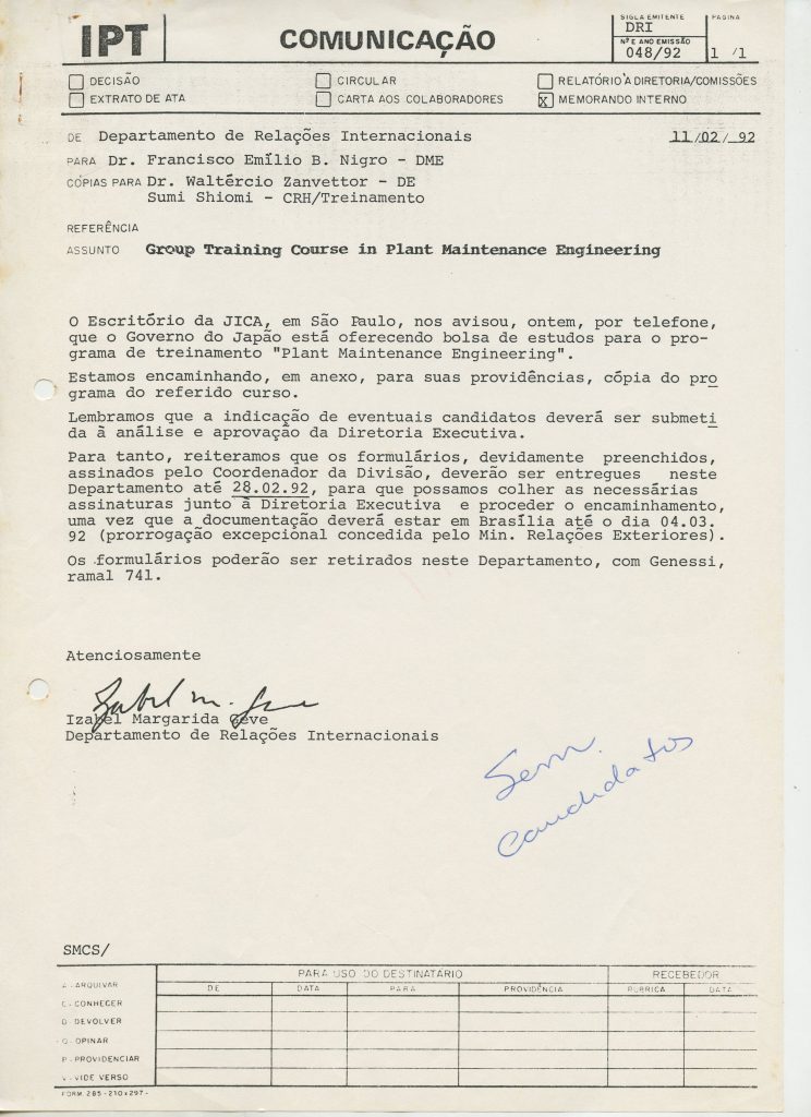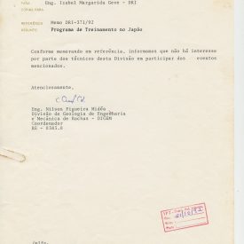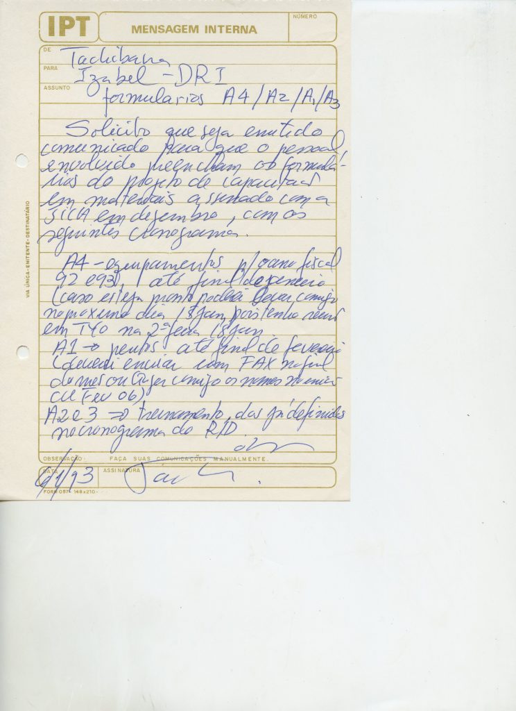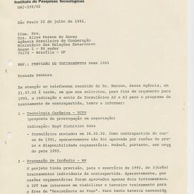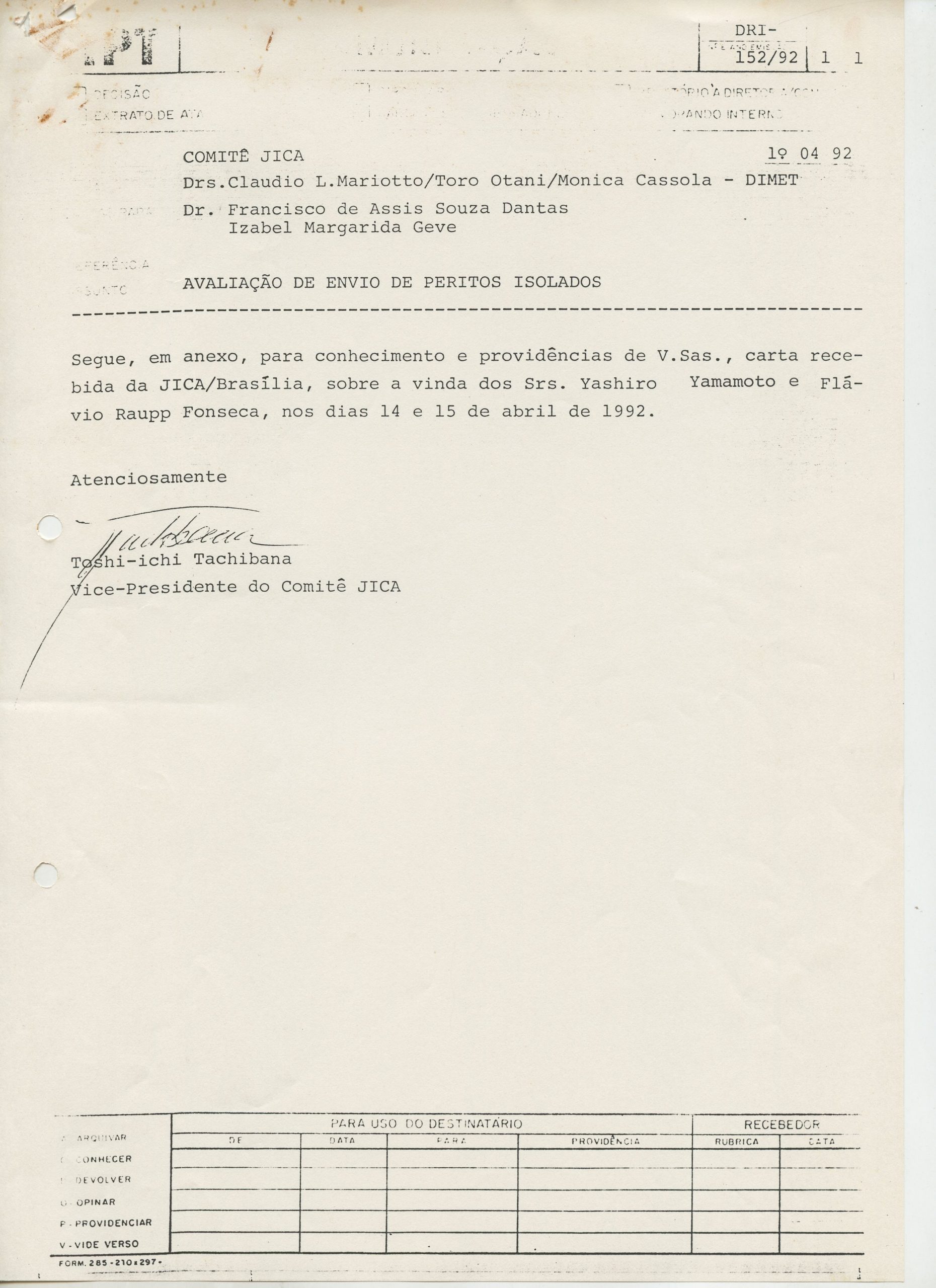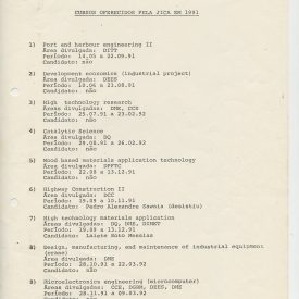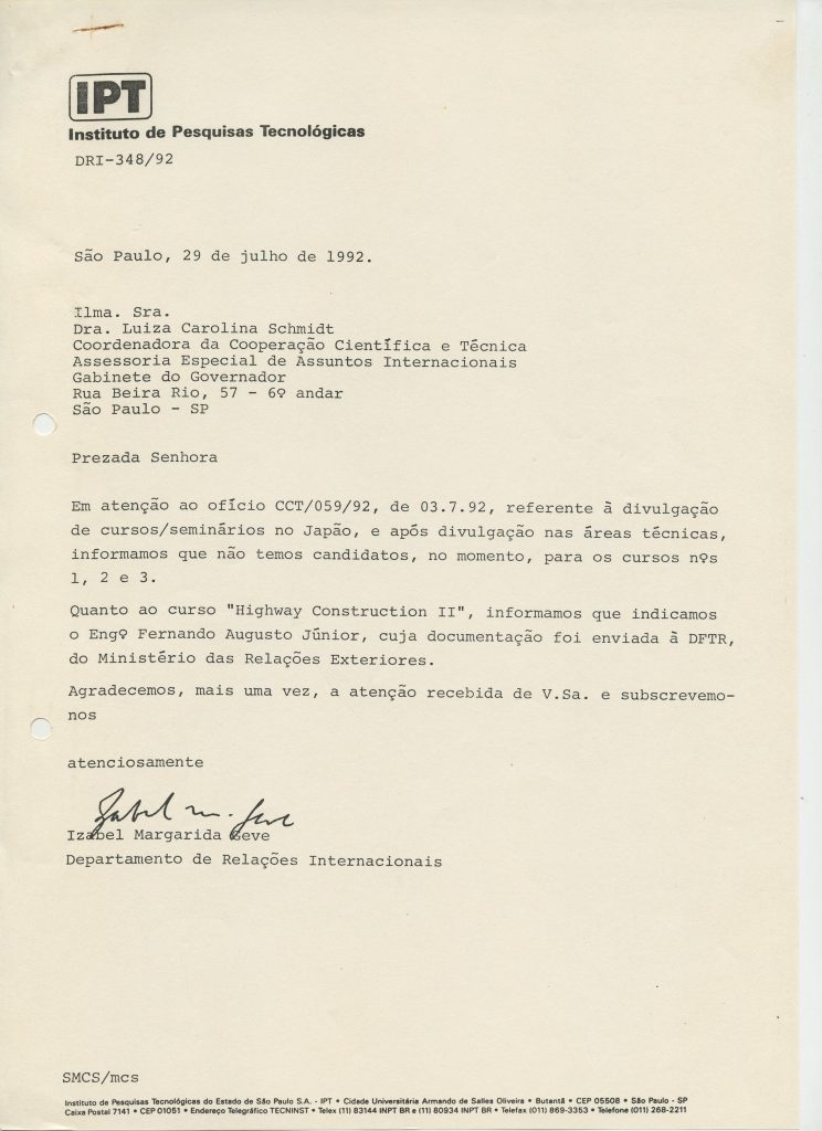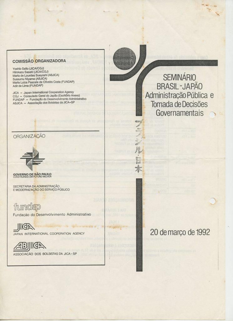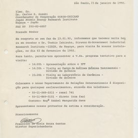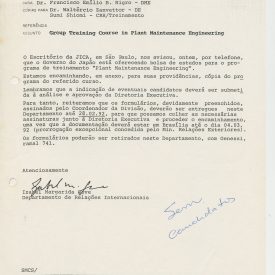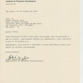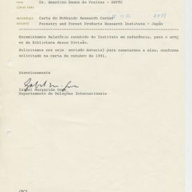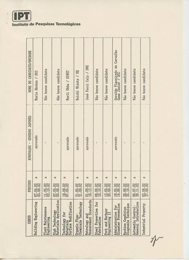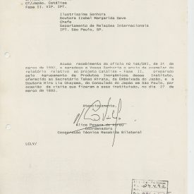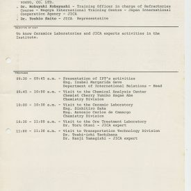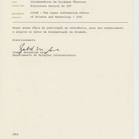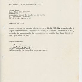 Correspondências gerais da JICA (fax, cartas, memorandos) sobre o comitê, seminários, cursos, relatórios, treinamentos e avaliações. Documentos sem relação e de assuntos diversos: bilhete solicitando doação a empresa Asahi Chemical Industry Co. Ltd., requisição de desembaraço aduaneiro de materiais e equipamentos, bilhete contendo telefone e endereço do Conselheiro Rubens de Souza Sarmento, folheto da campanha do agasalho, cópia de cartão de visita, e cartão de sugestão.