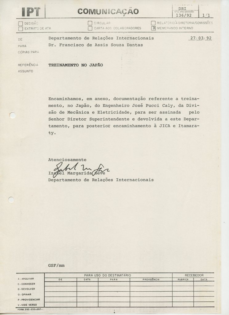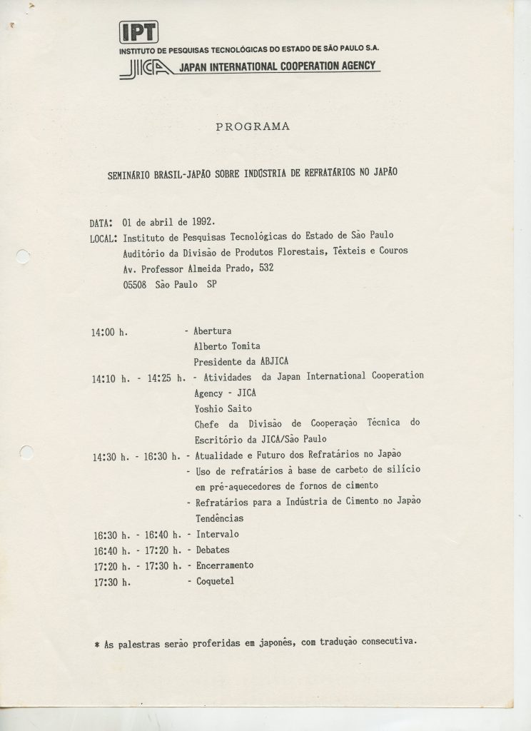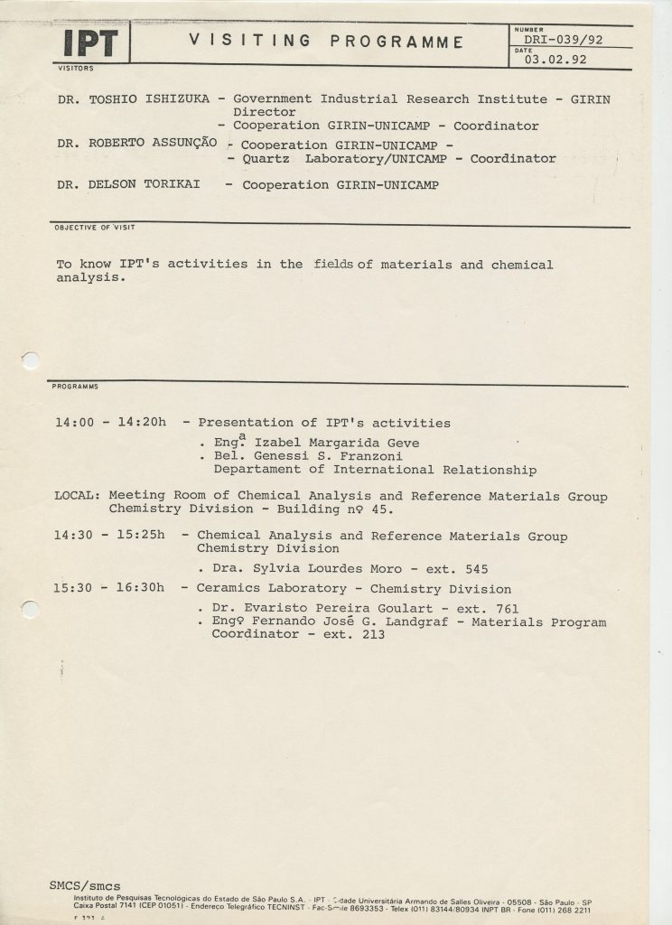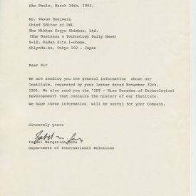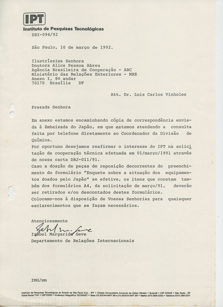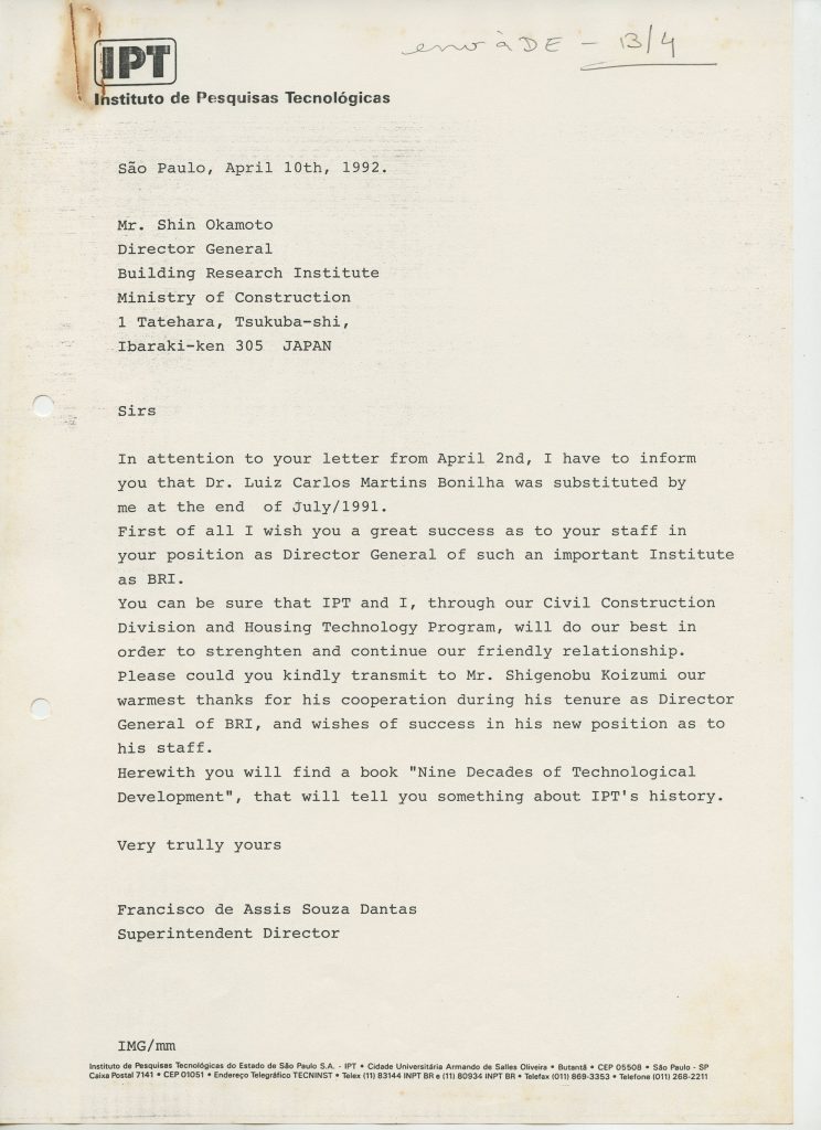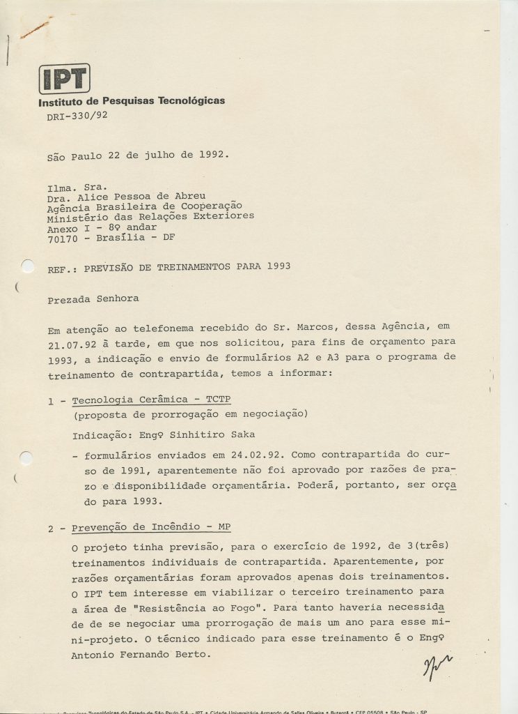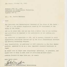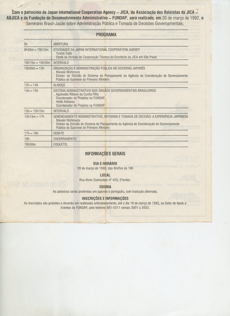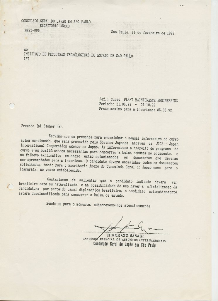 Correspondências gerais da JICA (fax, cartas, memorandos) sobre o comitê, seminários, cursos, relatórios, treinamentos e avaliações. Documentos sem relação e de assuntos diversos: bilhete solicitando doação a empresa Asahi Chemical Industry Co. Ltd., requisição de desembaraço aduaneiro de materiais e equipamentos, bilhete contendo telefone e endereço do Conselheiro Rubens de Souza Sarmento, folheto da campanha do agasalho, cópia de cartão de visita, e cartão de sugestão.