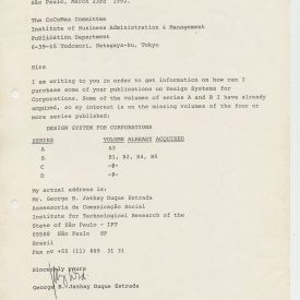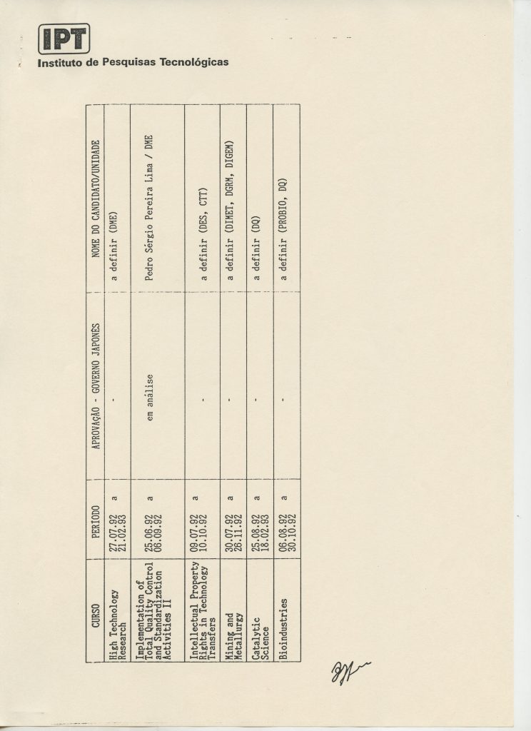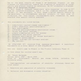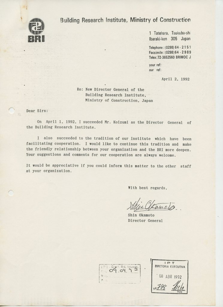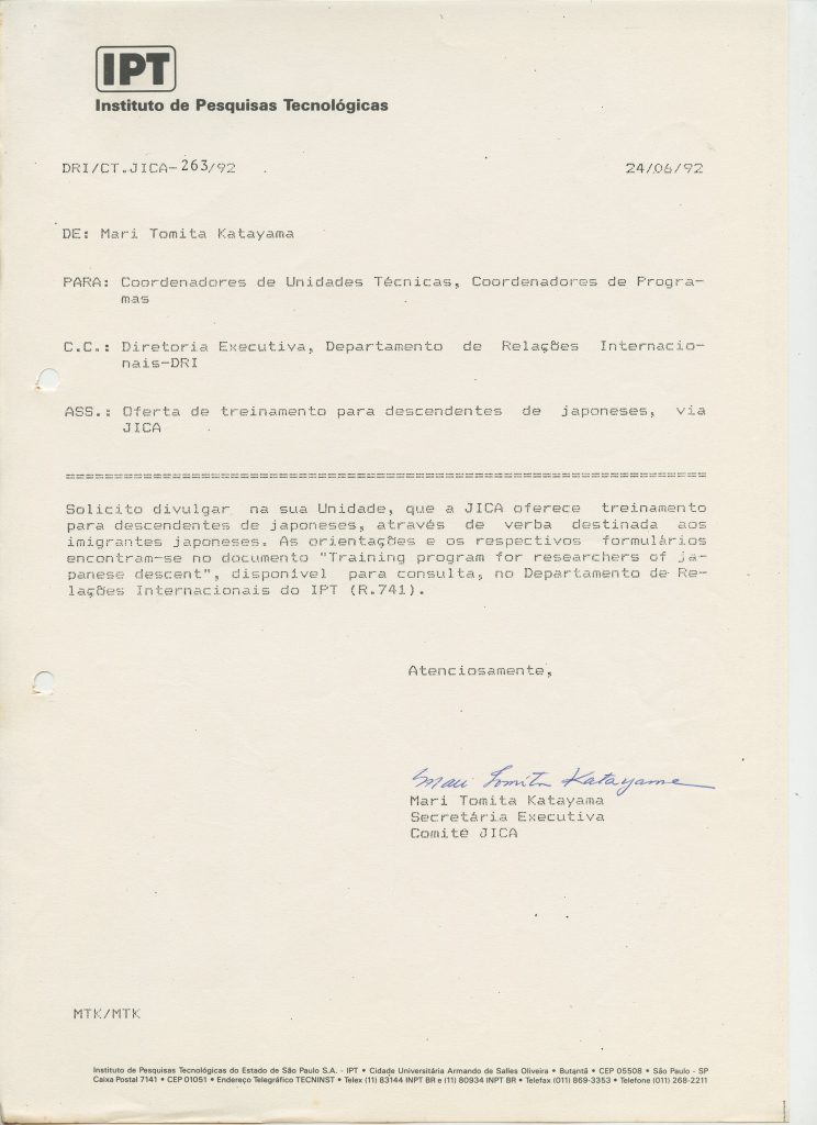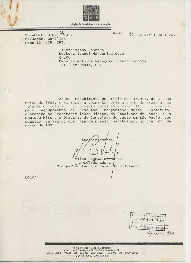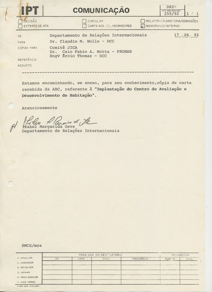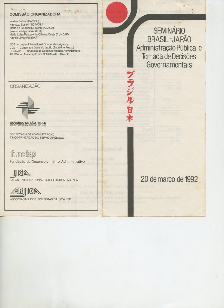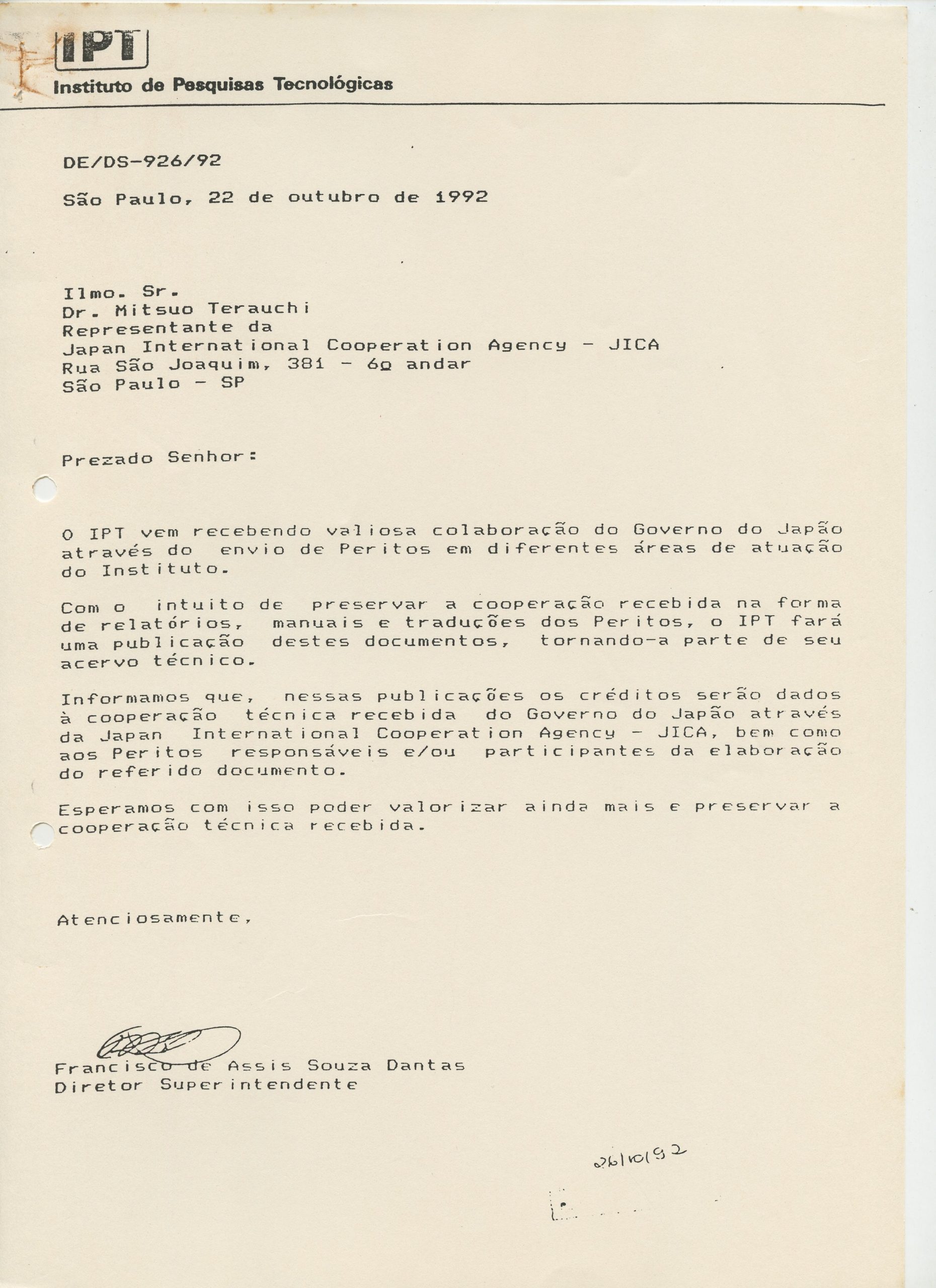 Correspondências gerais da JICA (fax, cartas, memorandos) sobre o comitê, seminários, cursos, relatórios, treinamentos e avaliações. Documentos sem relação e de assuntos diversos: bilhete solicitando doação a empresa Asahi Chemical Industry Co. Ltd., requisição de desembaraço aduaneiro de materiais e equipamentos, bilhete contendo telefone e endereço do Conselheiro Rubens de Souza Sarmento, folheto da campanha do agasalho, cópia de cartão de visita, e cartão de sugestão.