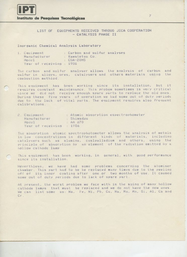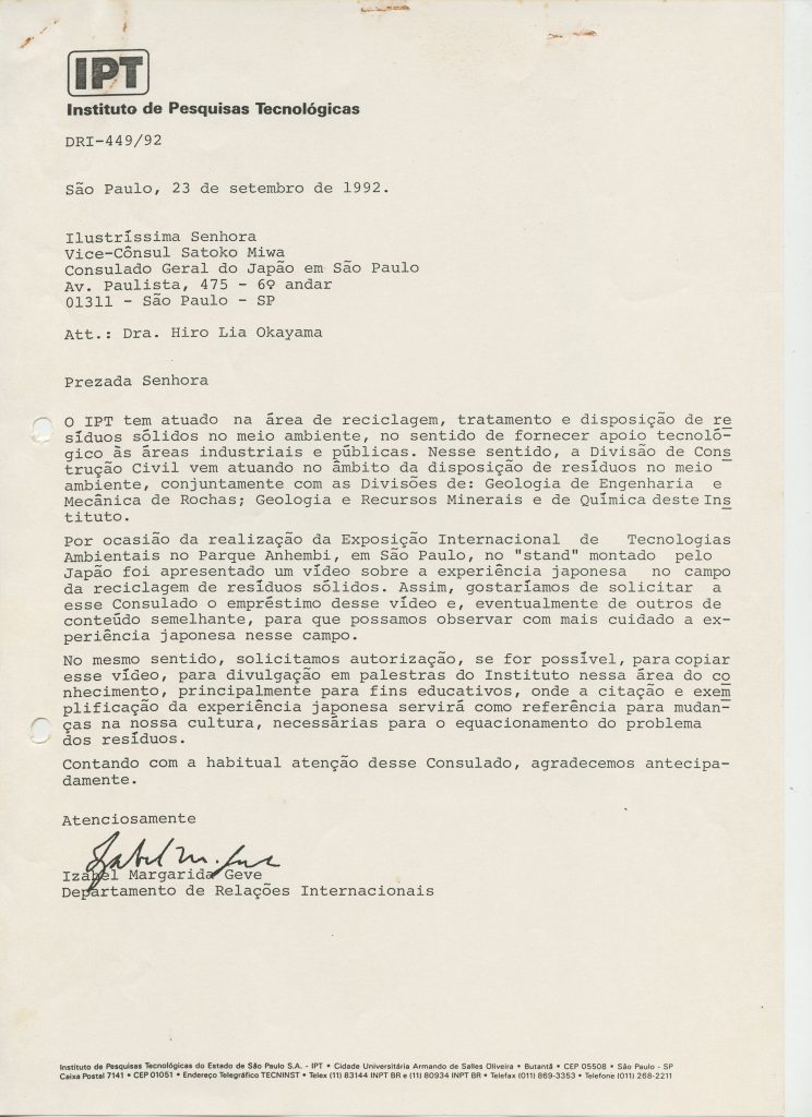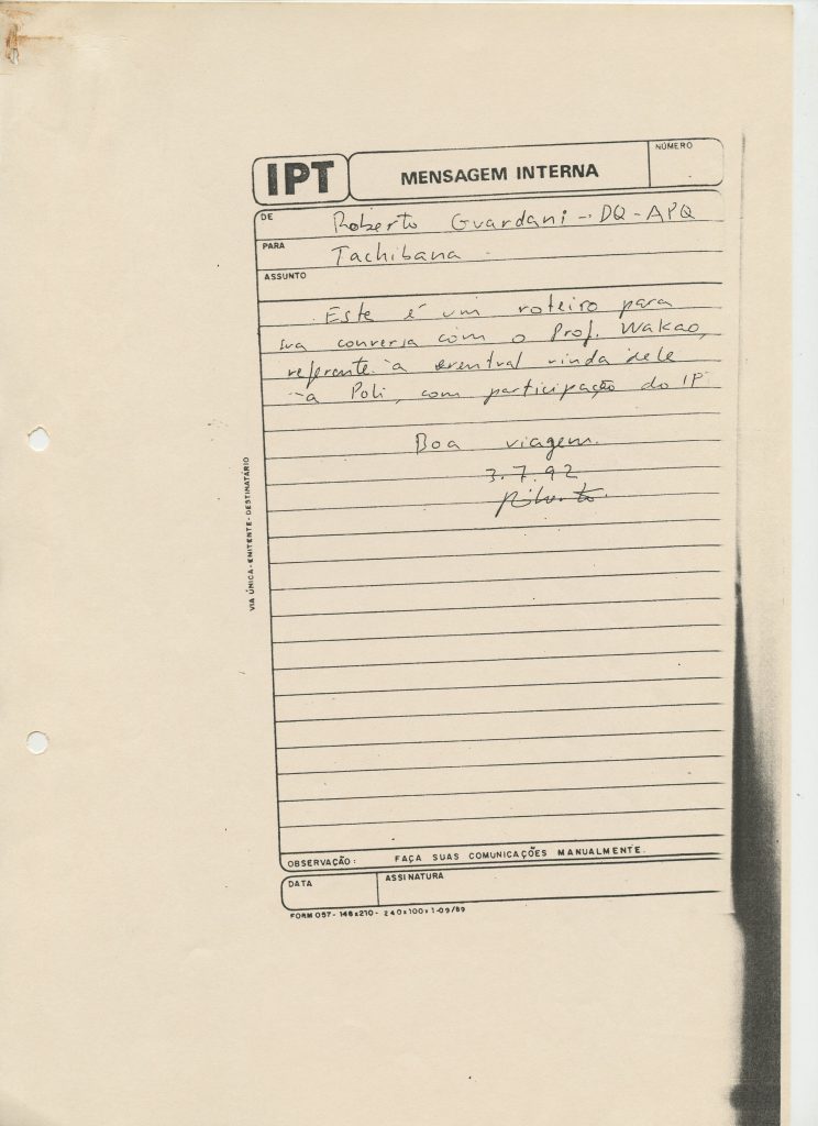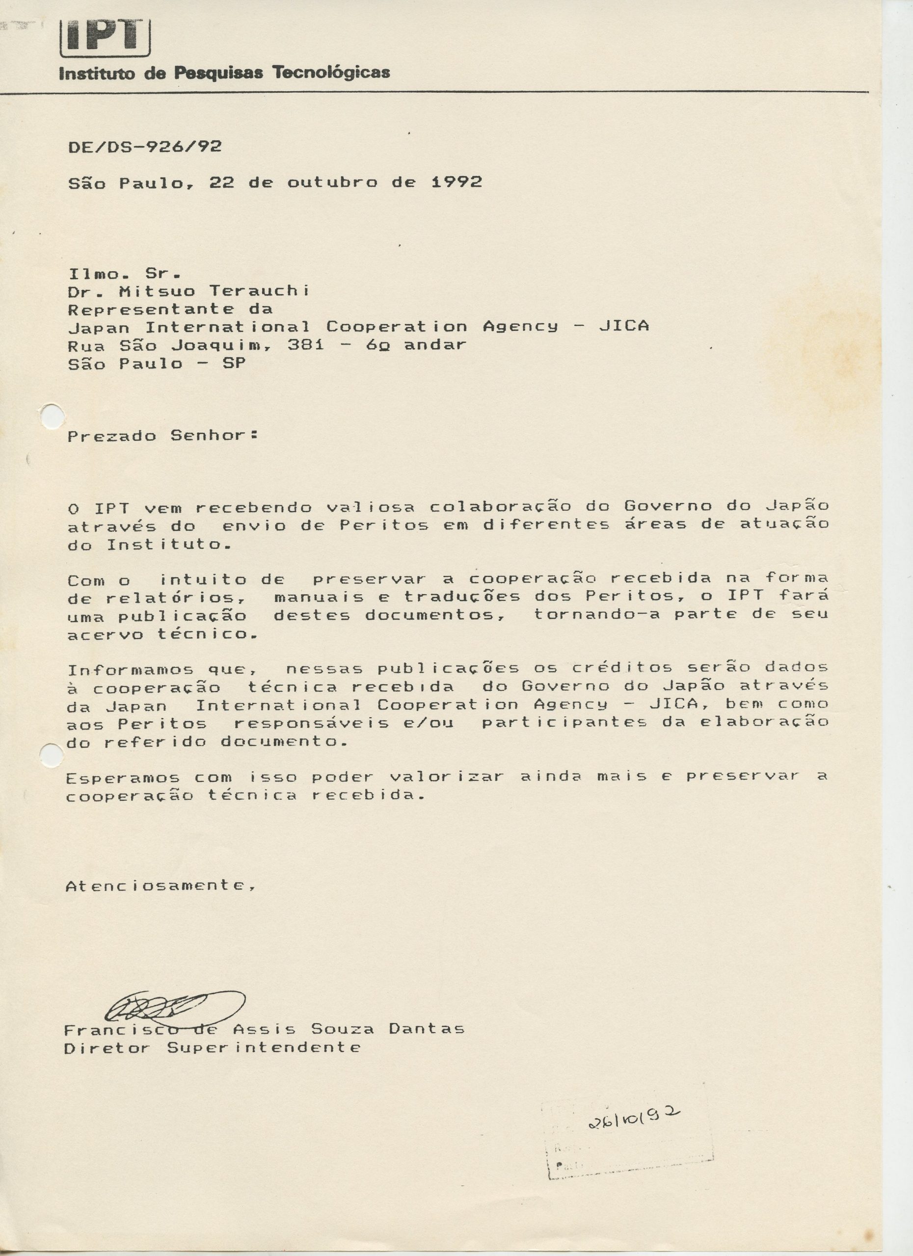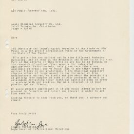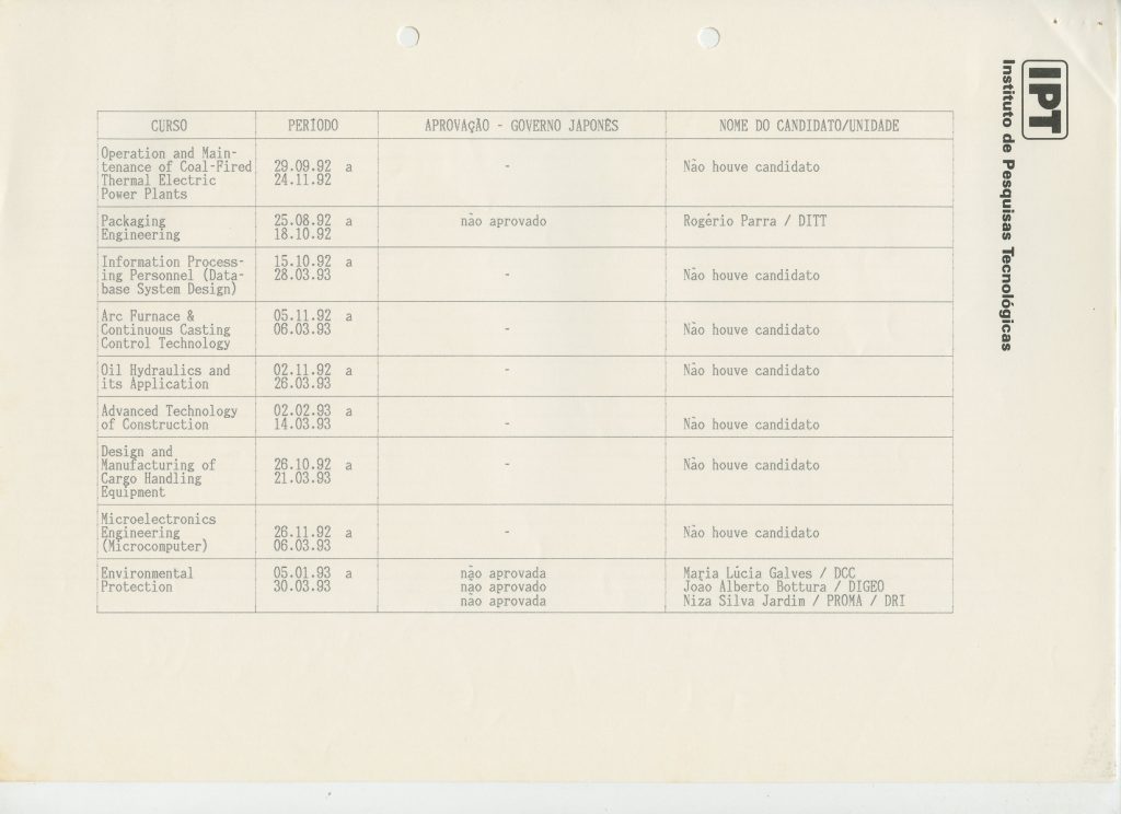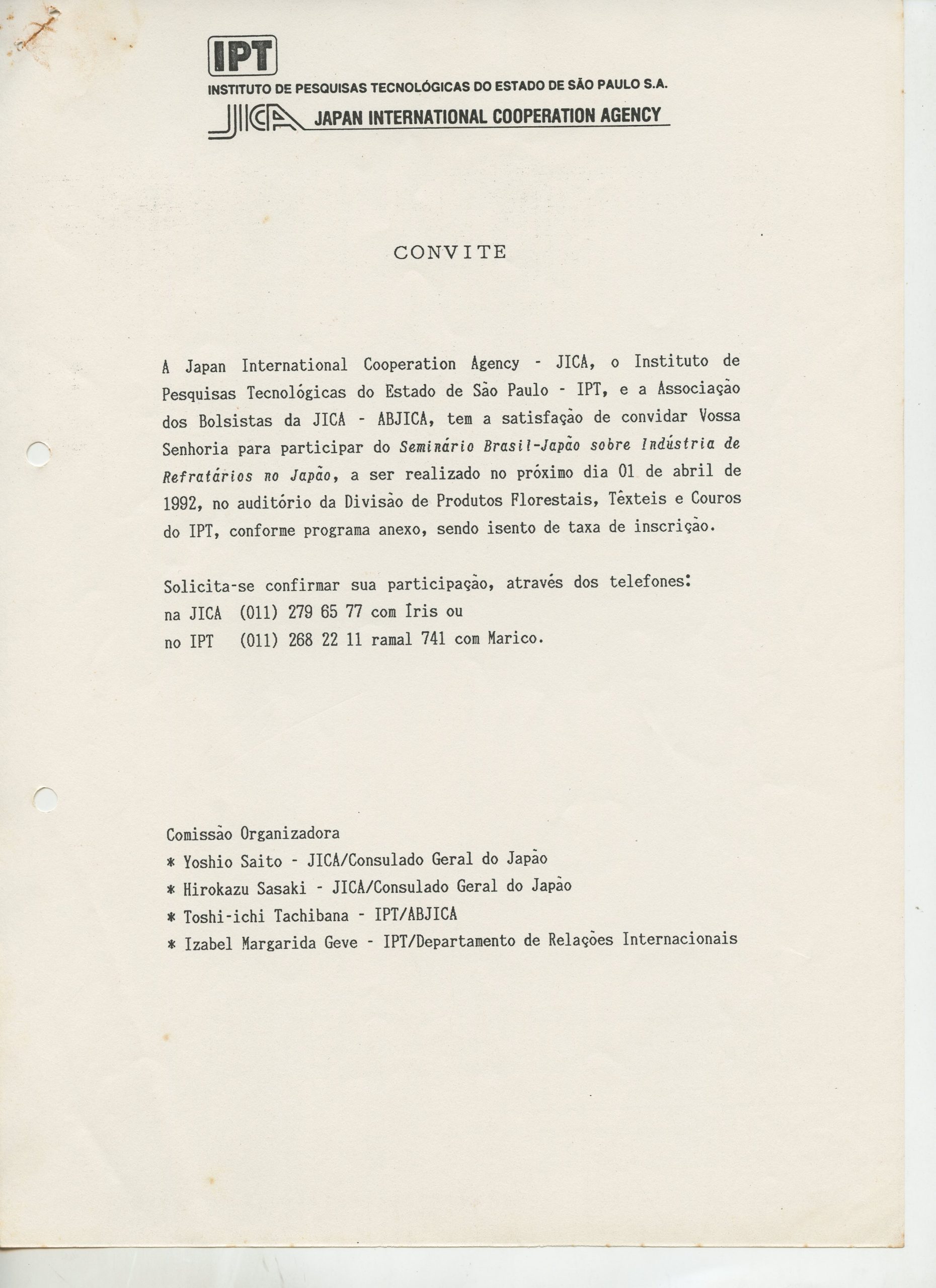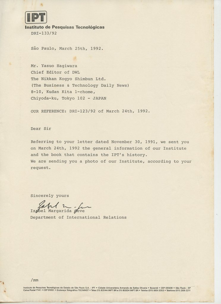 Correspondências gerais da JICA (fax, cartas, memorandos) sobre o comitê, seminários, cursos, relatórios, treinamentos e avaliações. Documentos sem relação e de assuntos diversos: bilhete solicitando doação a empresa Asahi Chemical Industry Co. Ltd., requisição de desembaraço aduaneiro de materiais e equipamentos, bilhete contendo telefone e endereço do Conselheiro Rubens de Souza Sarmento, folheto da campanha do agasalho, cópia de cartão de visita, e cartão de sugestão.
