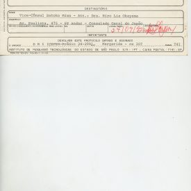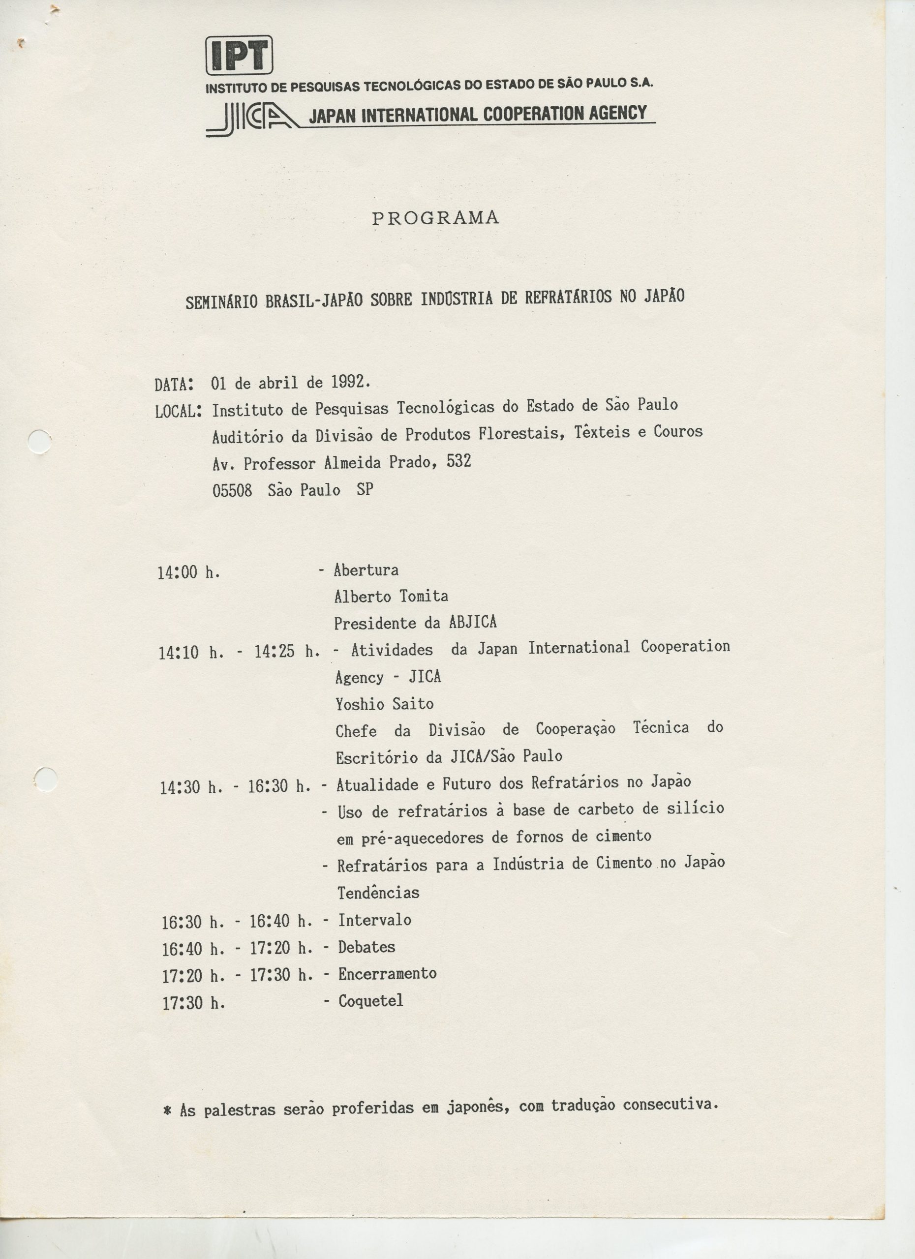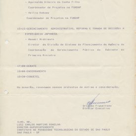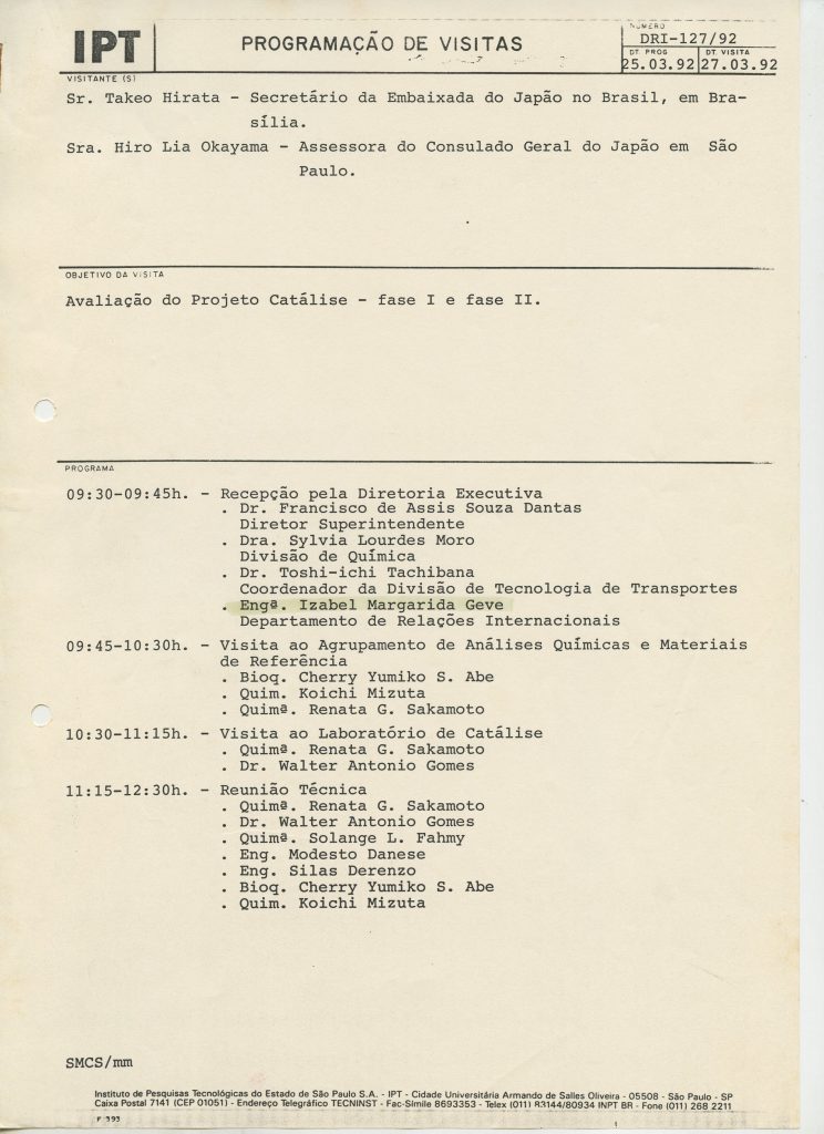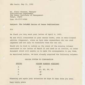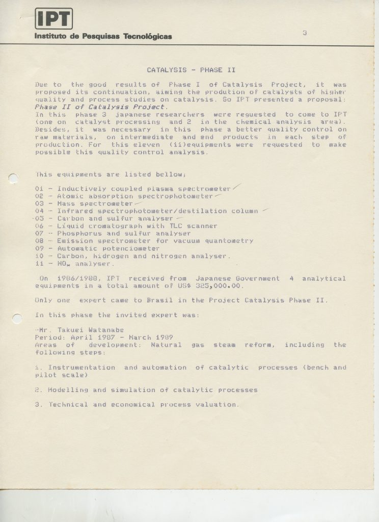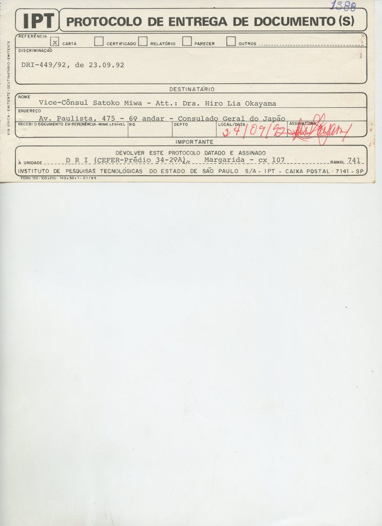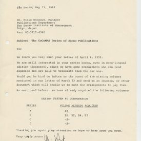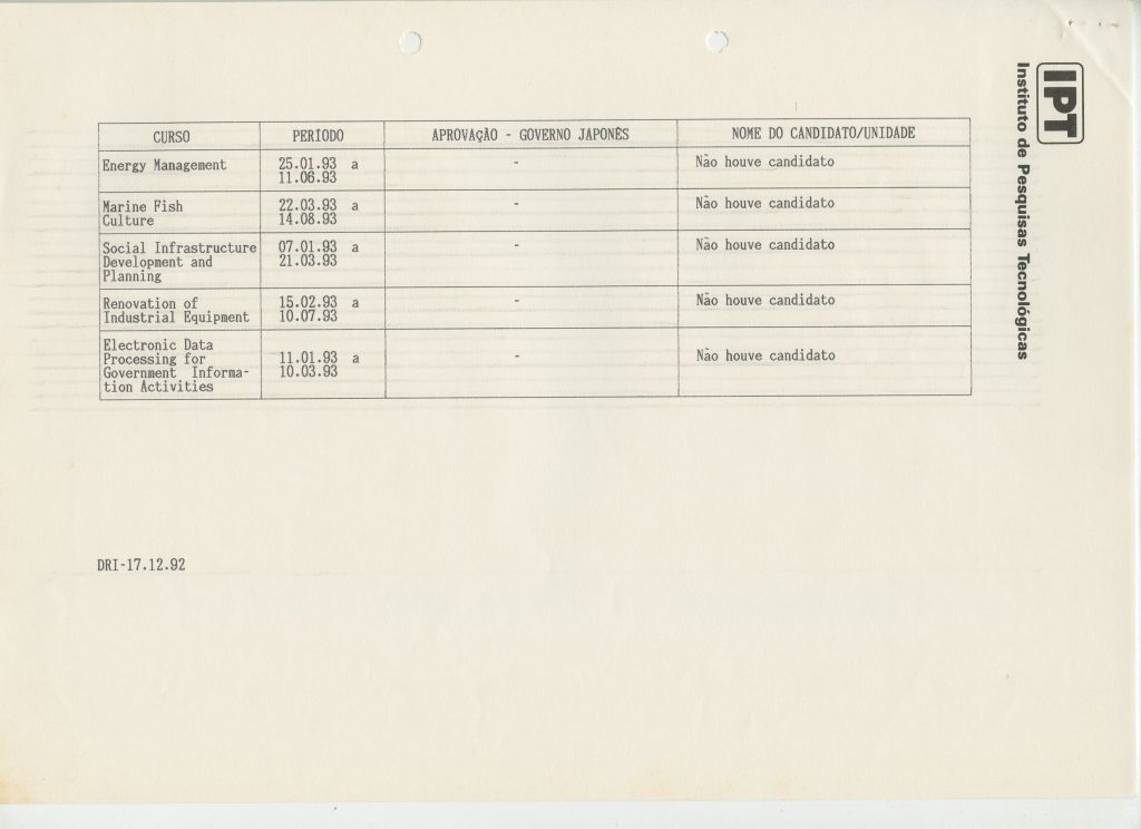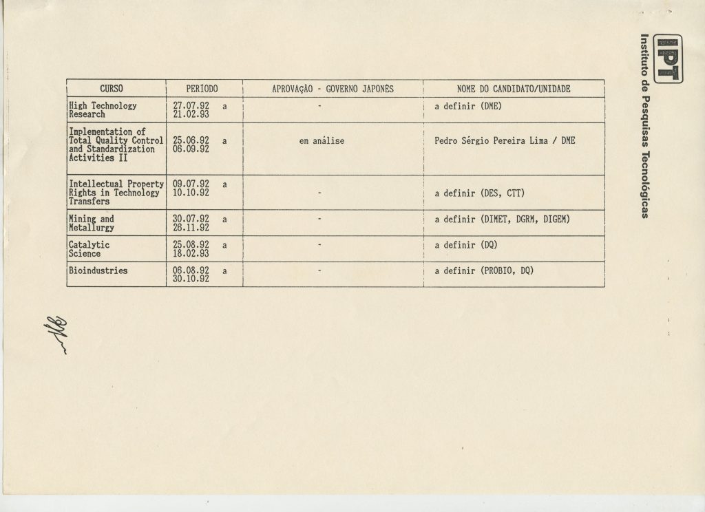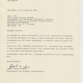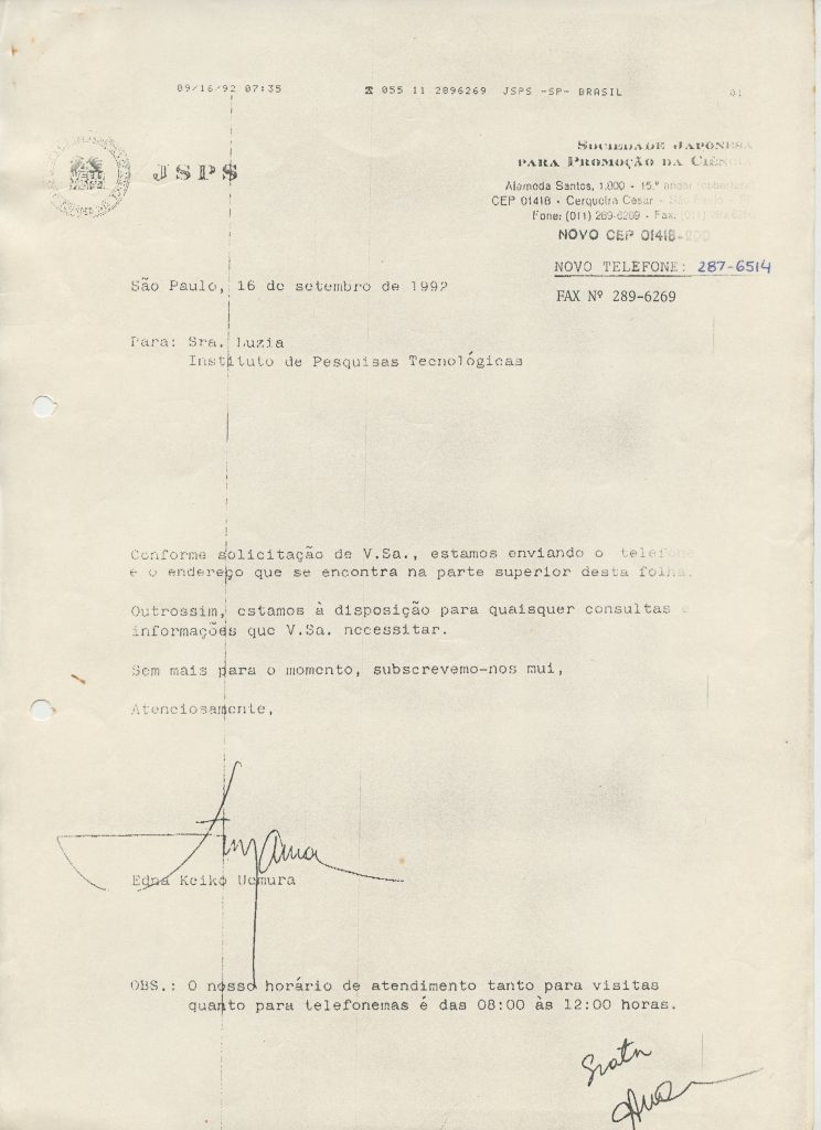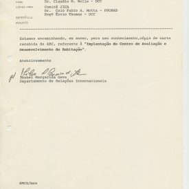 Correspondências gerais da JICA (fax, cartas, memorandos) sobre o comitê, seminários, cursos, relatórios, treinamentos e avaliações. Documentos sem relação e de assuntos diversos: bilhete solicitando doação a empresa Asahi Chemical Industry Co. Ltd., requisição de desembaraço aduaneiro de materiais e equipamentos, bilhete contendo telefone e endereço do Conselheiro Rubens de Souza Sarmento, folheto da campanha do agasalho, cópia de cartão de visita, e cartão de sugestão.