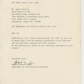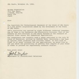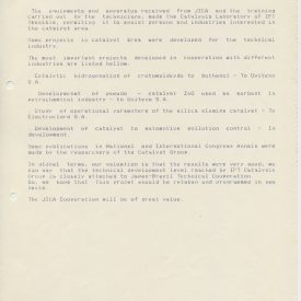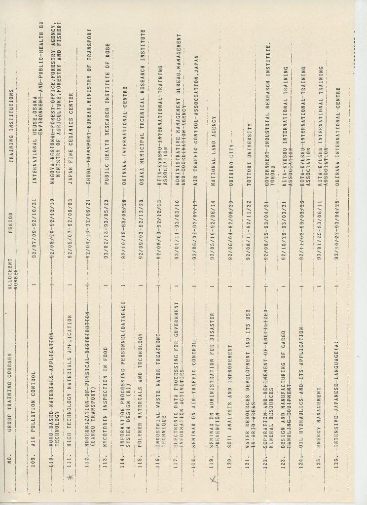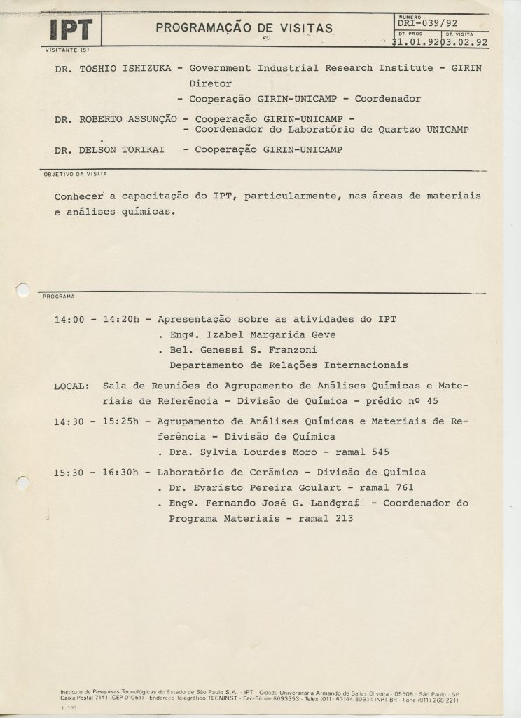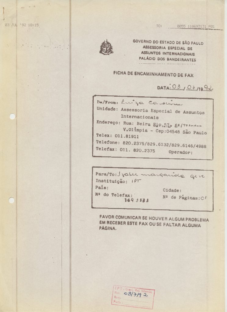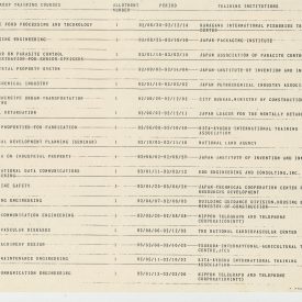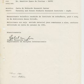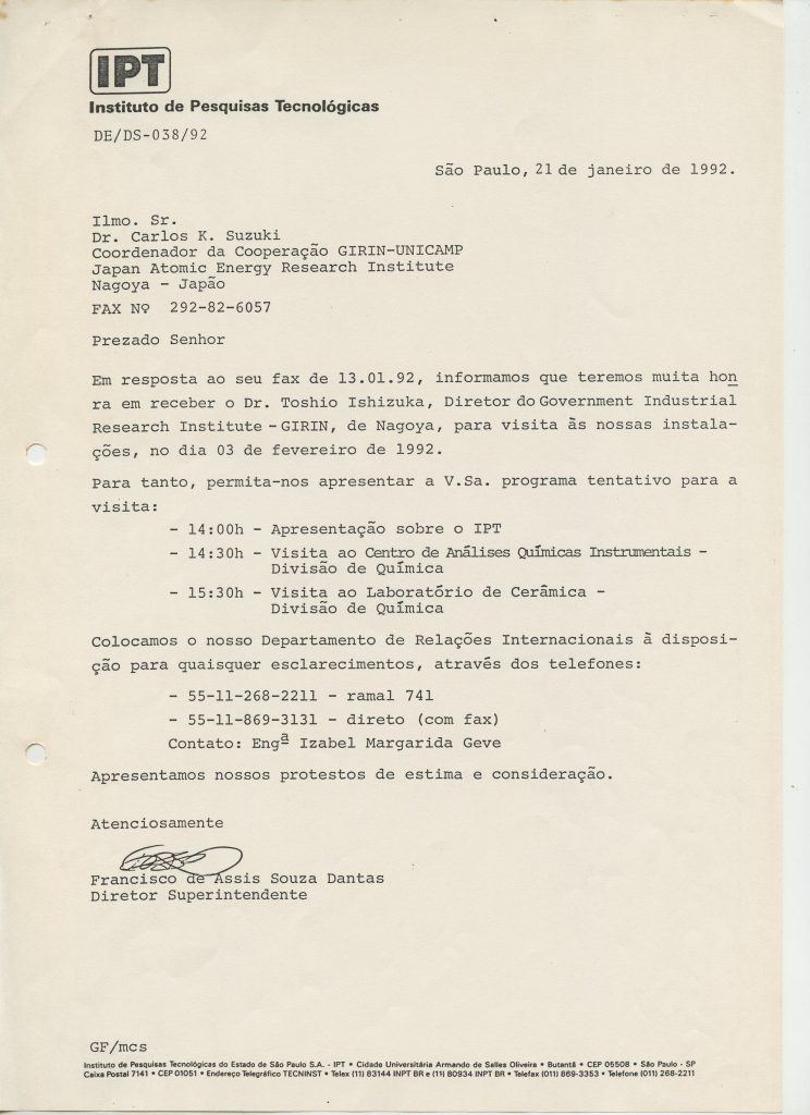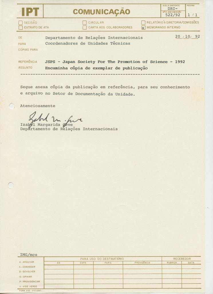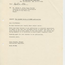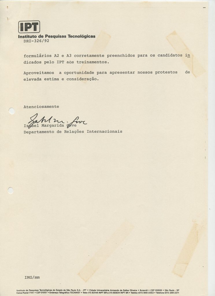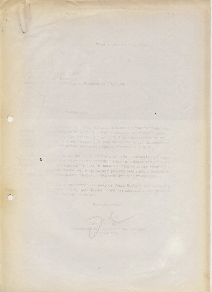 Correspondências gerais da JICA (fax, cartas, memorandos) sobre o comitê, seminários, cursos, relatórios, treinamentos e avaliações. Documentos sem relação e de assuntos diversos: bilhete solicitando doação a empresa Asahi Chemical Industry Co. Ltd., requisição de desembaraço aduaneiro de materiais e equipamentos, bilhete contendo telefone e endereço do Conselheiro Rubens de Souza Sarmento, folheto da campanha do agasalho, cópia de cartão de visita, e cartão de sugestão.
