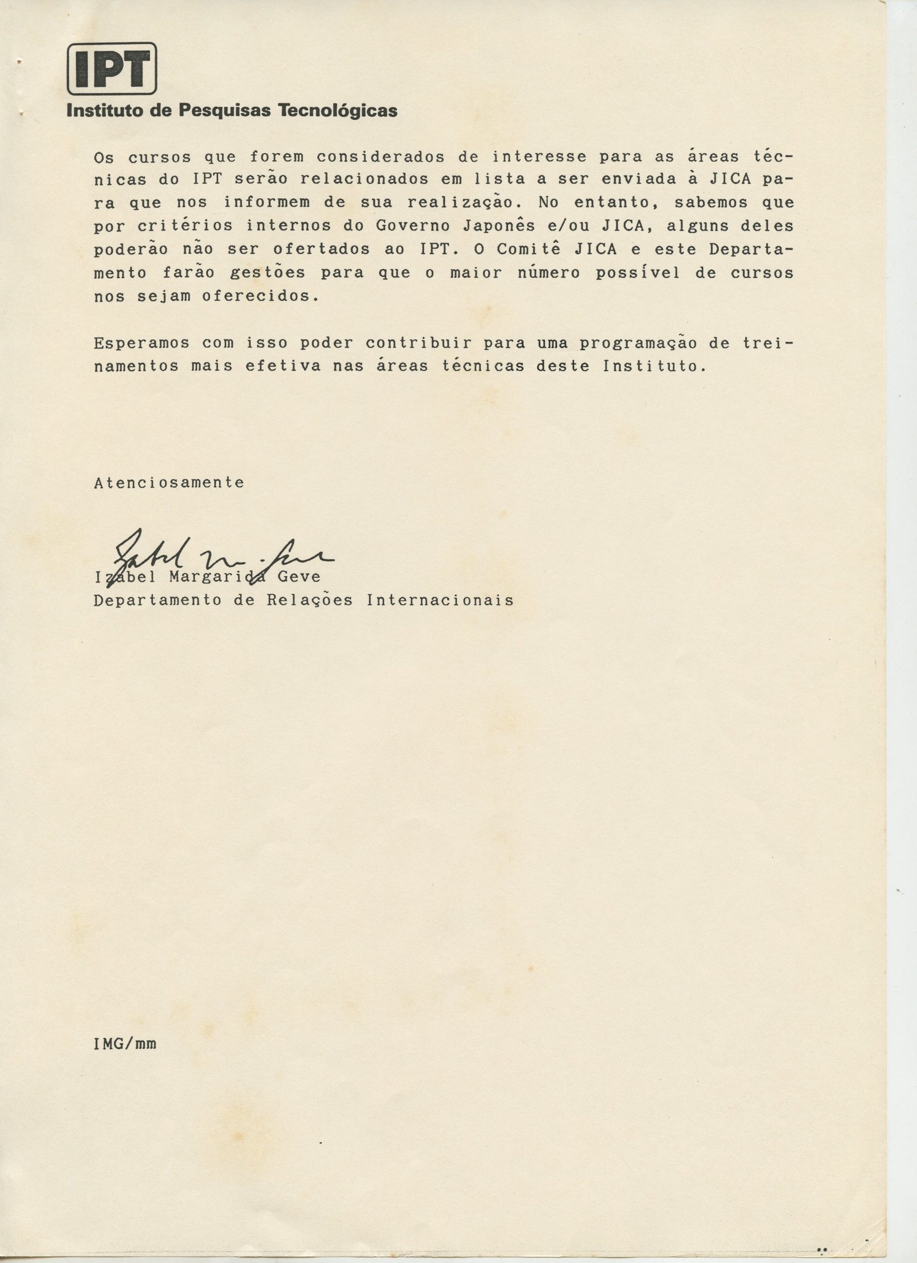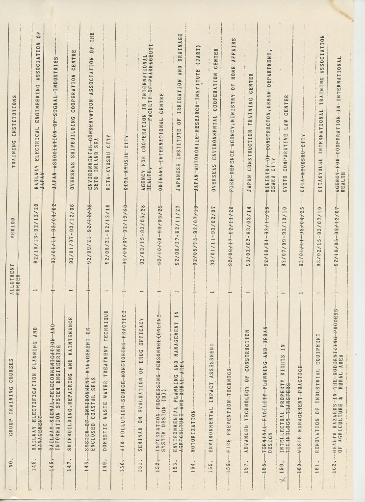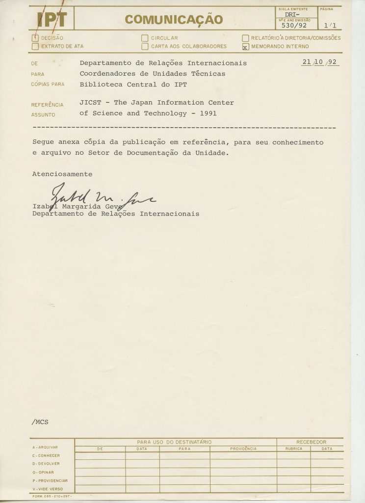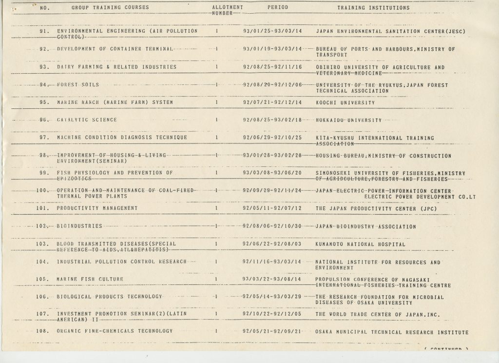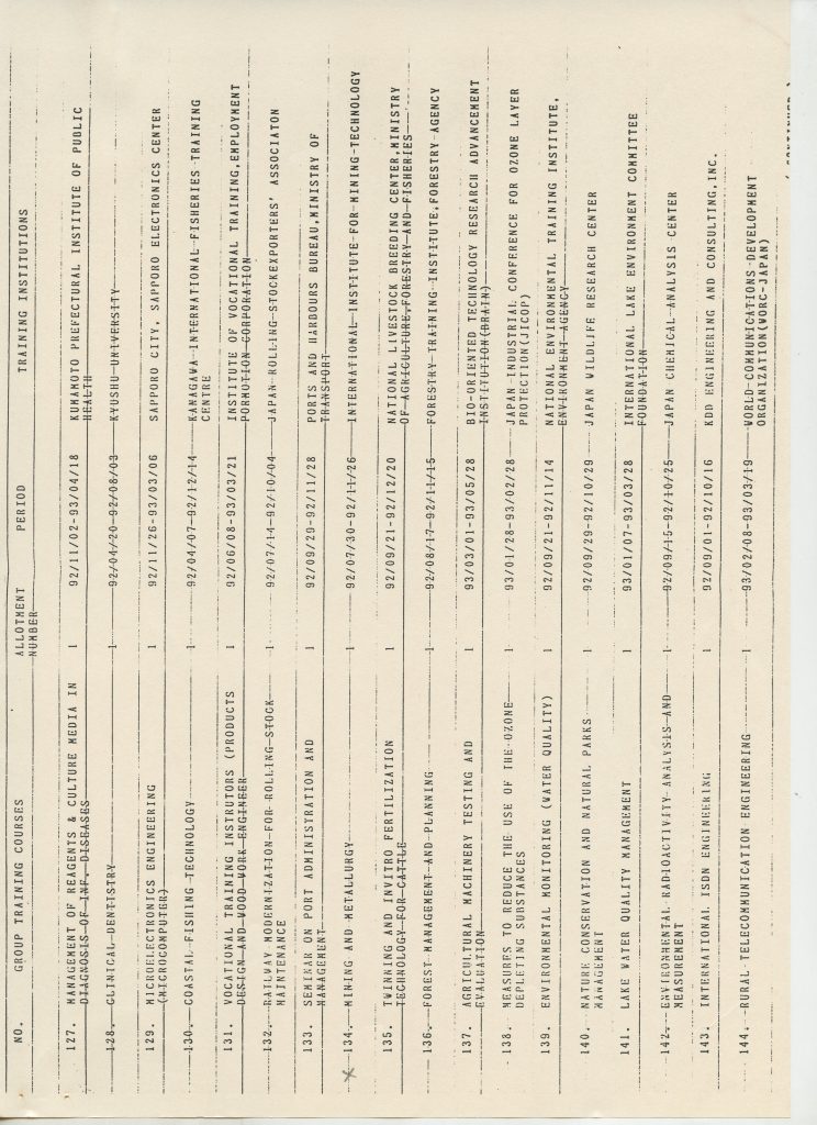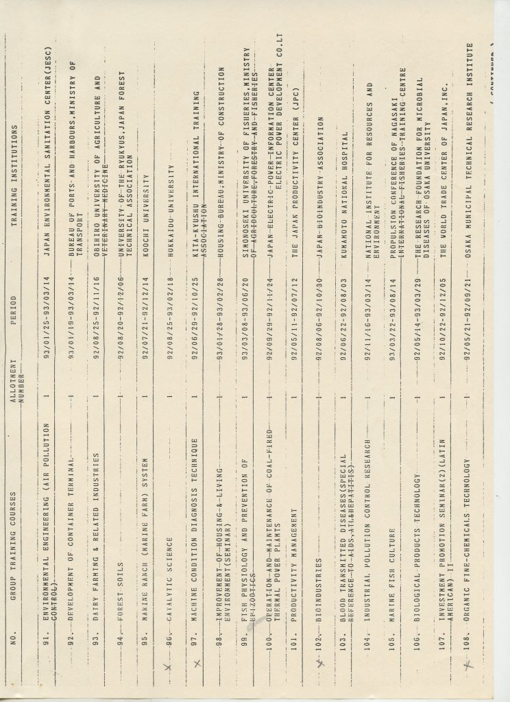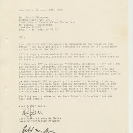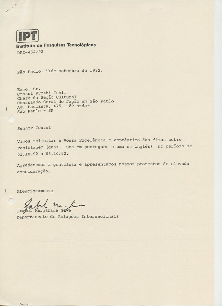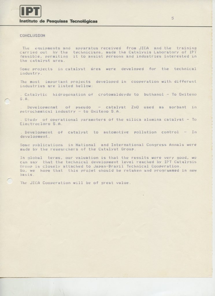 Correspondências gerais da JICA (fax, cartas, memorandos) sobre o comitê, seminários, cursos, relatórios, treinamentos e avaliações. Documentos sem relação e de assuntos diversos: bilhete solicitando doação a empresa Asahi Chemical Industry Co. Ltd., requisição de desembaraço aduaneiro de materiais e equipamentos, bilhete contendo telefone e endereço do Conselheiro Rubens de Souza Sarmento, folheto da campanha do agasalho, cópia de cartão de visita, e cartão de sugestão.