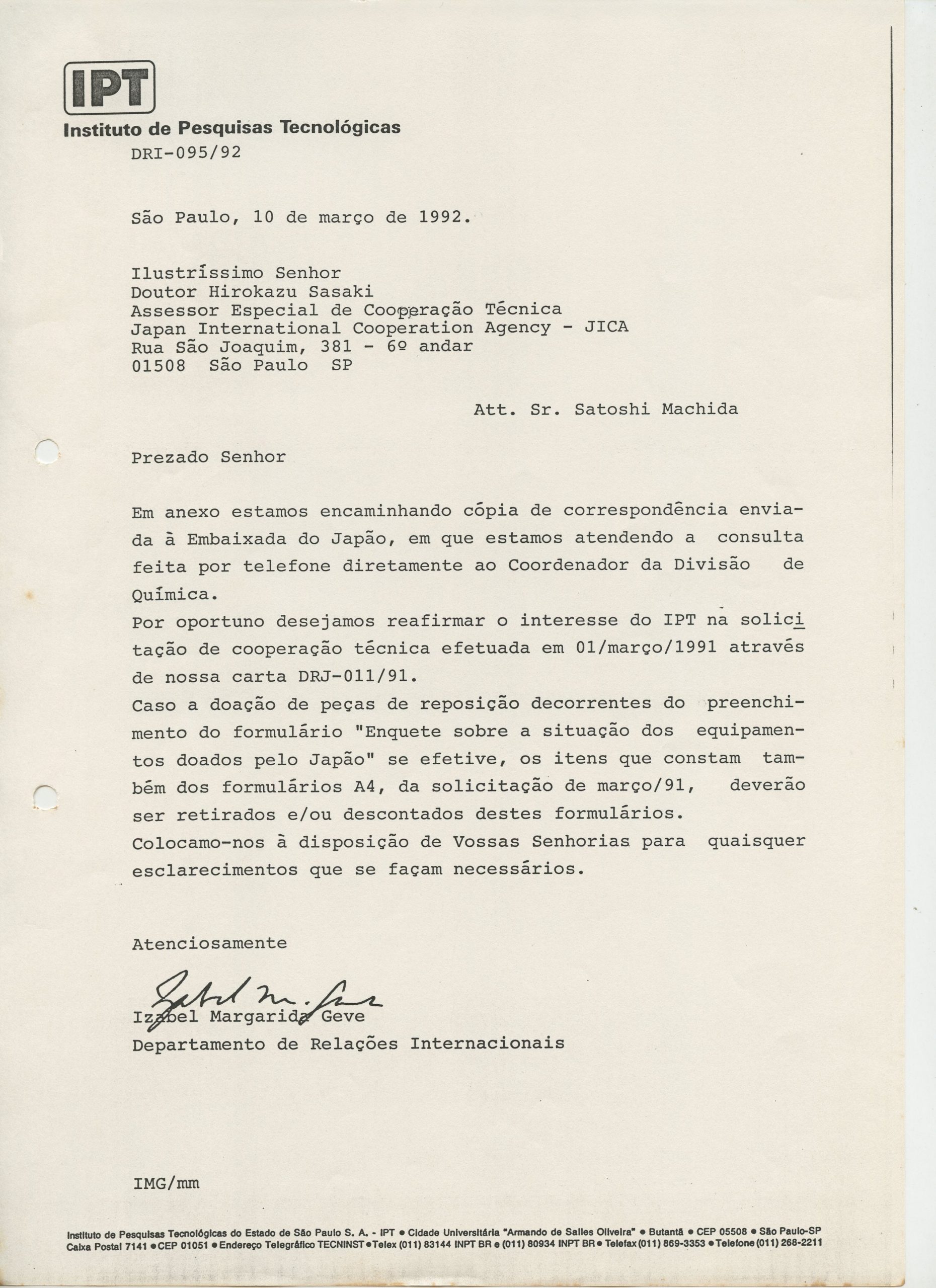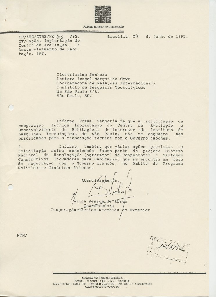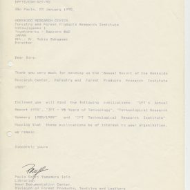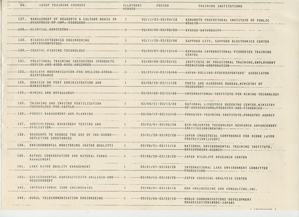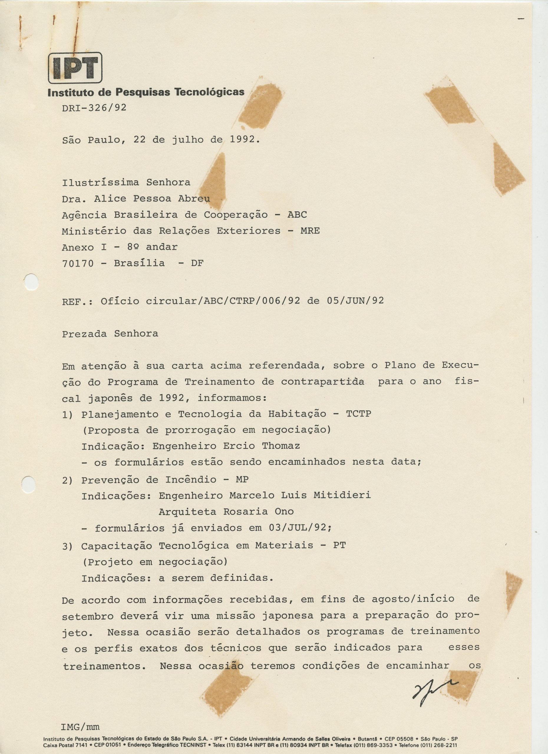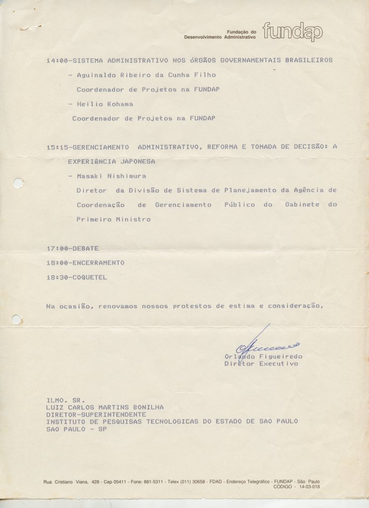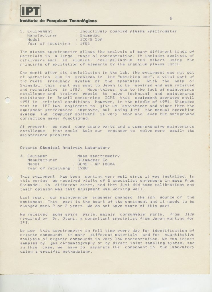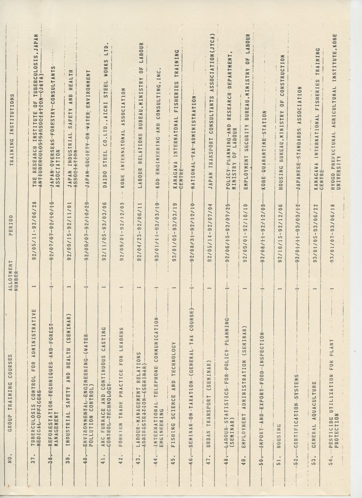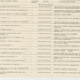Correspondências gerais da JICA (fax, cartas, memorandos) sobre o comitê, seminários, cursos, relatórios, treinamentos e avaliações. Documentos sem relação e de assuntos diversos: bilhete solicitando doação a empresa Asahi Chemical Industry Co. Ltd., requisição de desembaraço aduaneiro de materiais e equipamentos, bilhete contendo telefone e endereço do Conselheiro Rubens de Souza Sarmento, folheto da campanha do agasalho, cópia de cartão de visita, e cartão de sugestão.