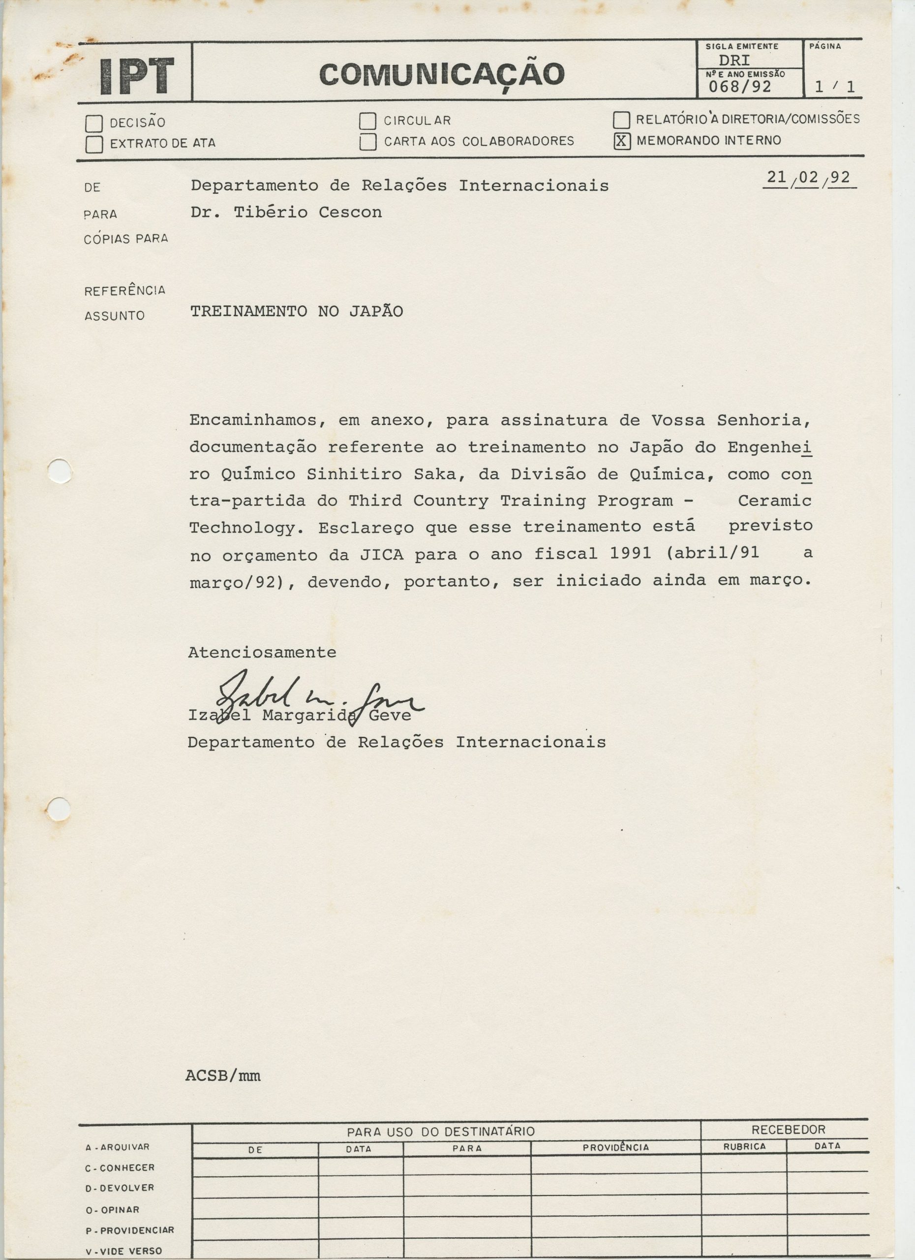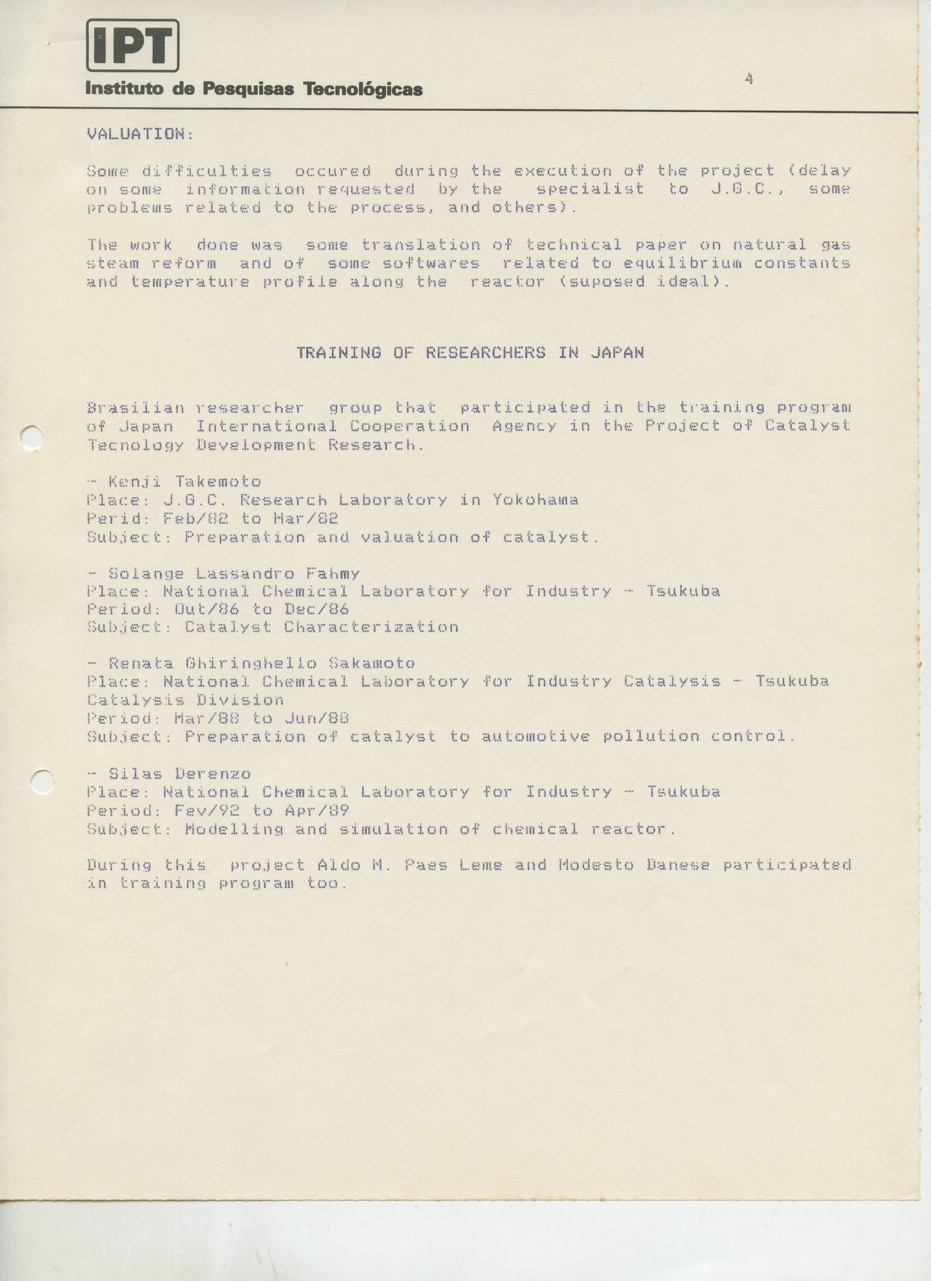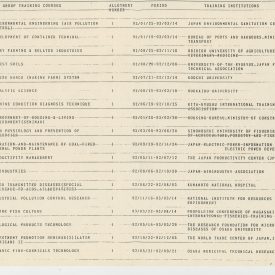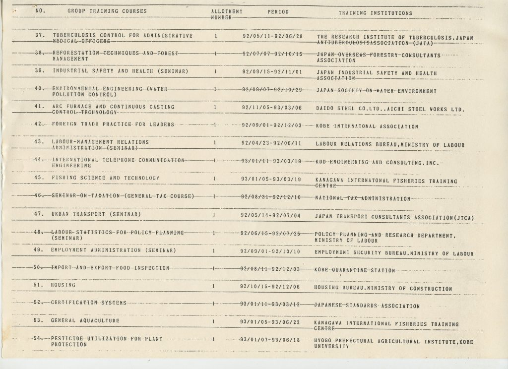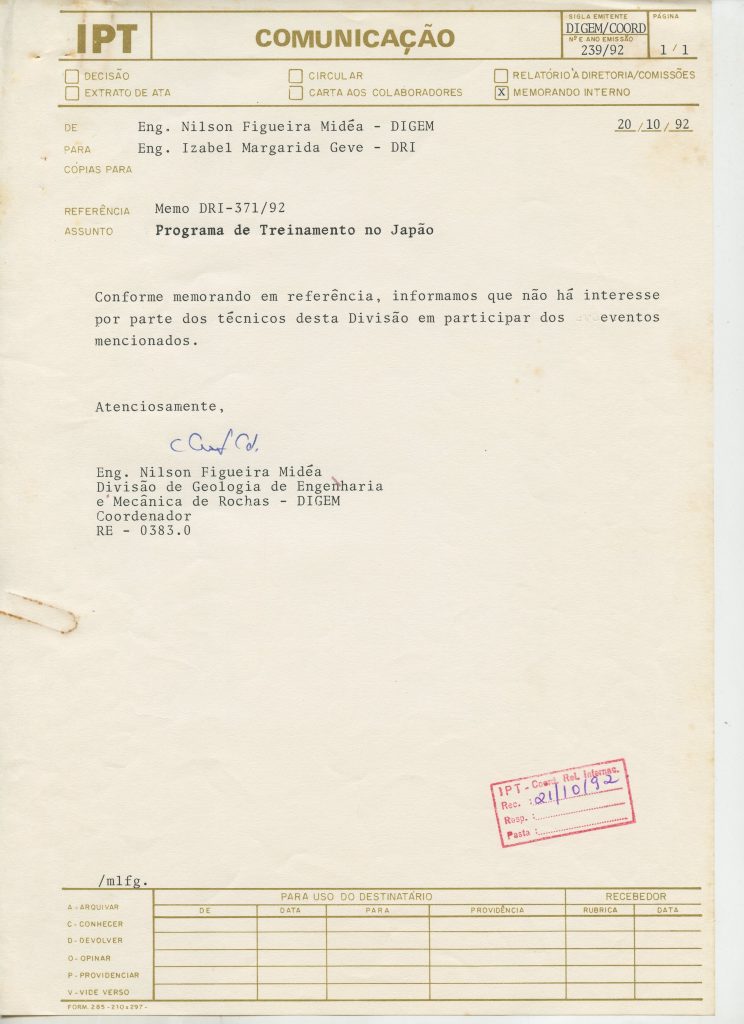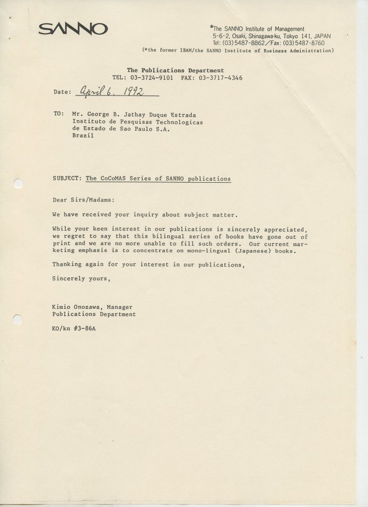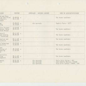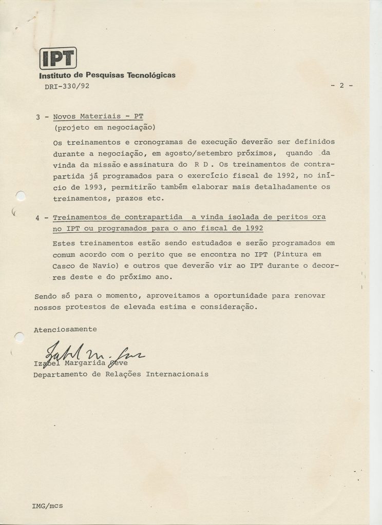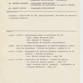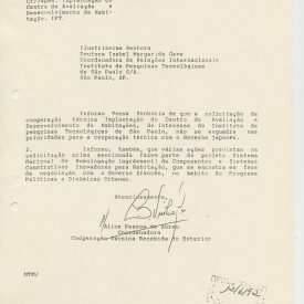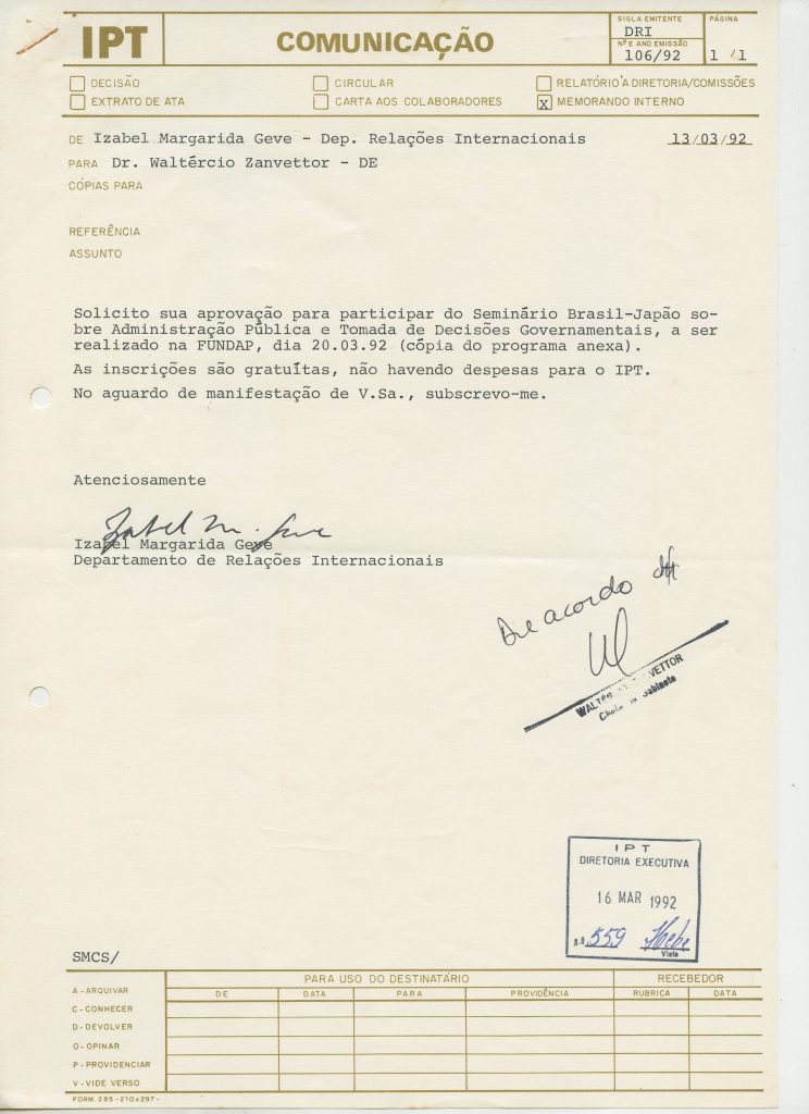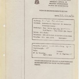 Correspondências gerais da JICA (fax, cartas, memorandos) sobre o comitê, seminários, cursos, relatórios, treinamentos e avaliações. Documentos sem relação e de assuntos diversos: bilhete solicitando doação a empresa Asahi Chemical Industry Co. Ltd., requisição de desembaraço aduaneiro de materiais e equipamentos, bilhete contendo telefone e endereço do Conselheiro Rubens de Souza Sarmento, folheto da campanha do agasalho, cópia de cartão de visita, e cartão de sugestão.