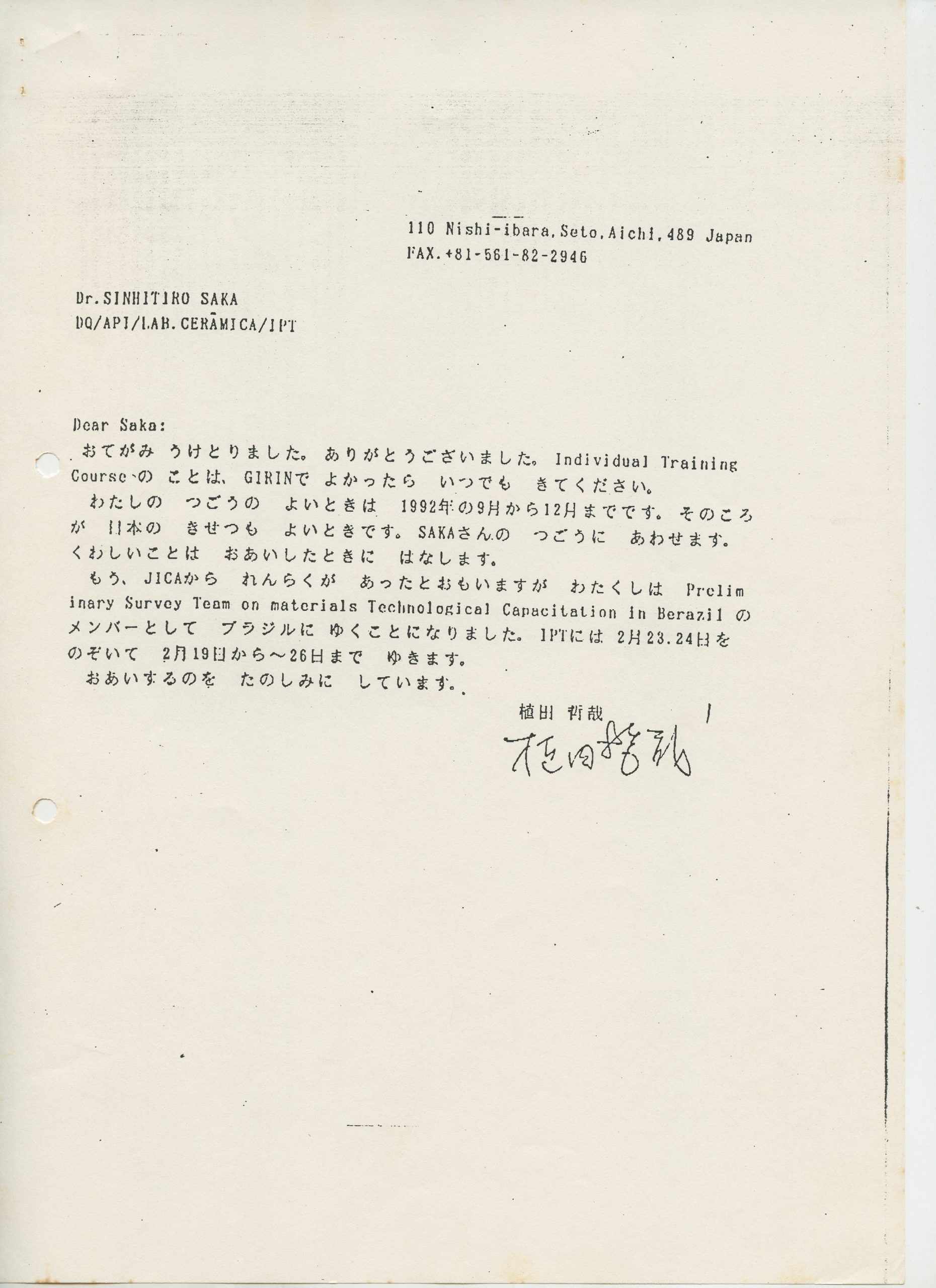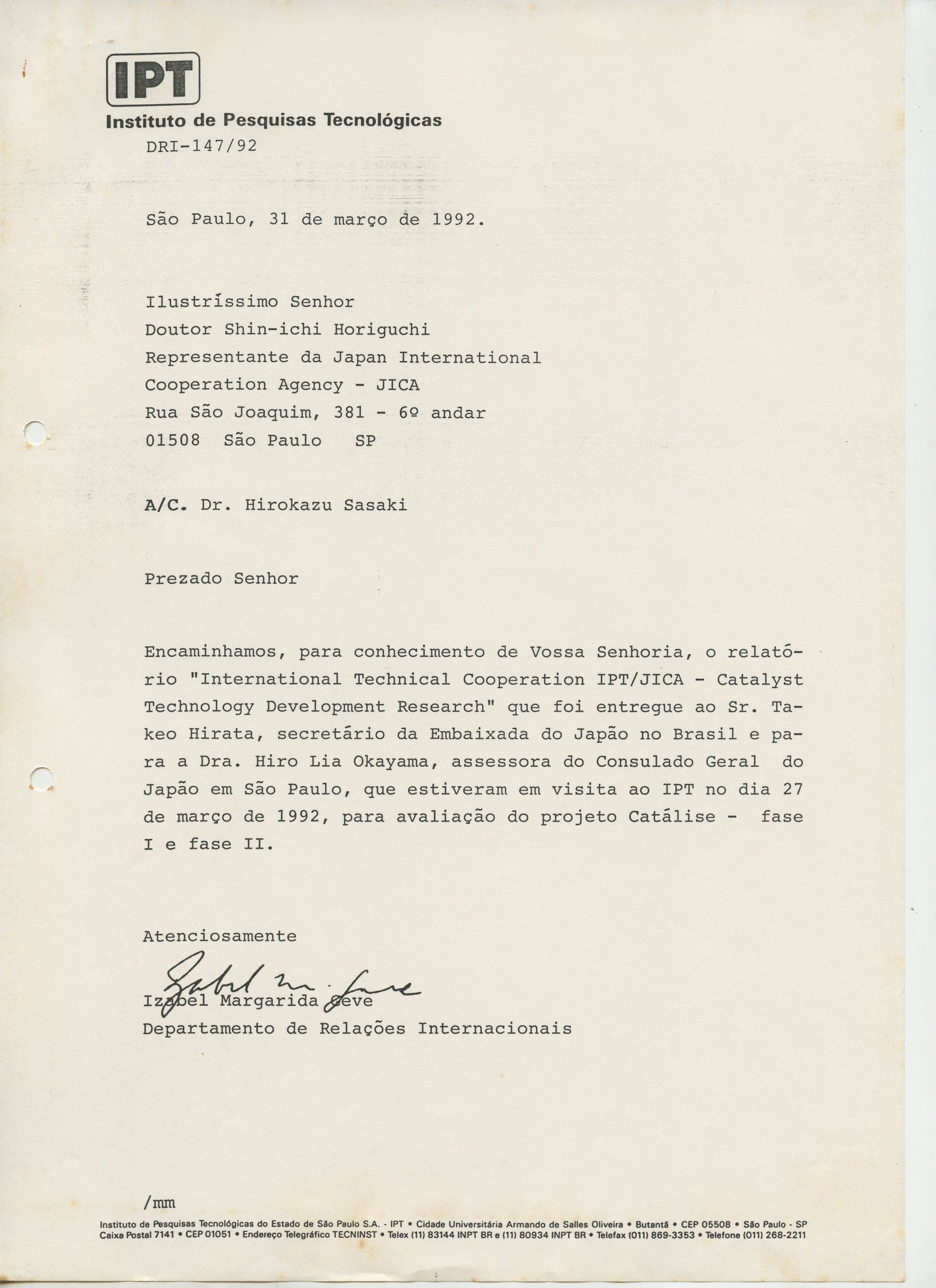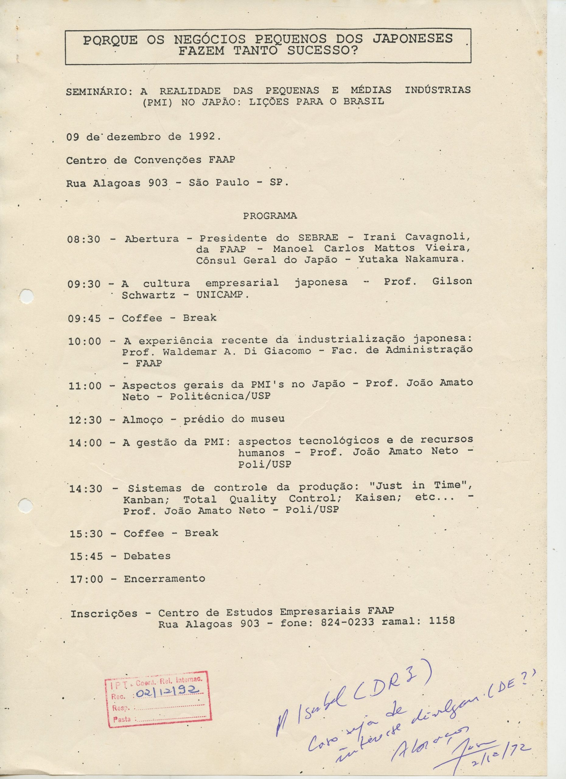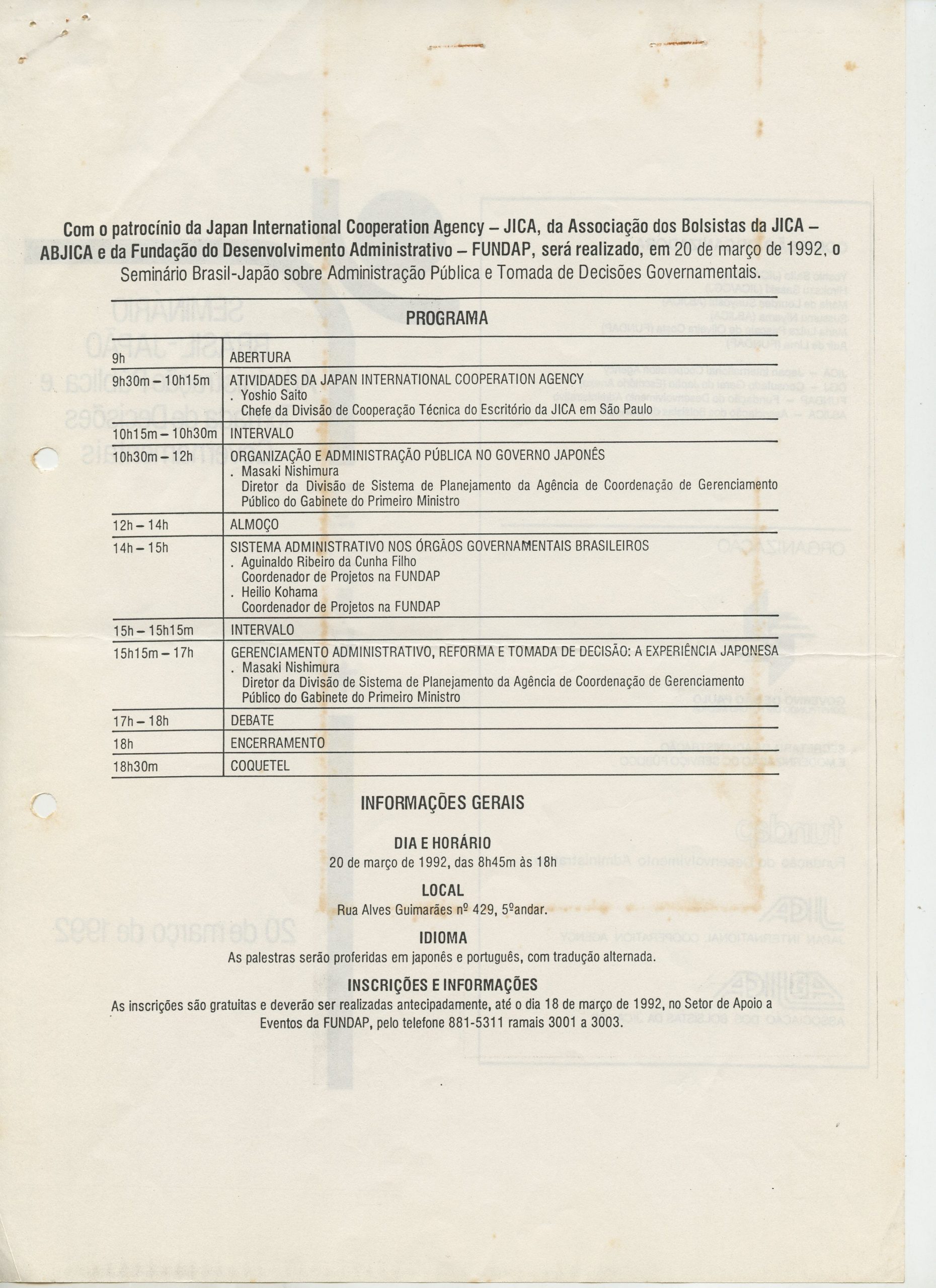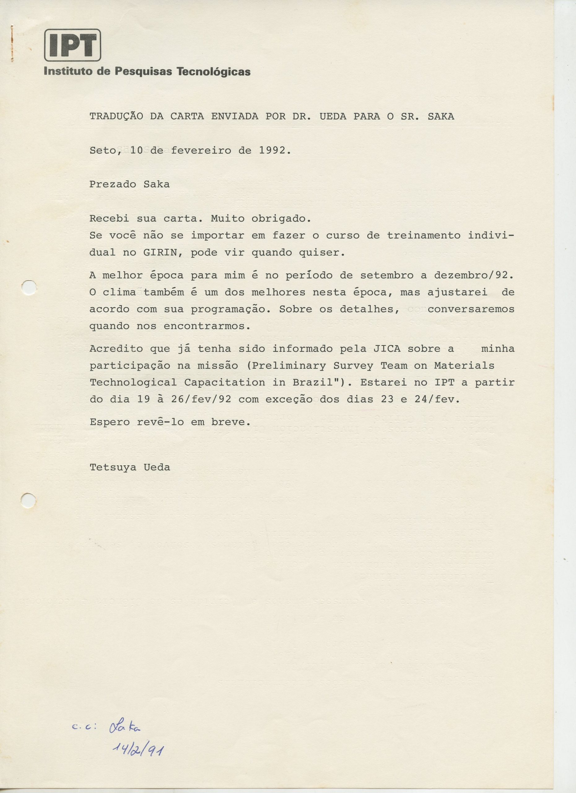 Correspondências gerais da JICA (fax, cartas, memorandos) sobre o comitê, seminários, cursos, relatórios, treinamentos e avaliações. Documentos sem relação e de assuntos diversos: bilhete solicitando doação a empresa Asahi Chemical Industry Co. Ltd., requisição de desembaraço aduaneiro de materiais e equipamentos, bilhete contendo telefone e endereço do Conselheiro Rubens de Souza Sarmento, folheto da campanha do agasalho, cópia de cartão de visita, e cartão de sugestão.