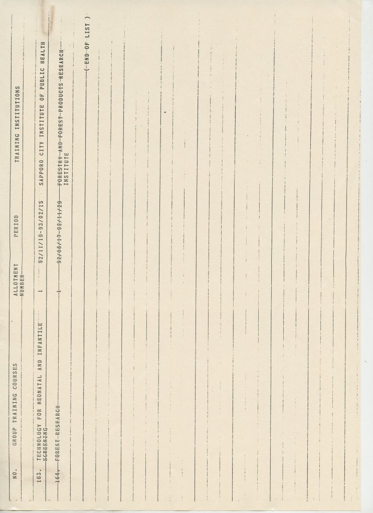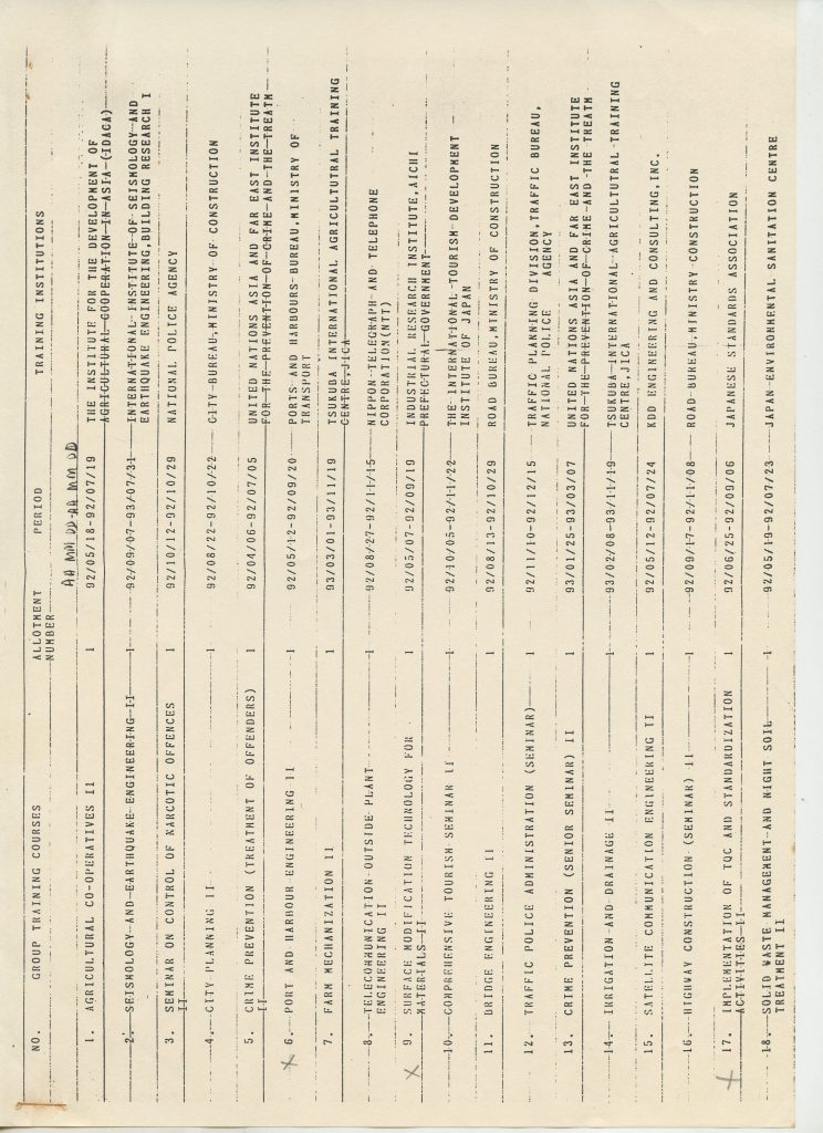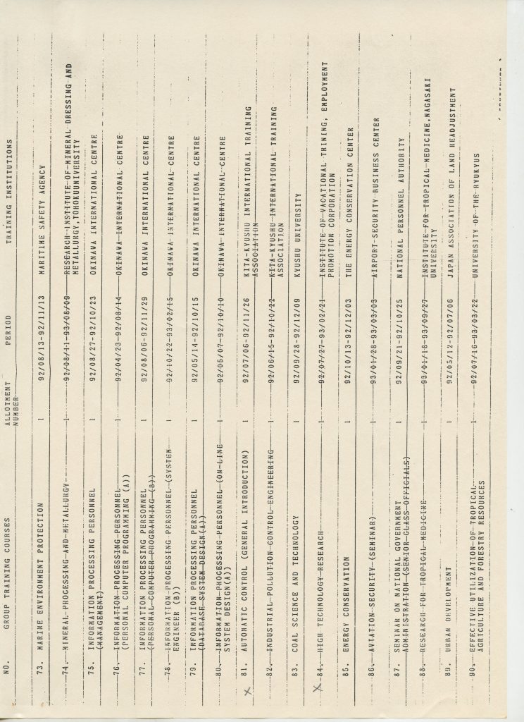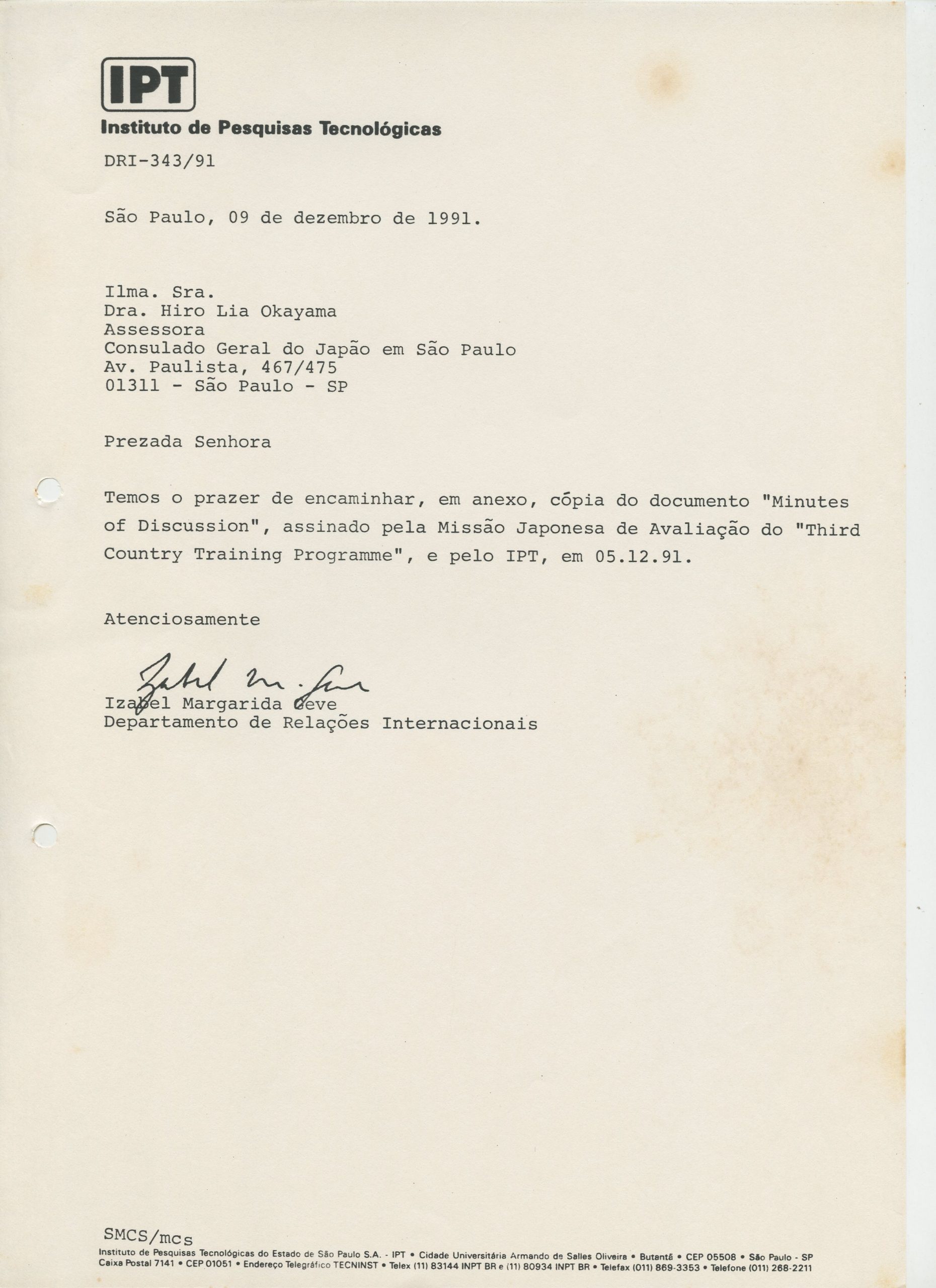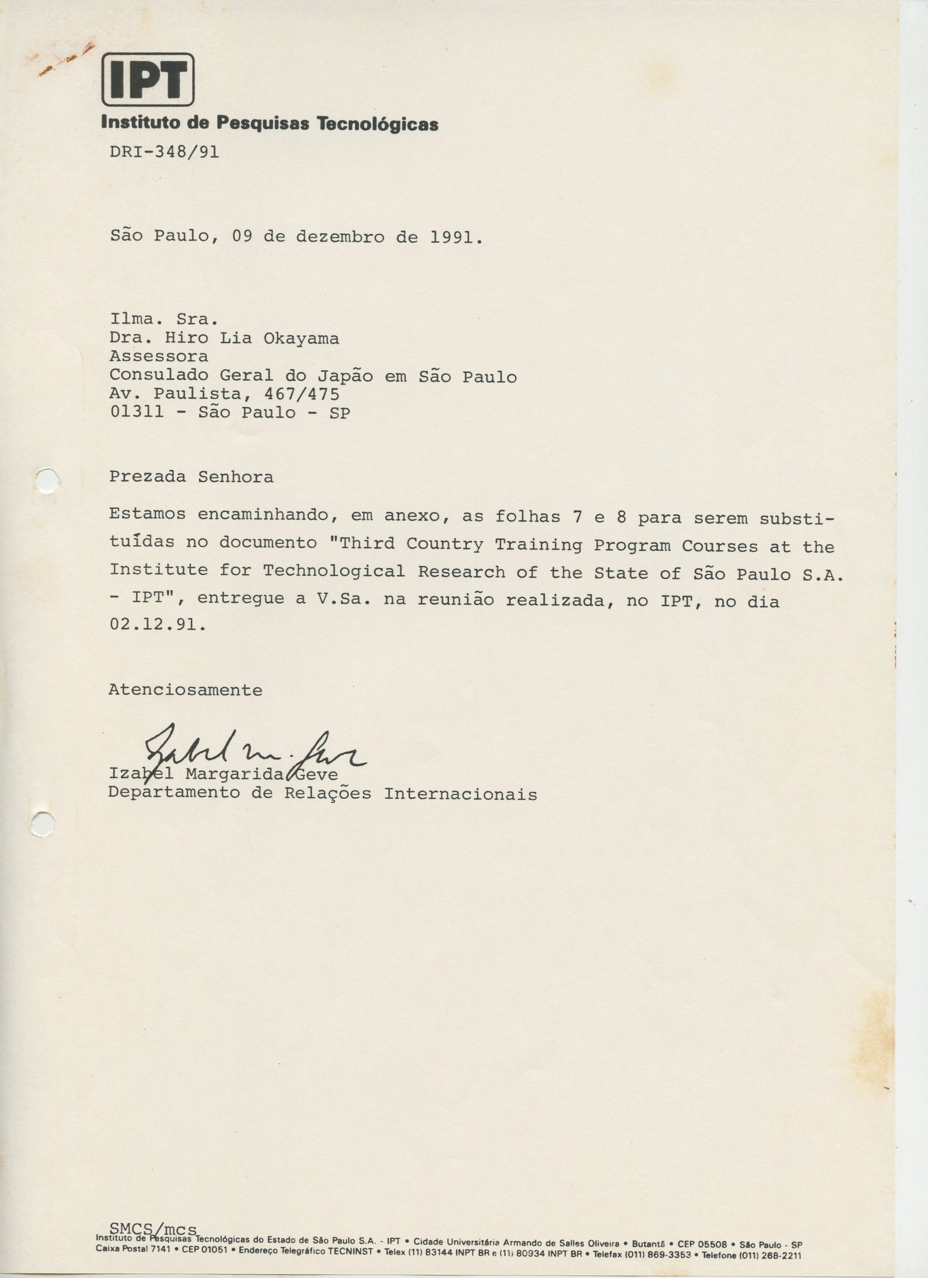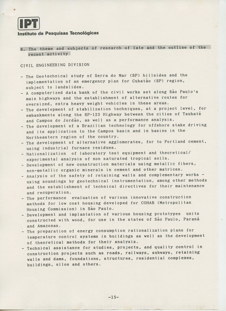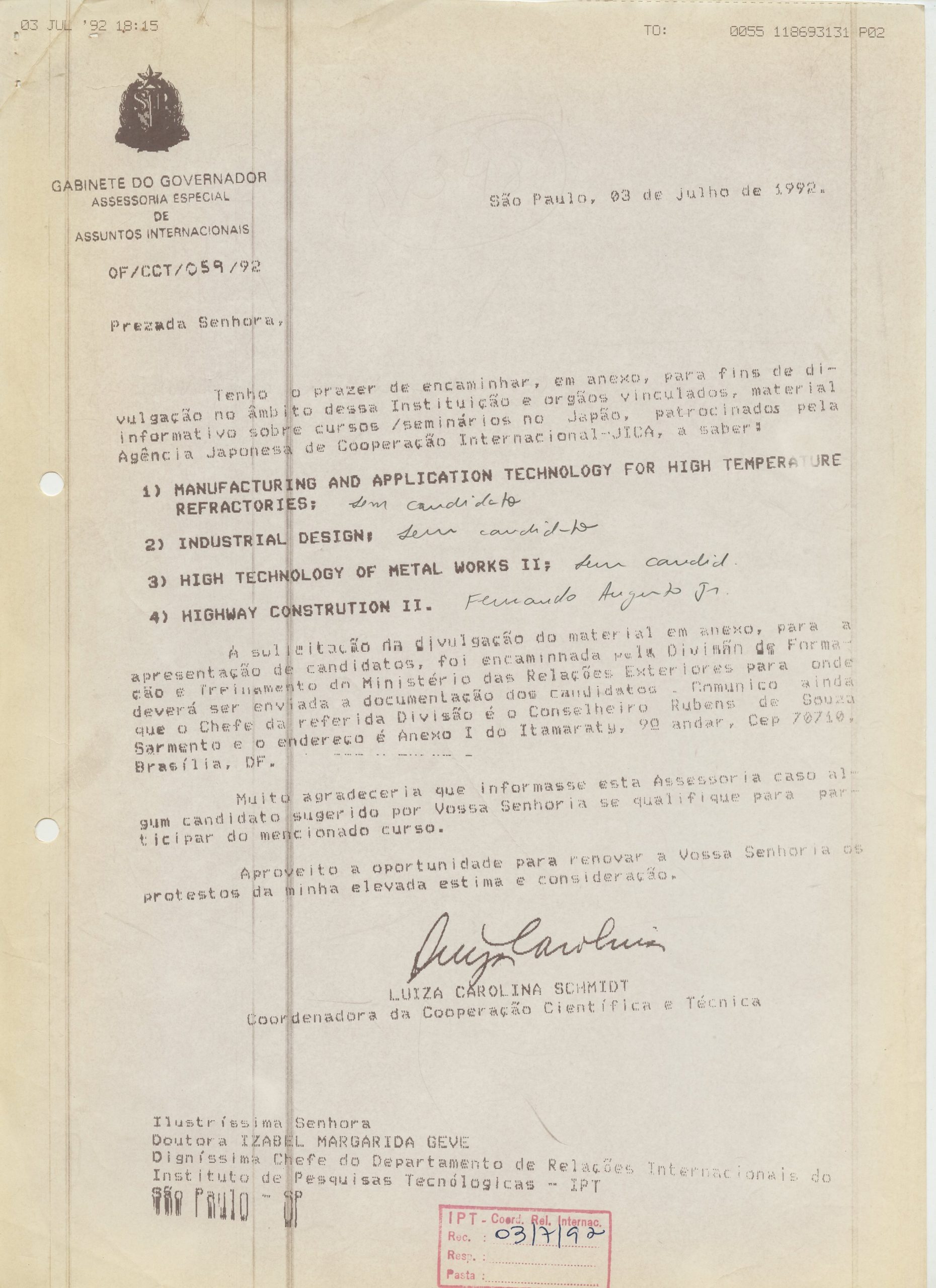 Correspondências gerais da JICA (fax, cartas, memorandos) sobre o comitê, seminários, cursos, relatórios, treinamentos e avaliações. Documentos sem relação e de assuntos diversos: bilhete solicitando doação a empresa Asahi Chemical Industry Co. Ltd., requisição de desembaraço aduaneiro de materiais e equipamentos, bilhete contendo telefone e endereço do Conselheiro Rubens de Souza Sarmento, folheto da campanha do agasalho, cópia de cartão de visita, e cartão de sugestão.