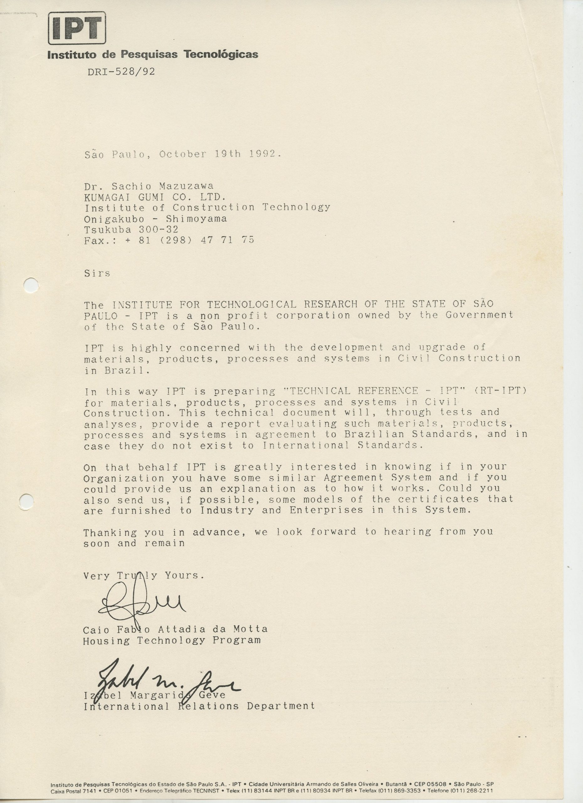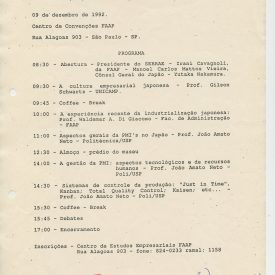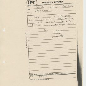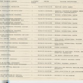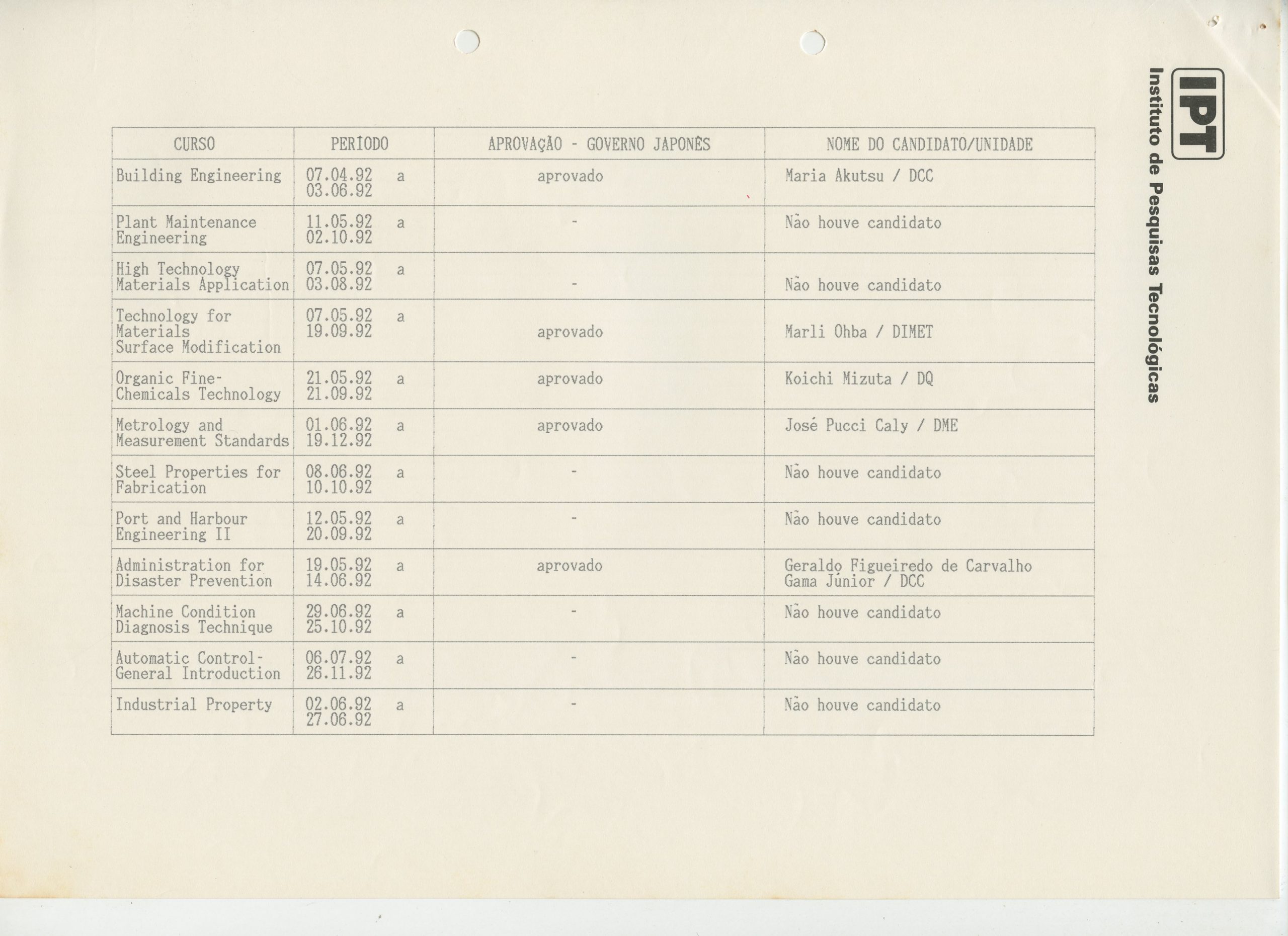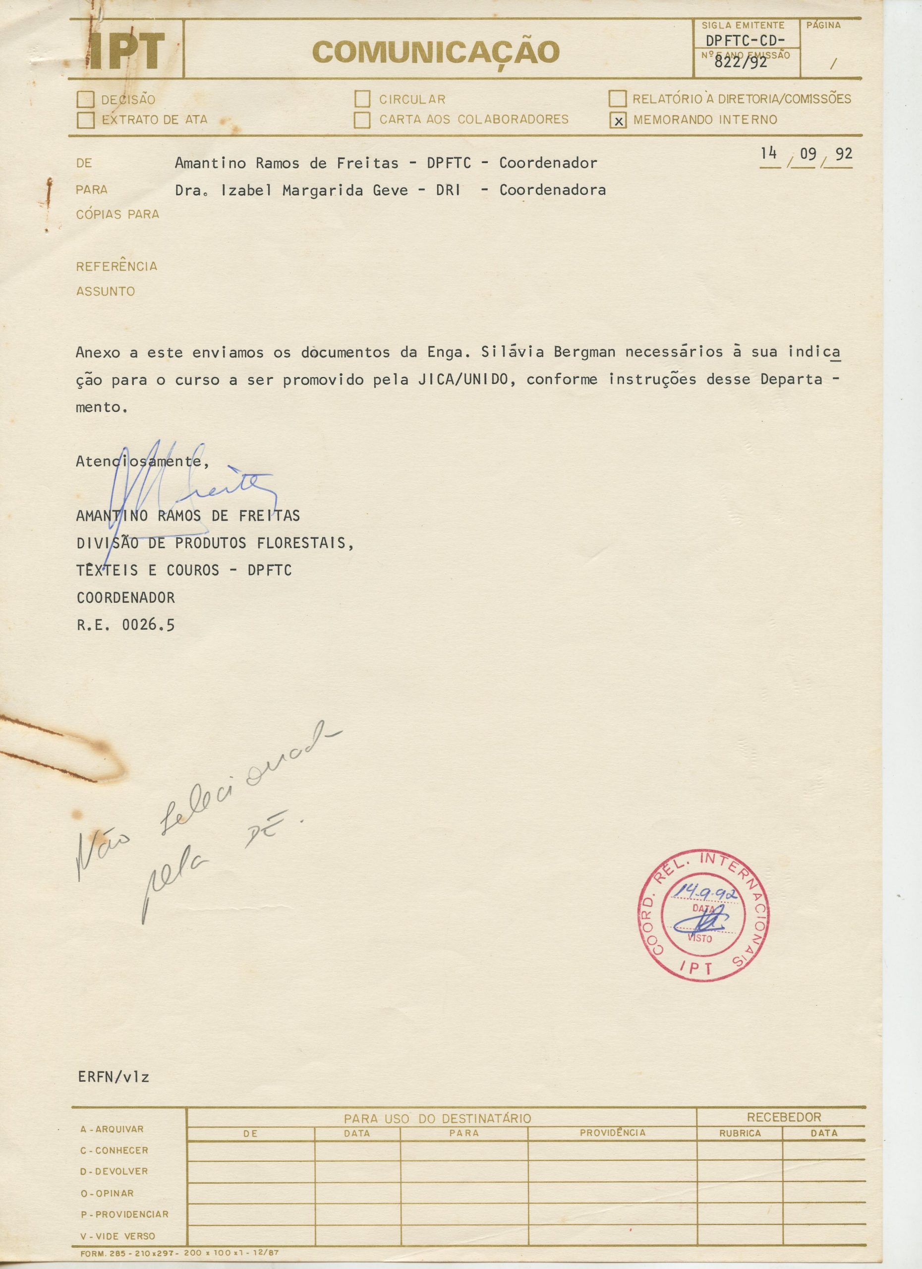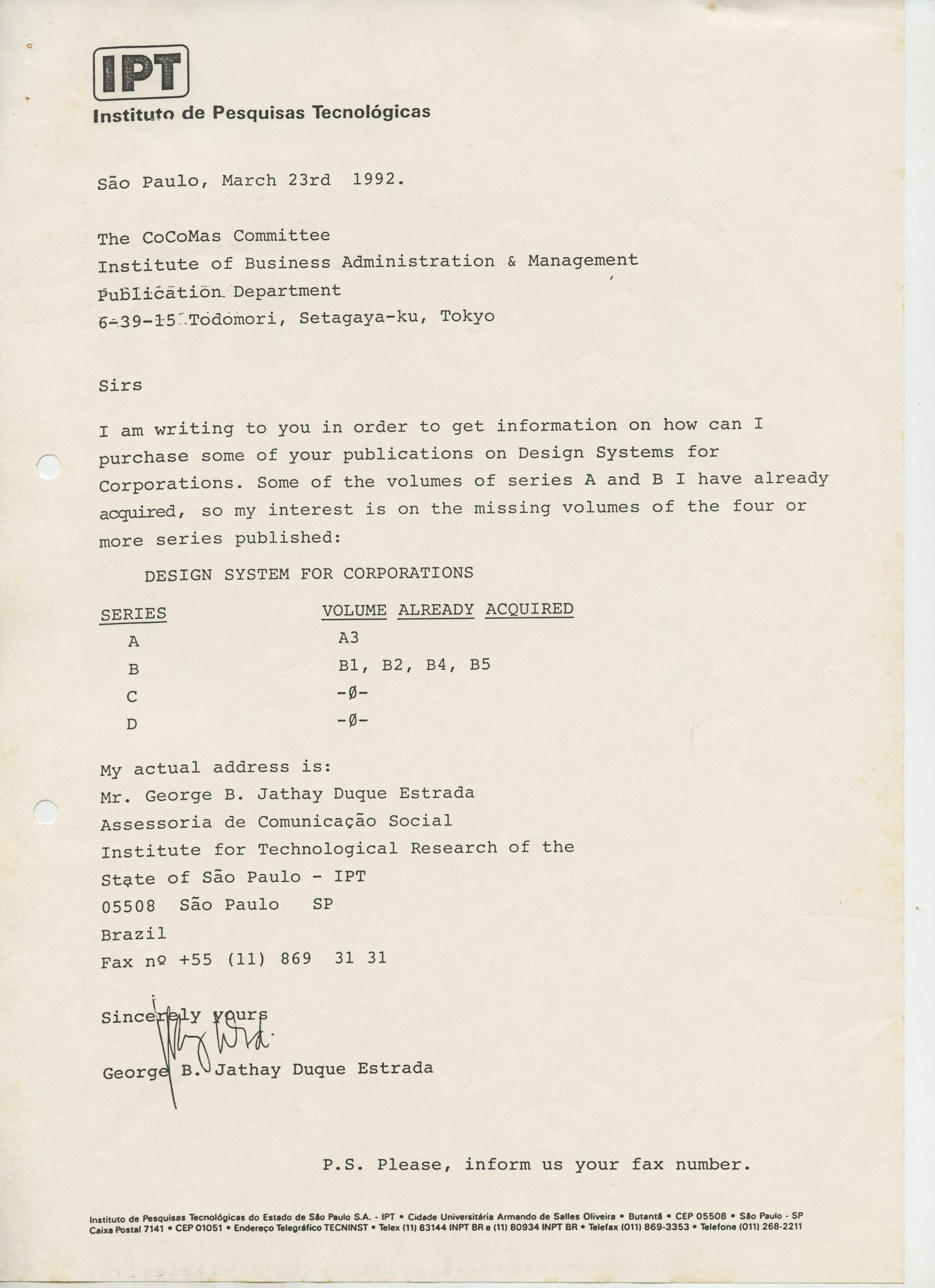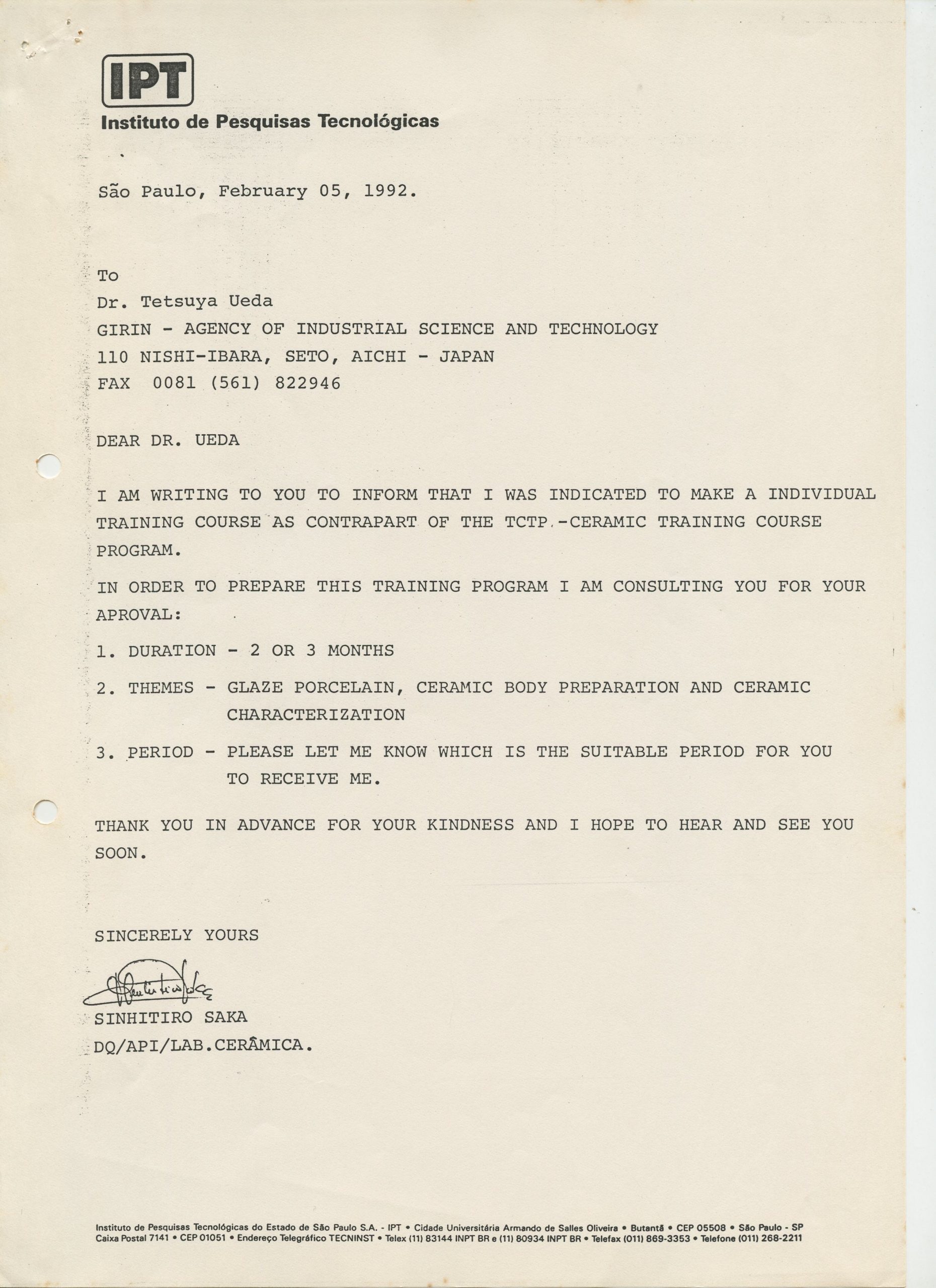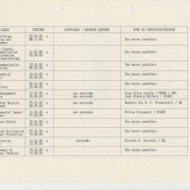 Correspondências gerais da JICA (fax, cartas, memorandos) sobre o comitê, seminários, cursos, relatórios, treinamentos e avaliações. Documentos sem relação e de assuntos diversos: bilhete solicitando doação a empresa Asahi Chemical Industry Co. Ltd., requisição de desembaraço aduaneiro de materiais e equipamentos, bilhete contendo telefone e endereço do Conselheiro Rubens de Souza Sarmento, folheto da campanha do agasalho, cópia de cartão de visita, e cartão de sugestão.