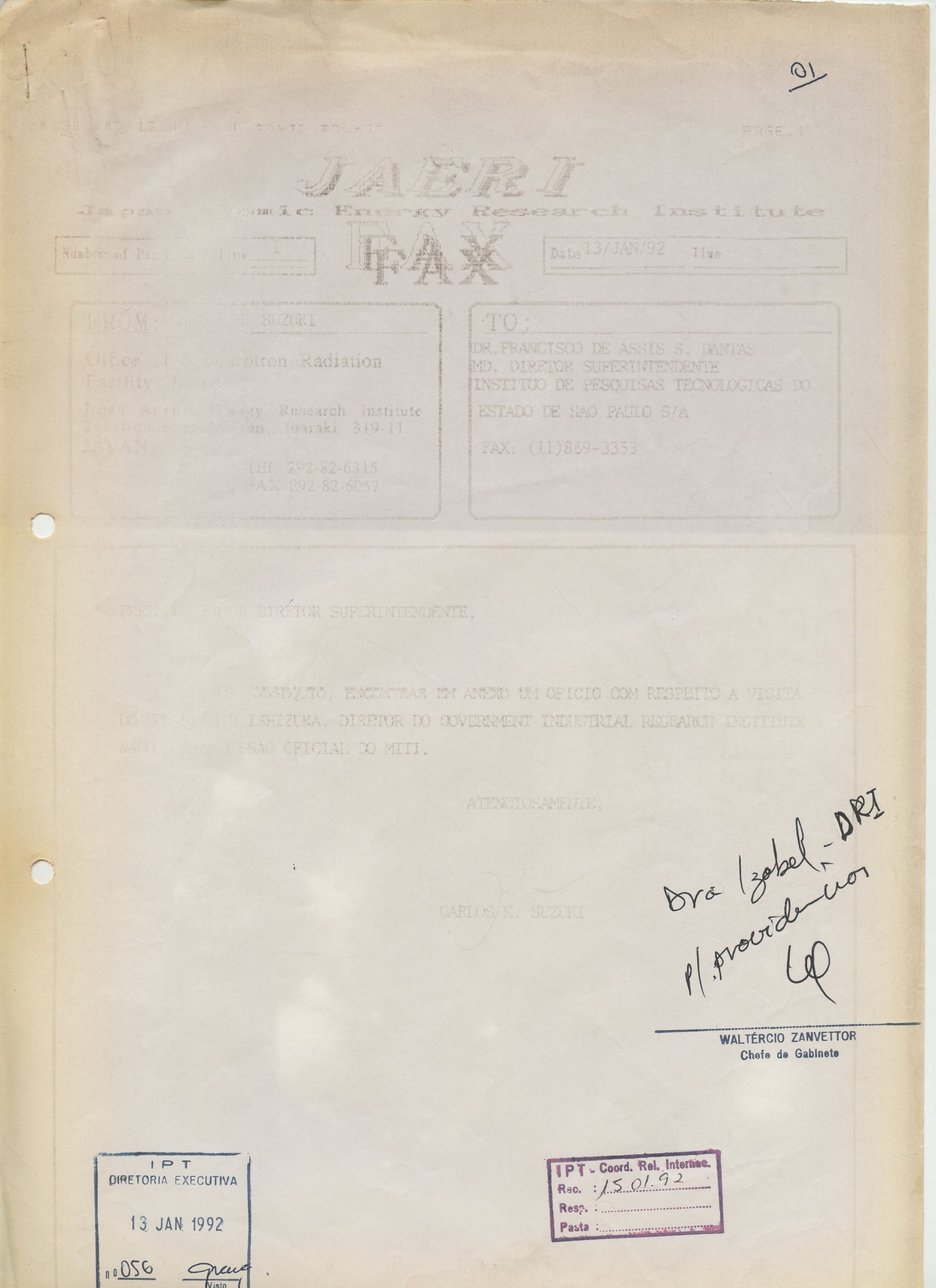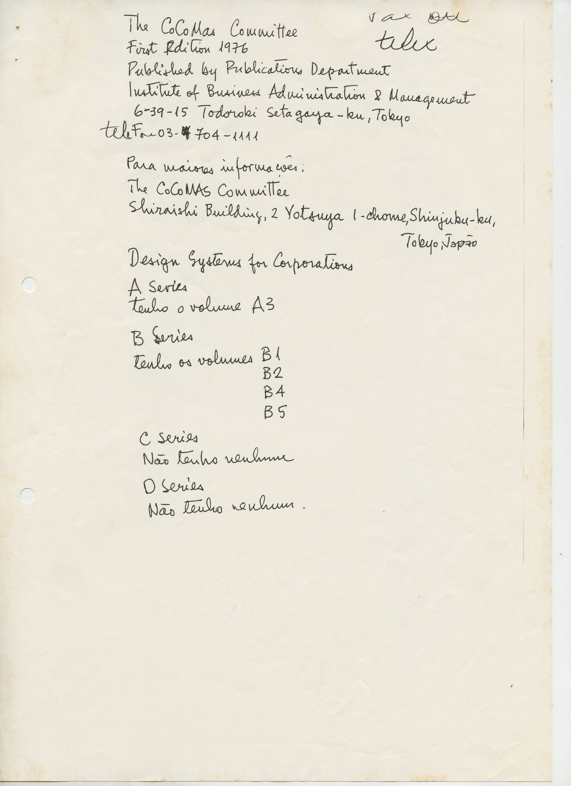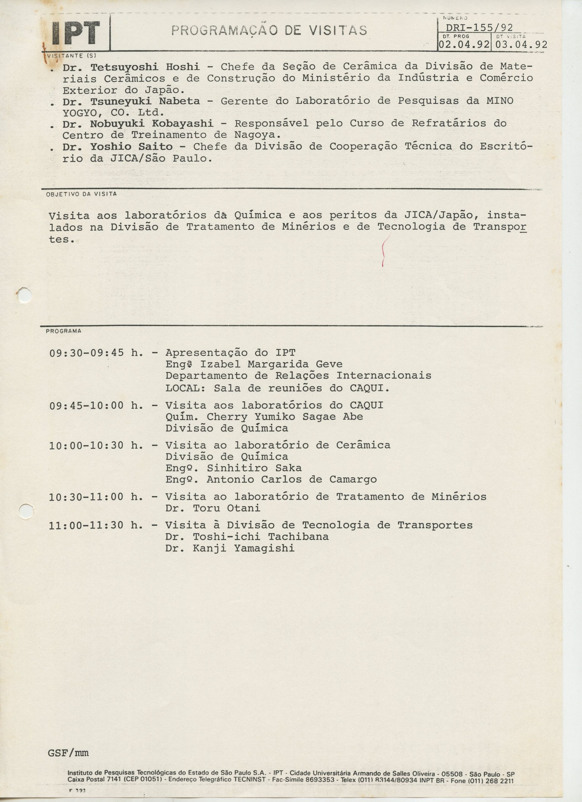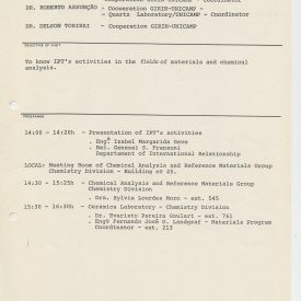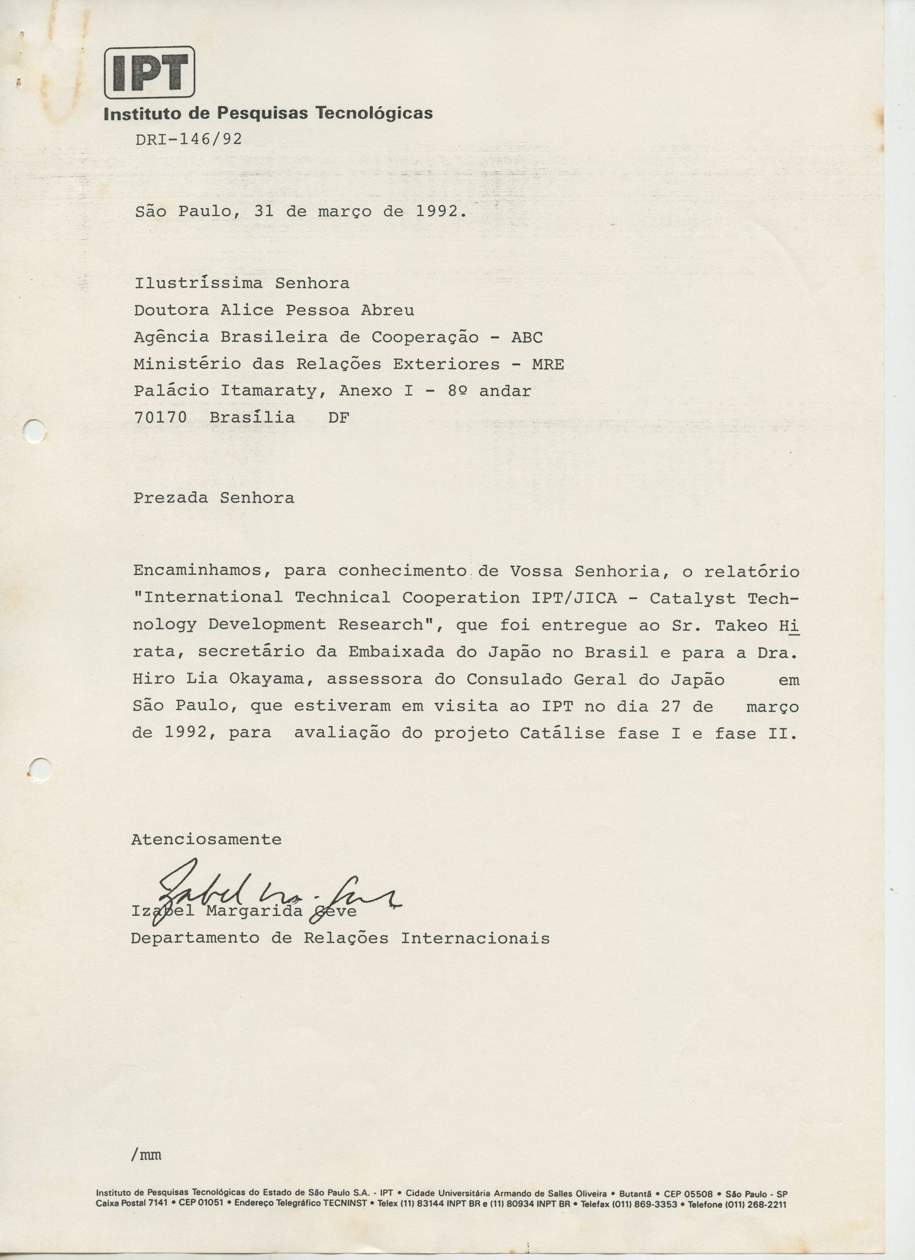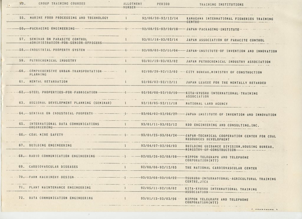 Correspondências gerais da JICA (fax, cartas, memorandos) sobre o comitê, seminários, cursos, relatórios, treinamentos e avaliações. Documentos sem relação e de assuntos diversos: bilhete solicitando doação a empresa Asahi Chemical Industry Co. Ltd., requisição de desembaraço aduaneiro de materiais e equipamentos, bilhete contendo telefone e endereço do Conselheiro Rubens de Souza Sarmento, folheto da campanha do agasalho, cópia de cartão de visita, e cartão de sugestão.