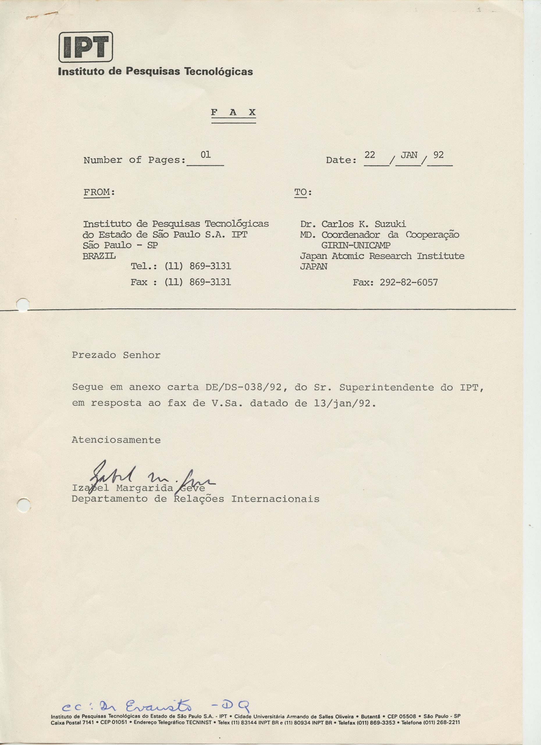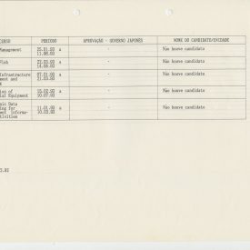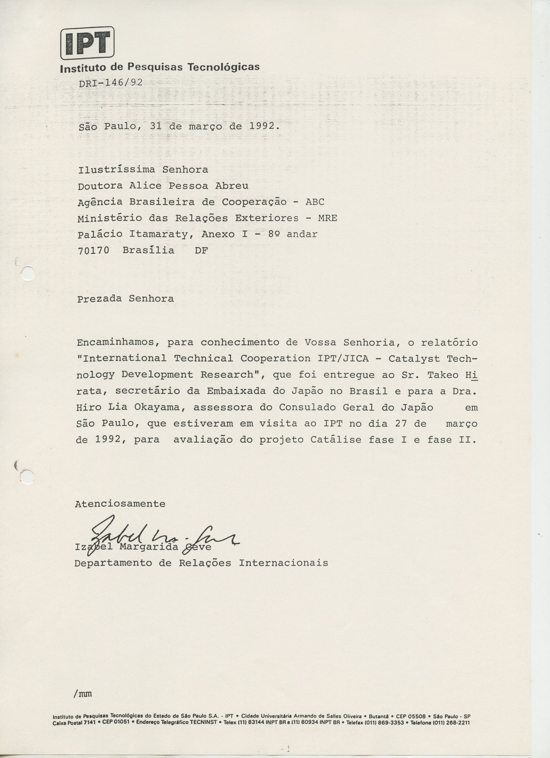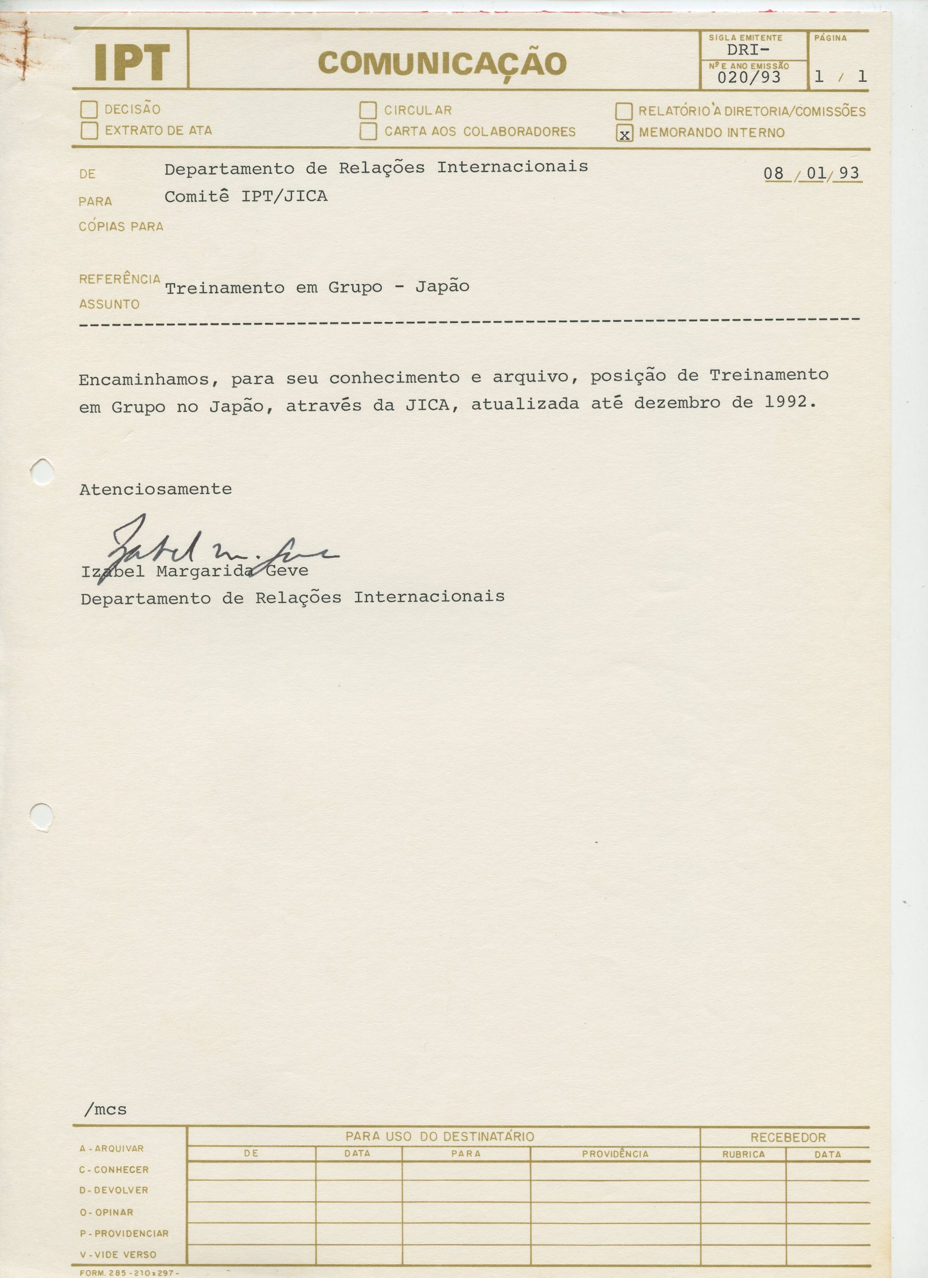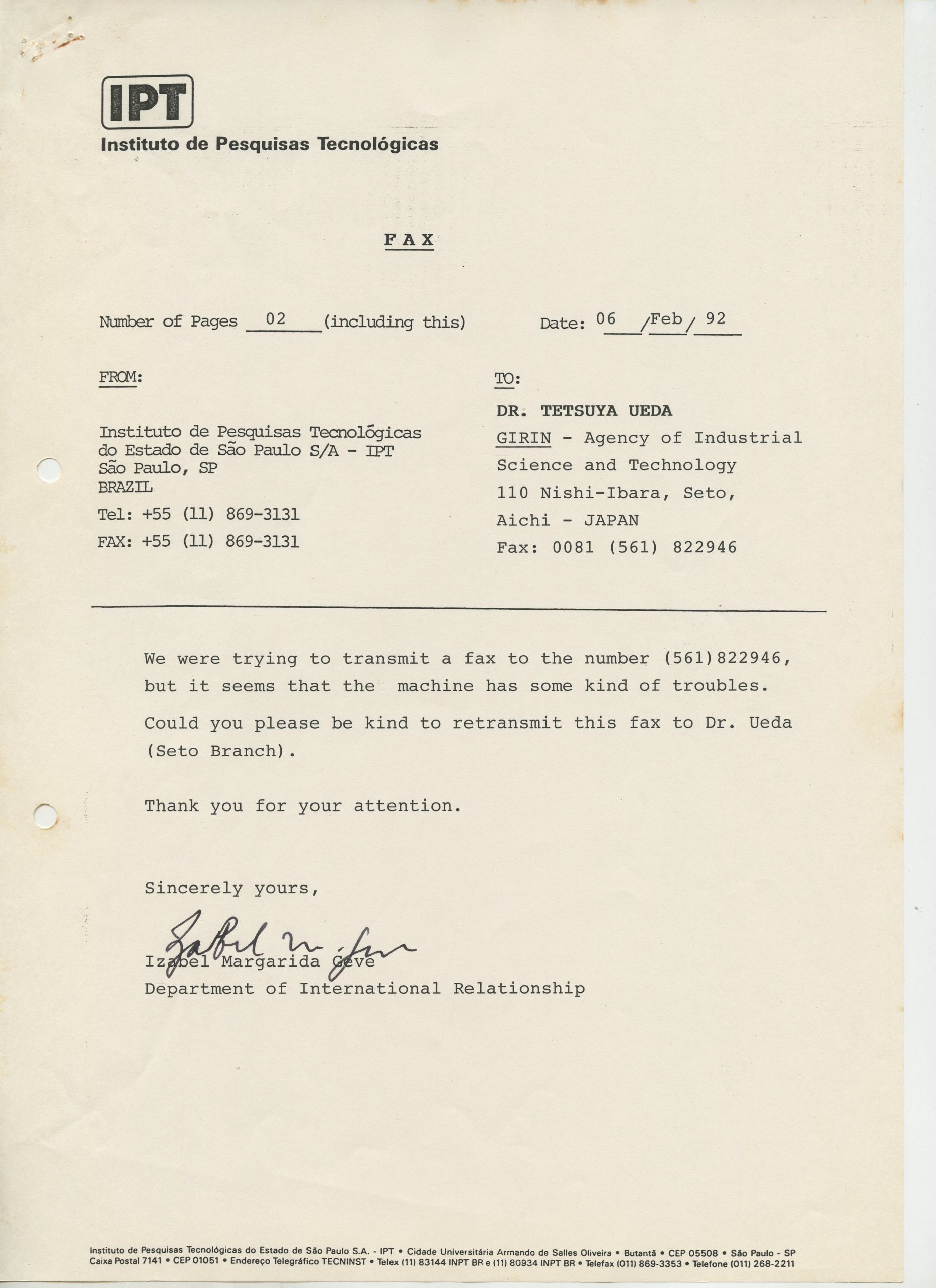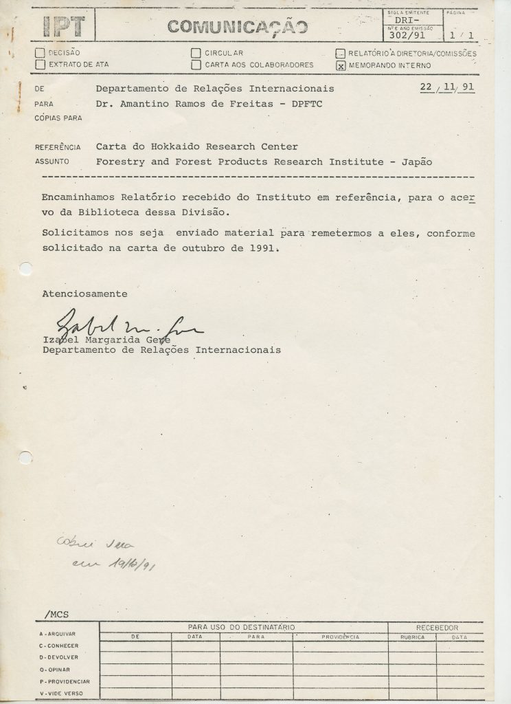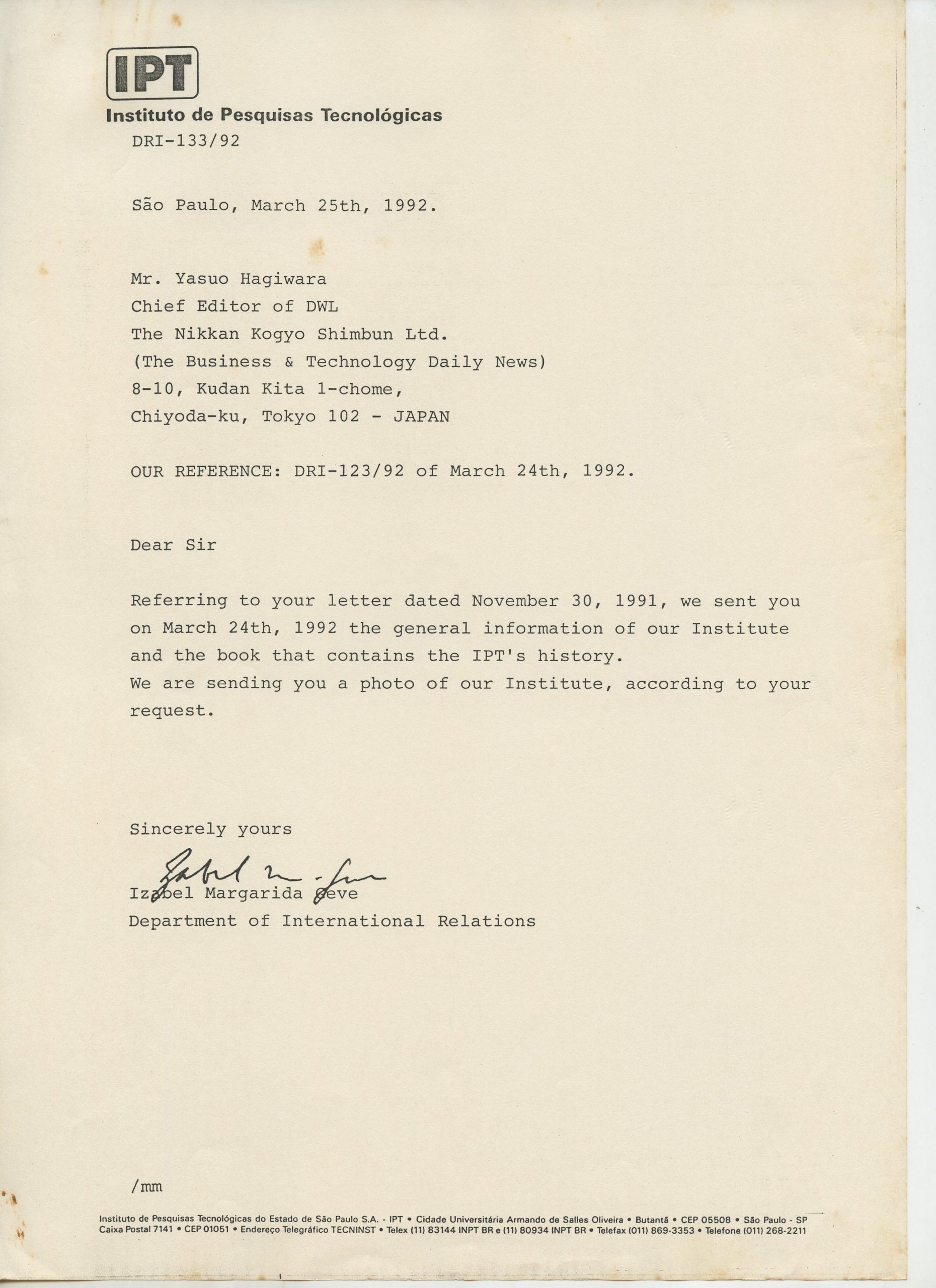 Correspondências gerais da JICA (fax, cartas, memorandos) sobre o comitê, seminários, cursos, relatórios, treinamentos e avaliações. Documentos sem relação e de assuntos diversos: bilhete solicitando doação a empresa Asahi Chemical Industry Co. Ltd., requisição de desembaraço aduaneiro de materiais e equipamentos, bilhete contendo telefone e endereço do Conselheiro Rubens de Souza Sarmento, folheto da campanha do agasalho, cópia de cartão de visita, e cartão de sugestão.