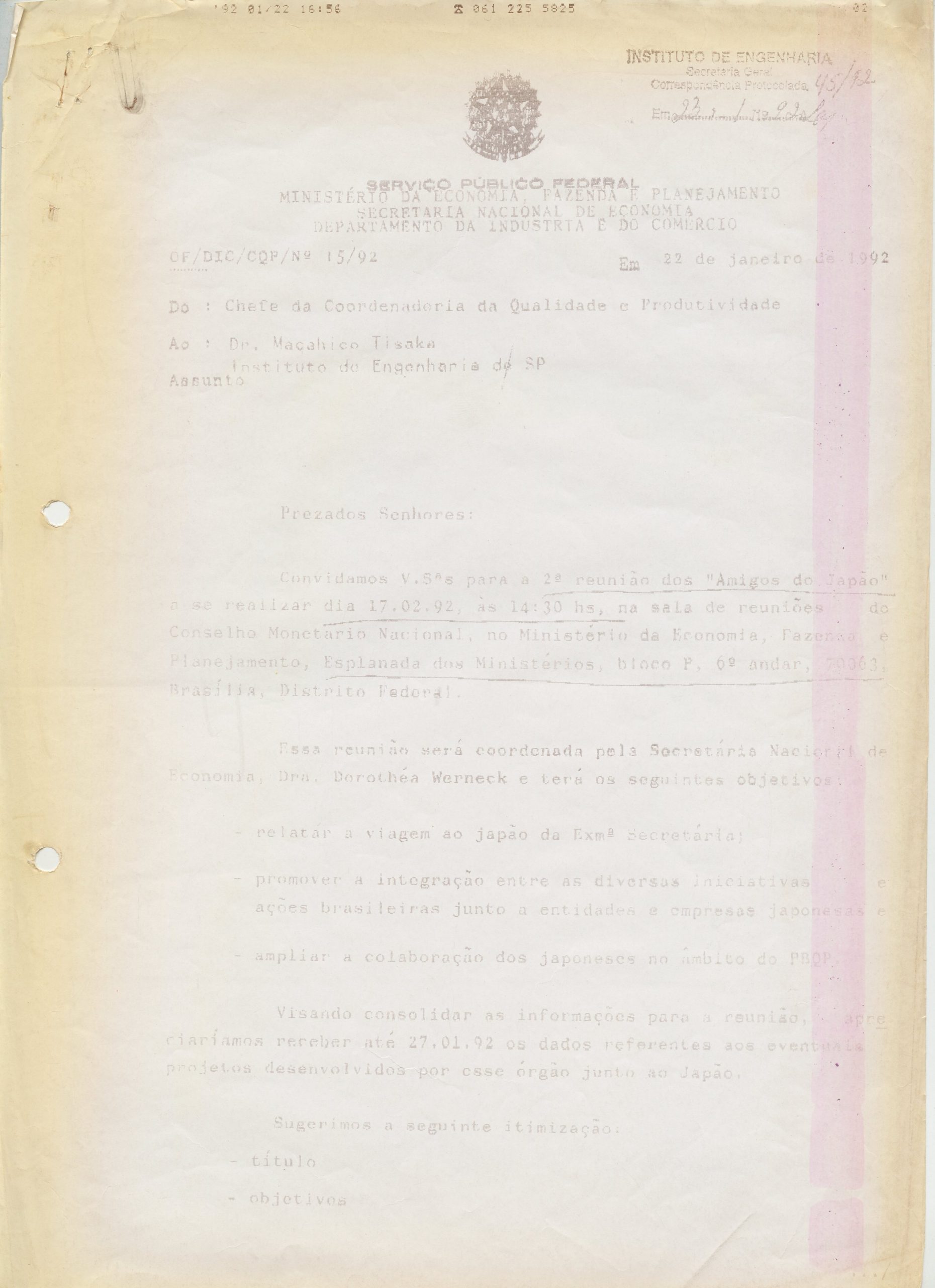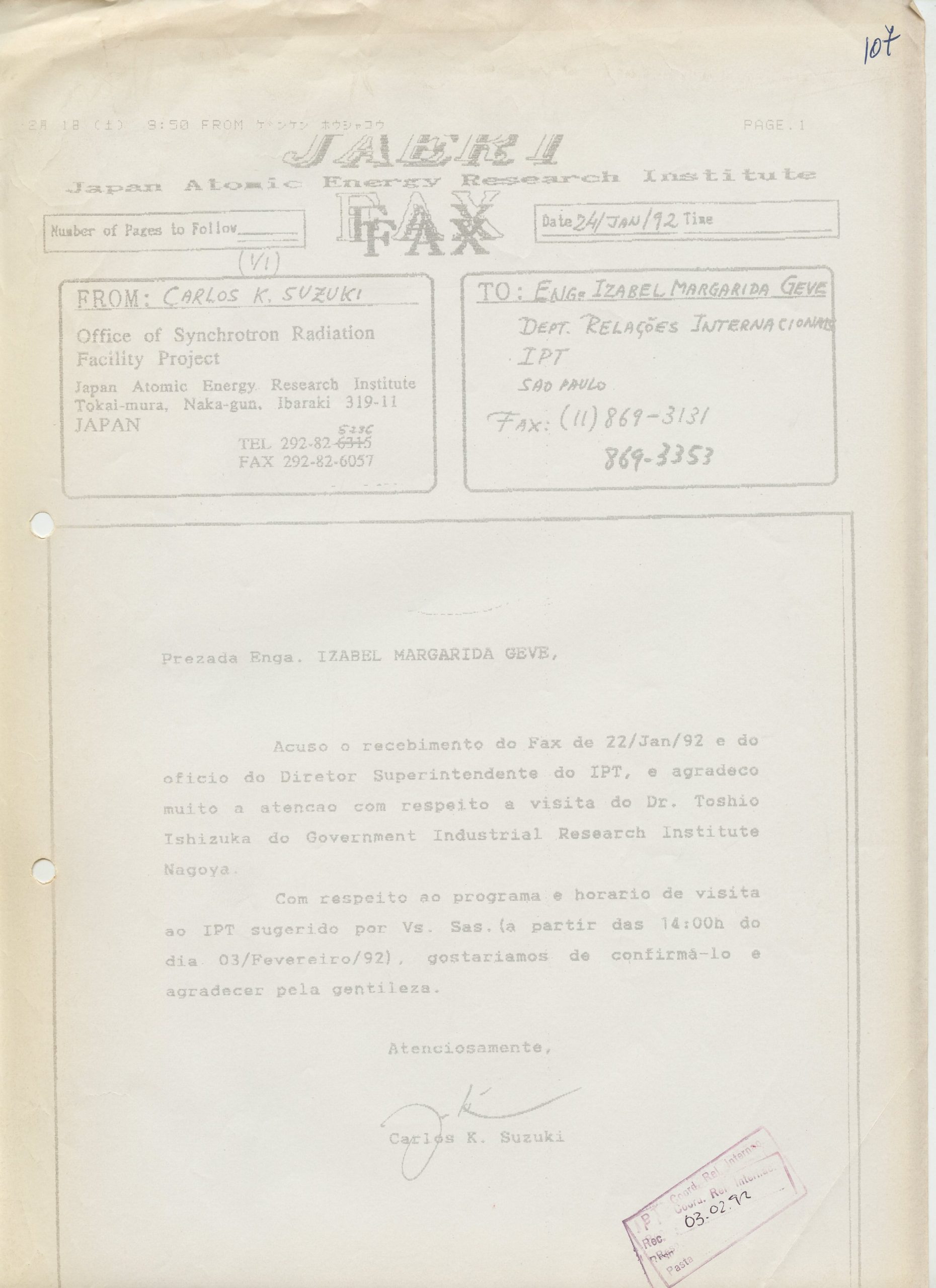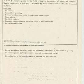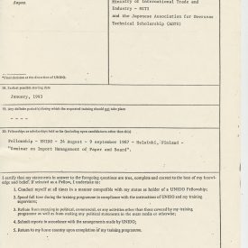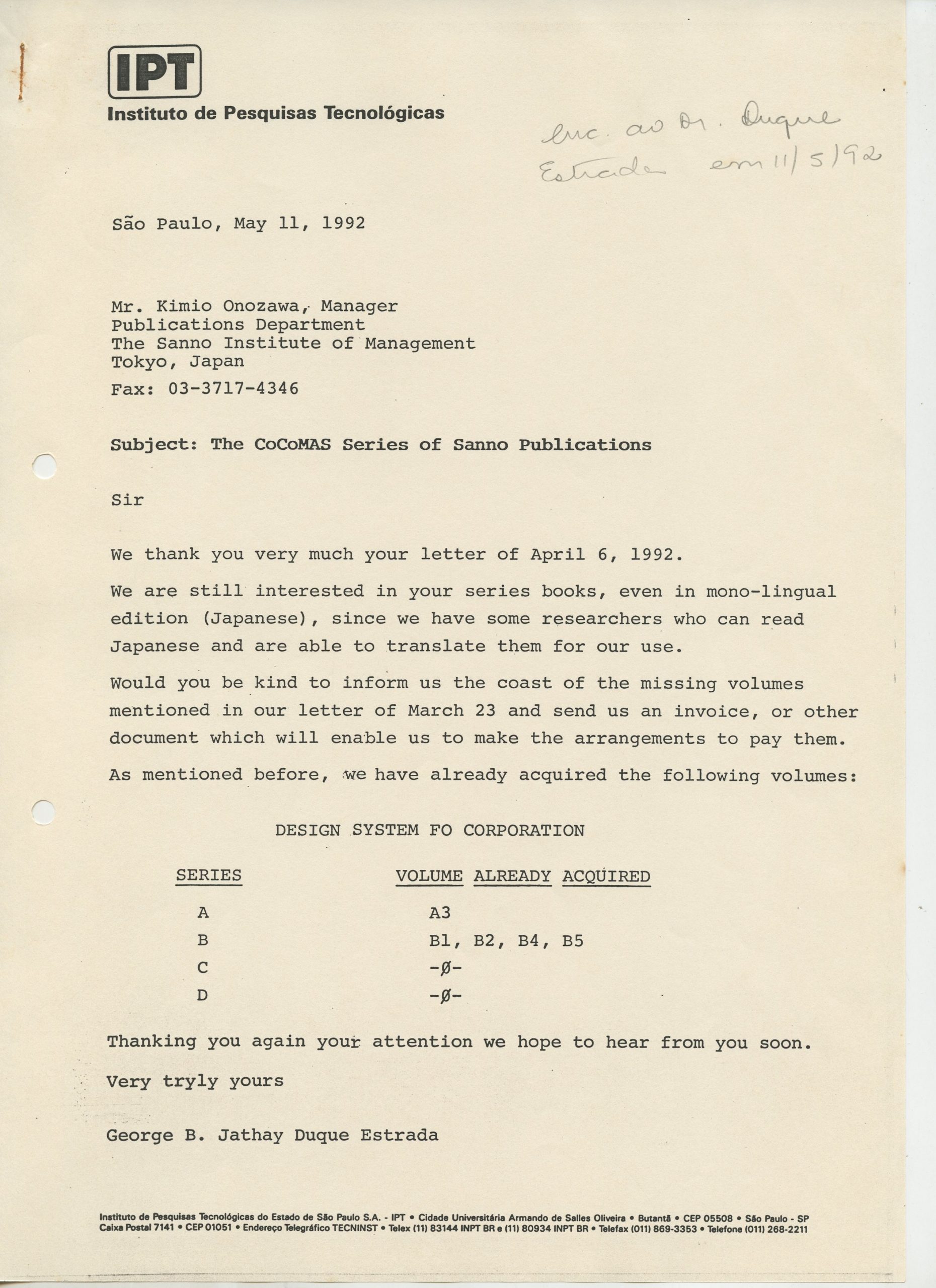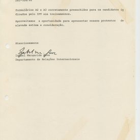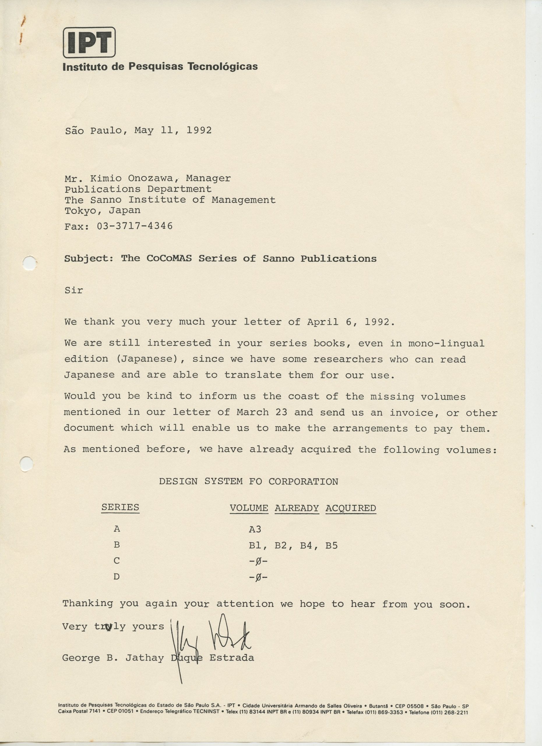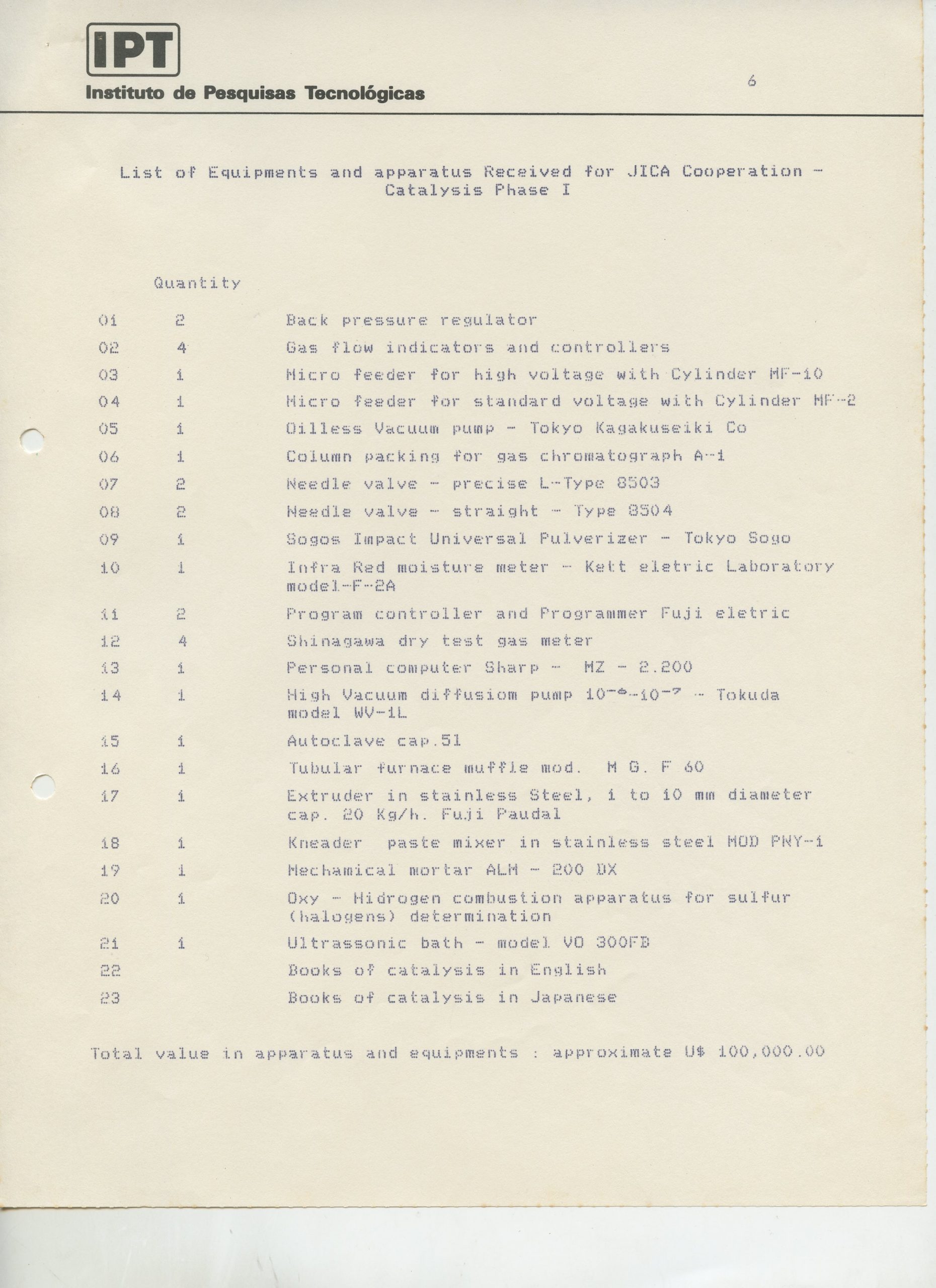 Correspondências gerais da JICA (fax, cartas, memorandos) sobre o comitê, seminários, cursos, relatórios, treinamentos e avaliações. Documentos sem relação e de assuntos diversos: bilhete solicitando doação a empresa Asahi Chemical Industry Co. Ltd., requisição de desembaraço aduaneiro de materiais e equipamentos, bilhete contendo telefone e endereço do Conselheiro Rubens de Souza Sarmento, folheto da campanha do agasalho, cópia de cartão de visita, e cartão de sugestão.