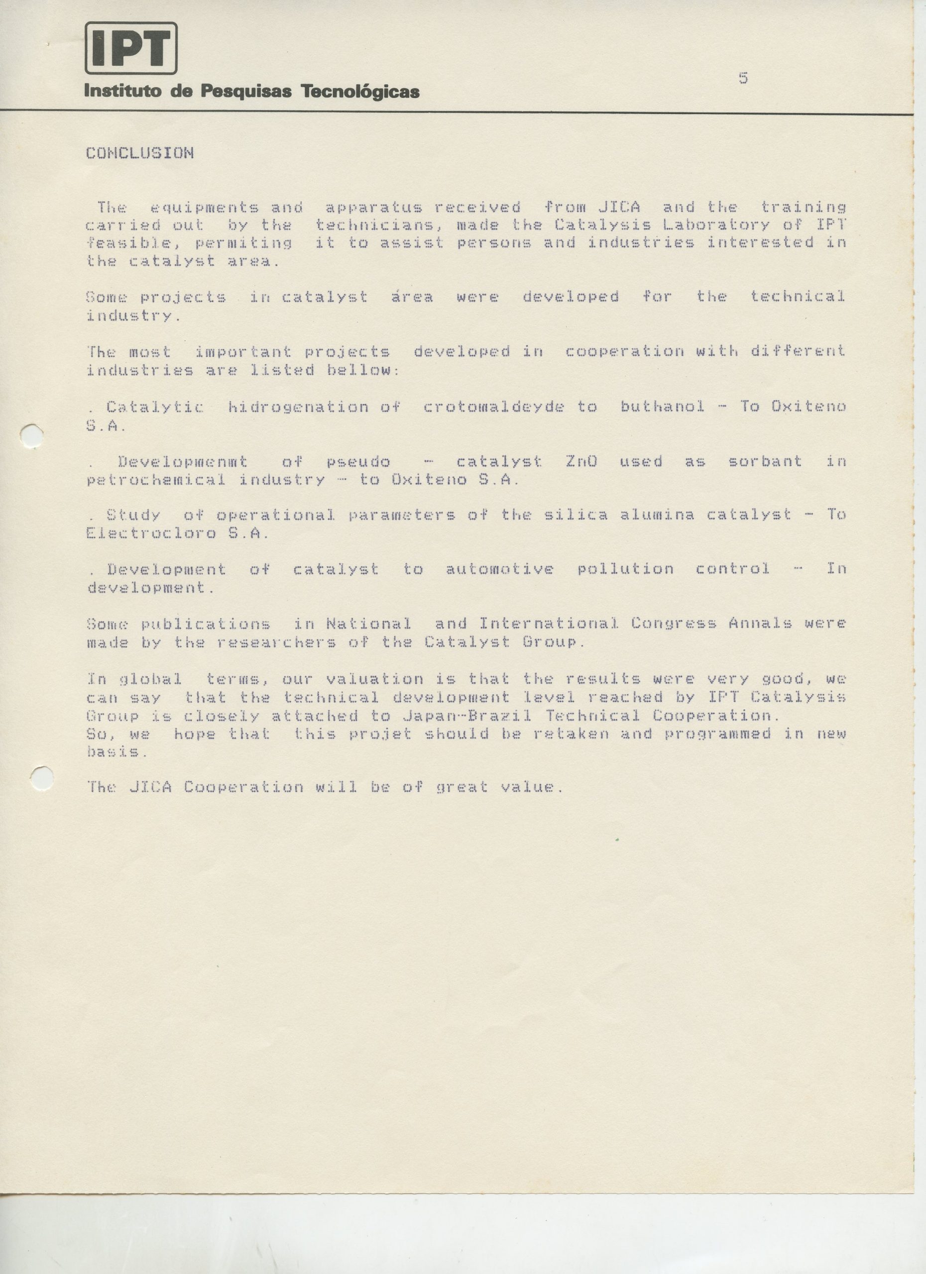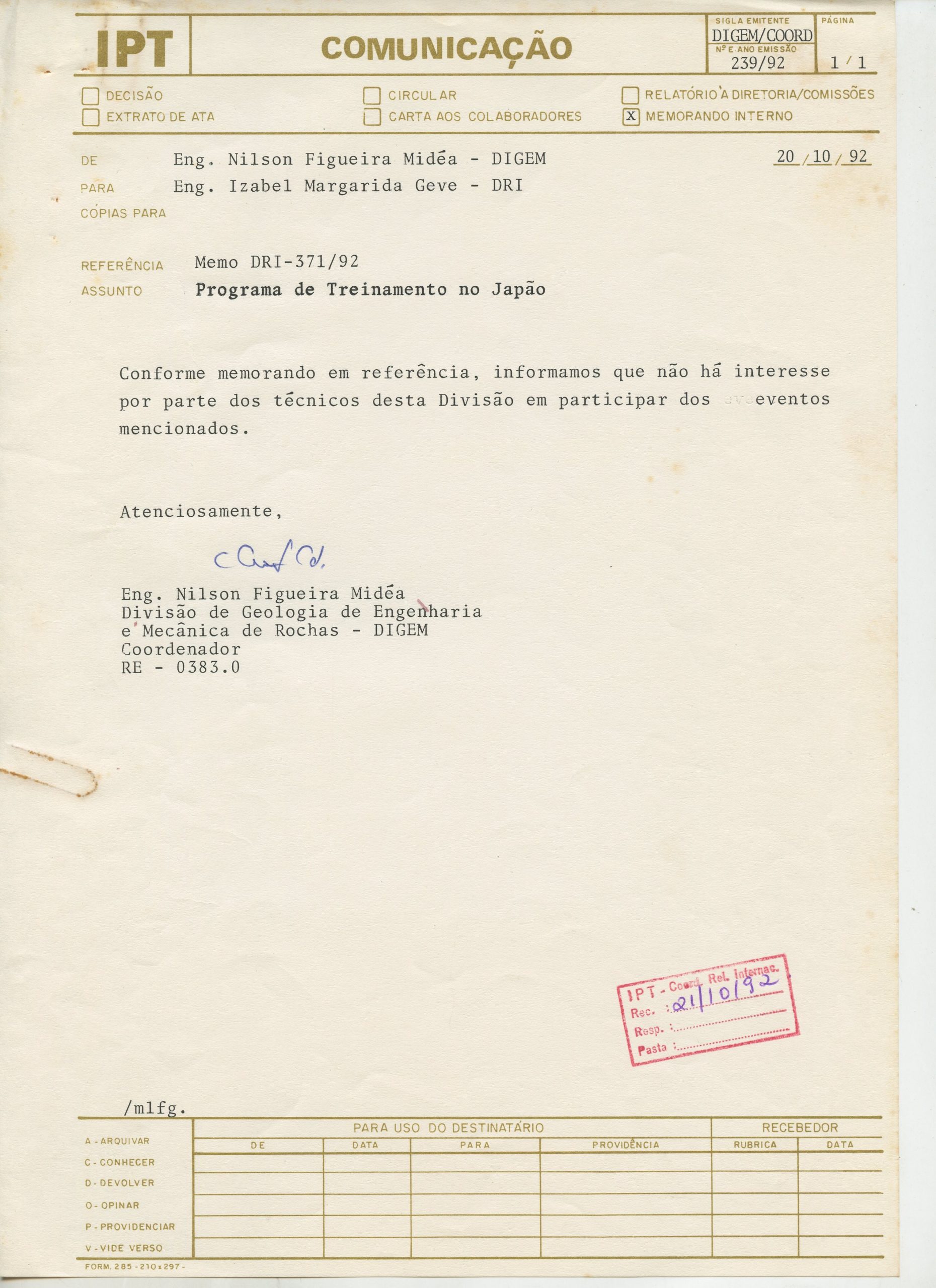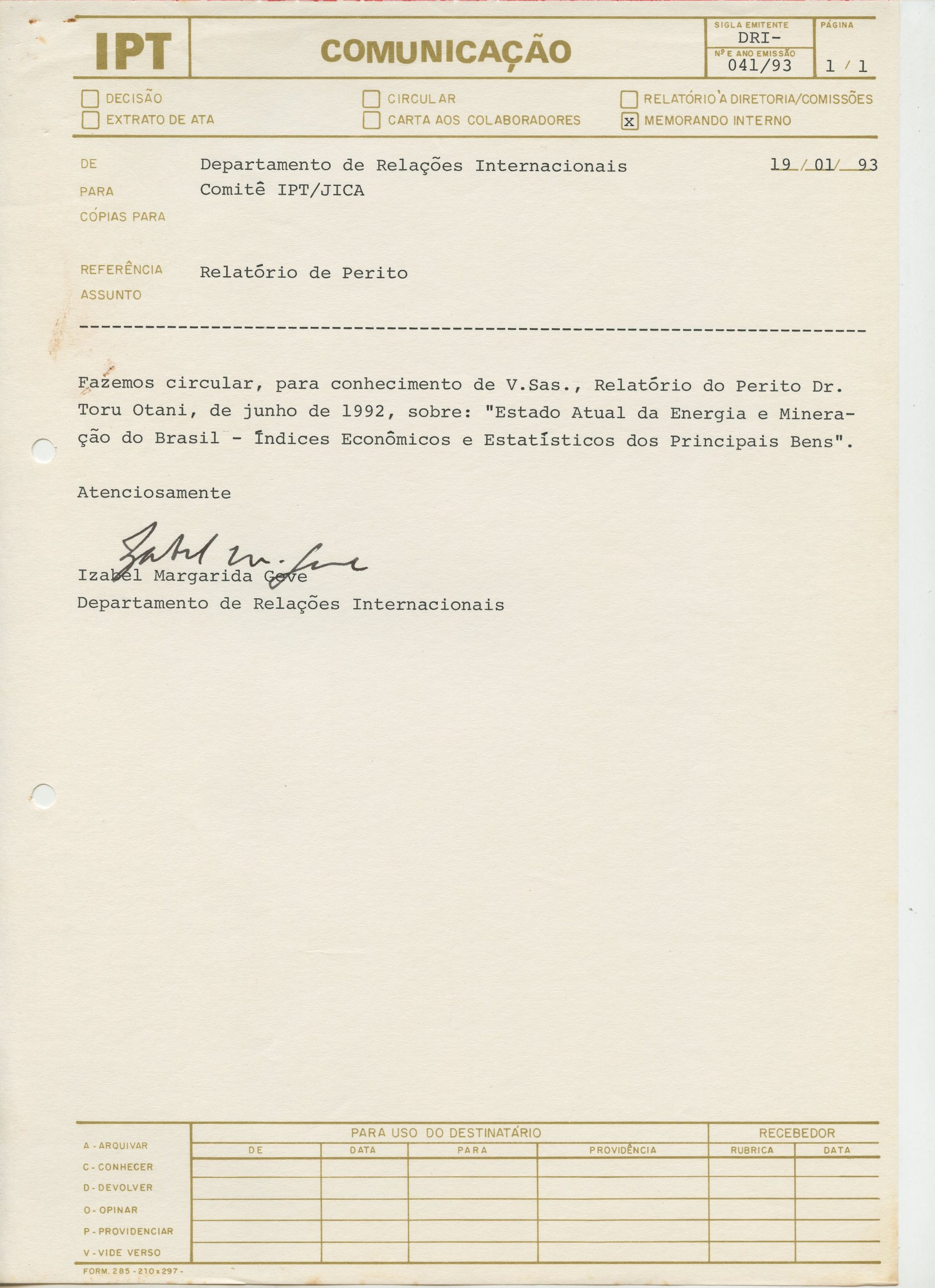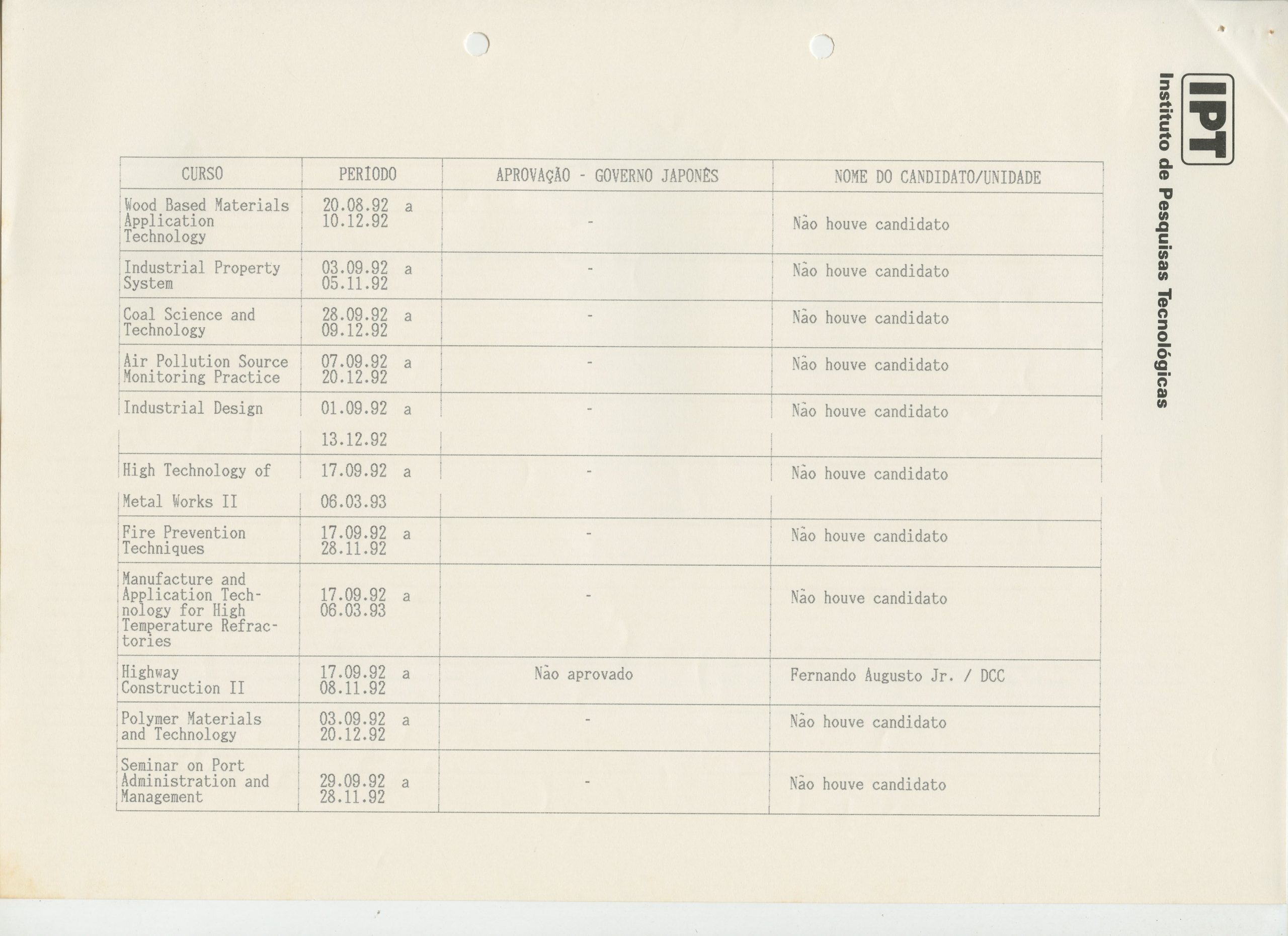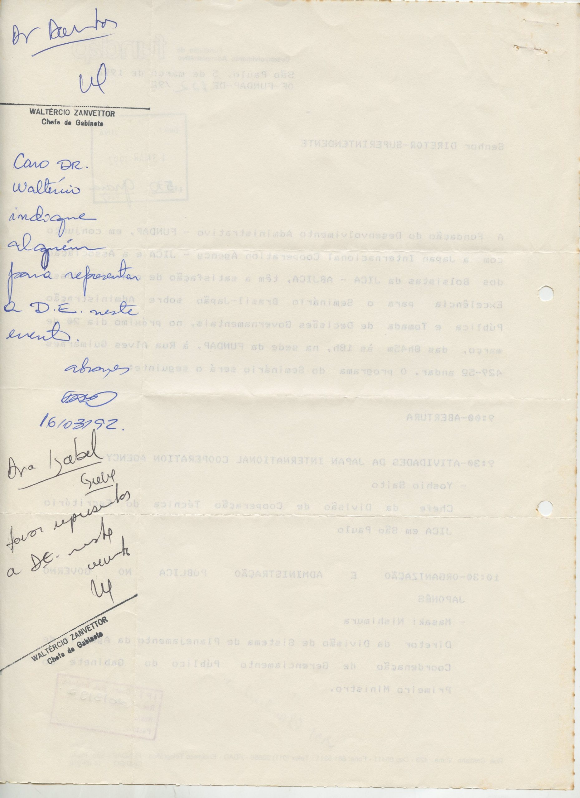 Correspondências gerais da JICA (fax, cartas, memorandos) sobre o comitê, seminários, cursos, relatórios, treinamentos e avaliações. Documentos sem relação e de assuntos diversos: bilhete solicitando doação a empresa Asahi Chemical Industry Co. Ltd., requisição de desembaraço aduaneiro de materiais e equipamentos, bilhete contendo telefone e endereço do Conselheiro Rubens de Souza Sarmento, folheto da campanha do agasalho, cópia de cartão de visita, e cartão de sugestão.