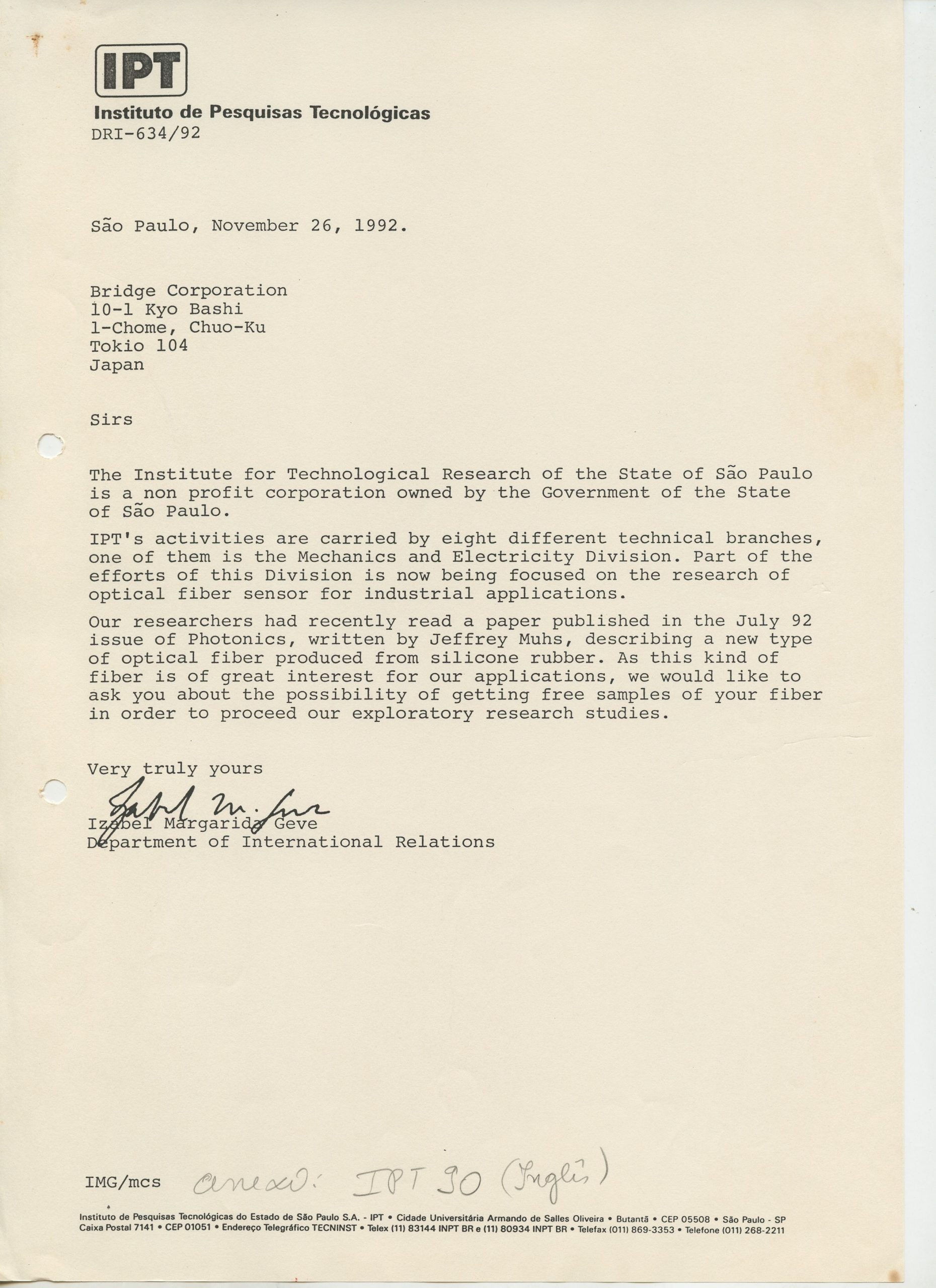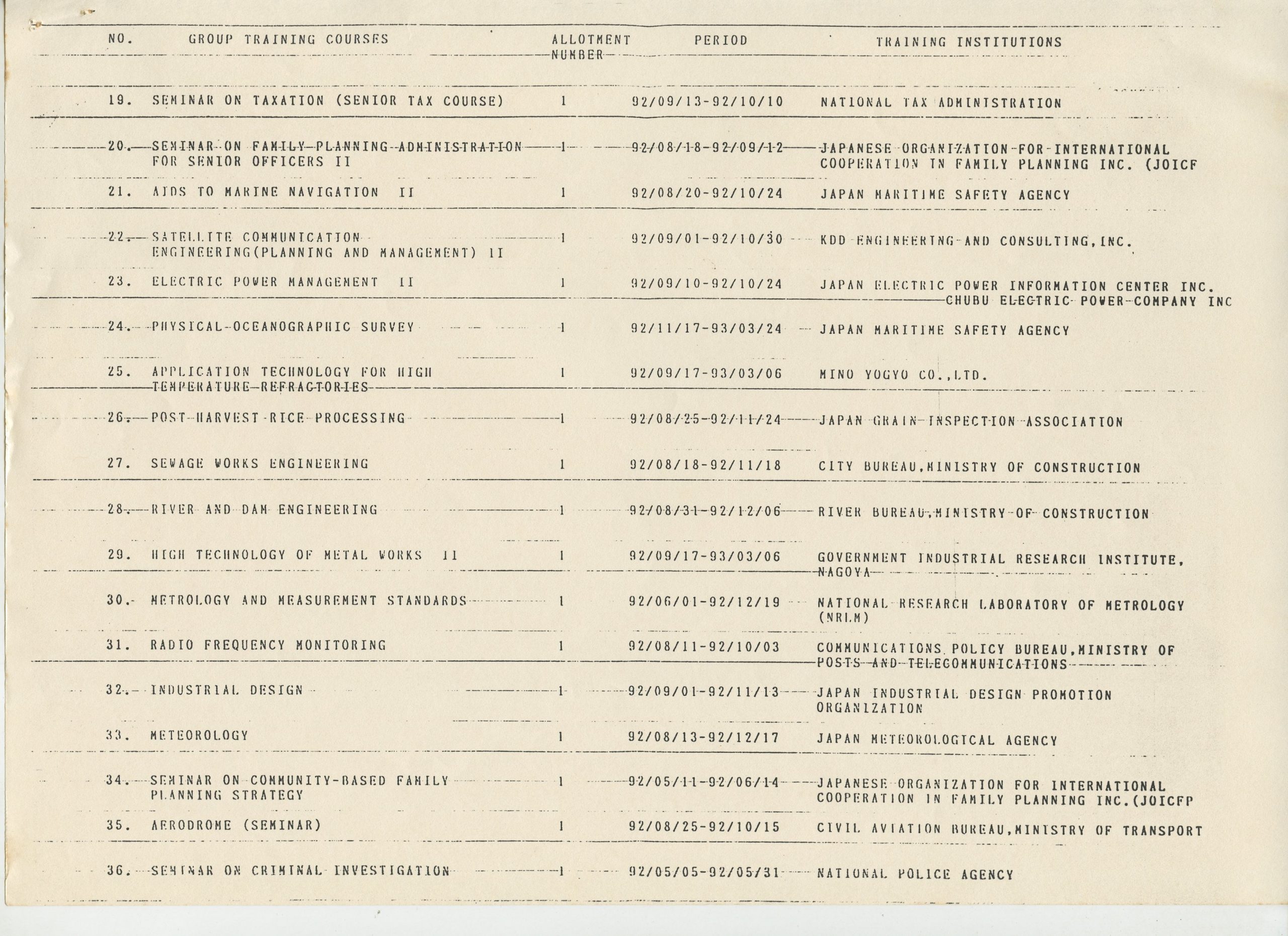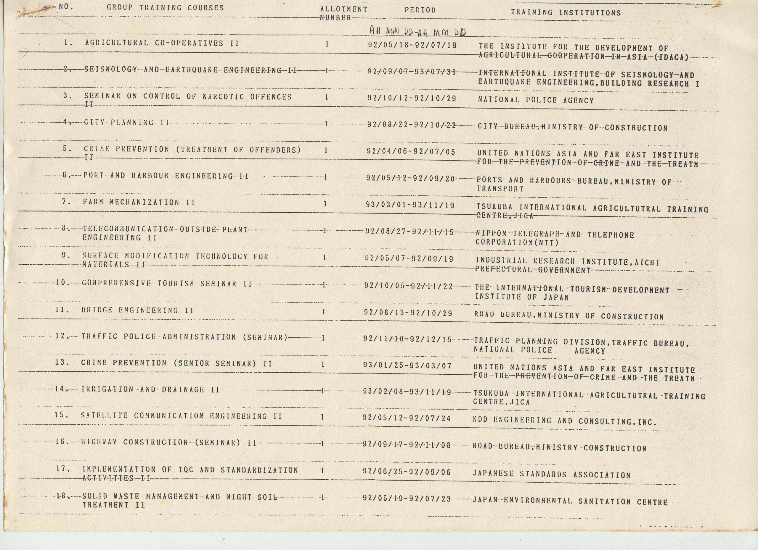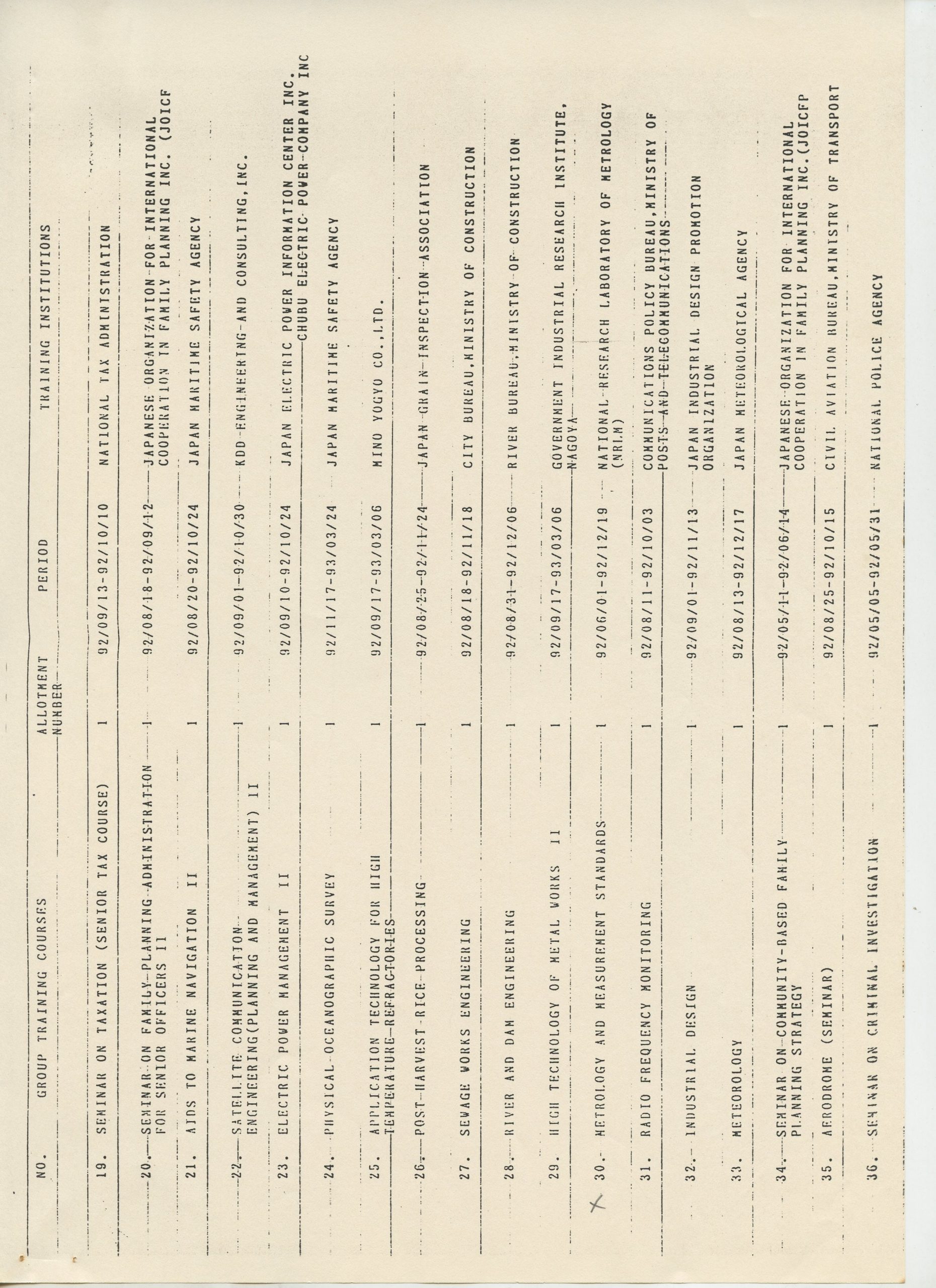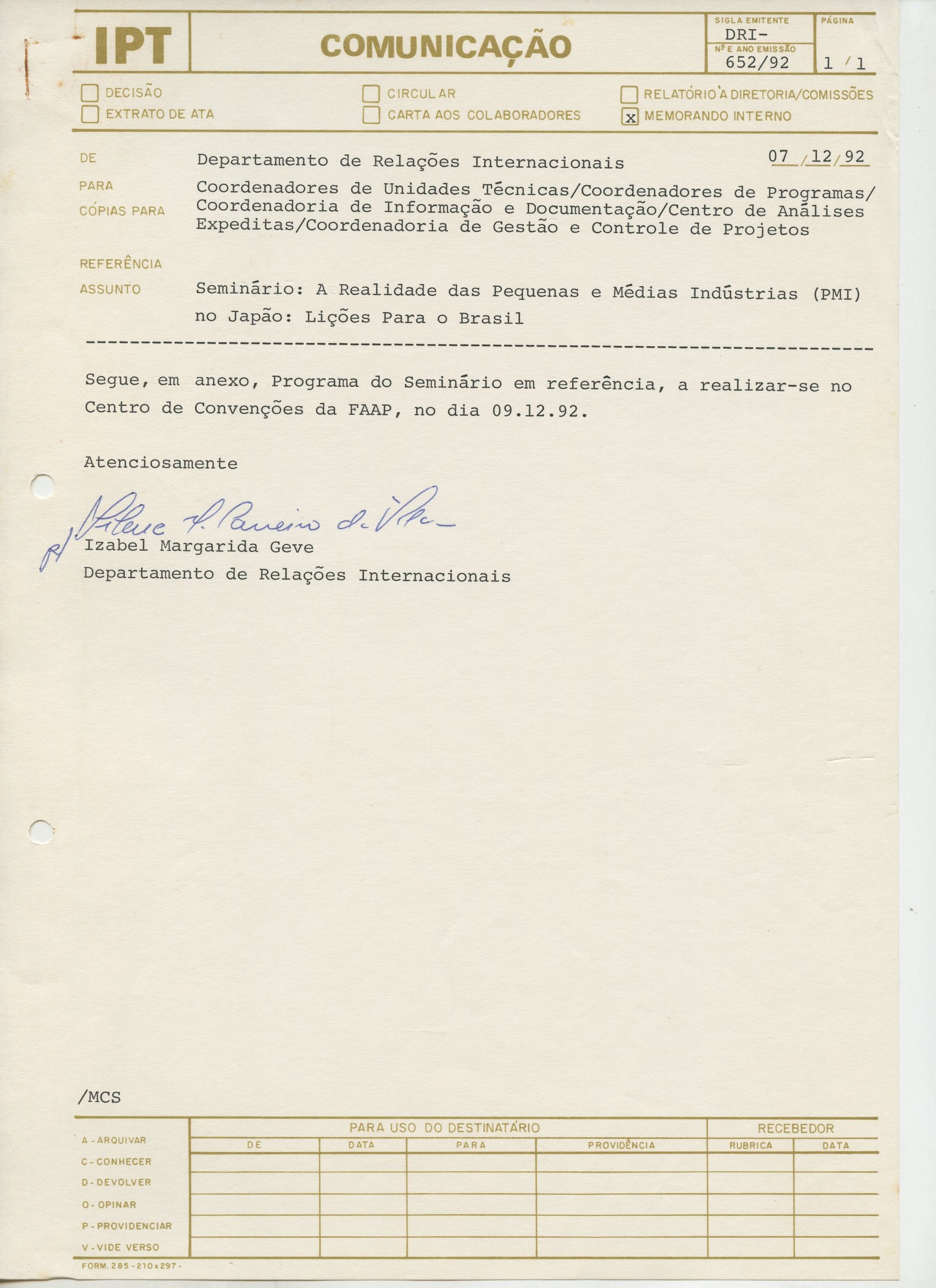 Correspondências gerais da JICA (fax, cartas, memorandos) sobre o comitê, seminários, cursos, relatórios, treinamentos e avaliações. Documentos sem relação e de assuntos diversos: bilhete solicitando doação a empresa Asahi Chemical Industry Co. Ltd., requisição de desembaraço aduaneiro de materiais e equipamentos, bilhete contendo telefone e endereço do Conselheiro Rubens de Souza Sarmento, folheto da campanha do agasalho, cópia de cartão de visita, e cartão de sugestão.