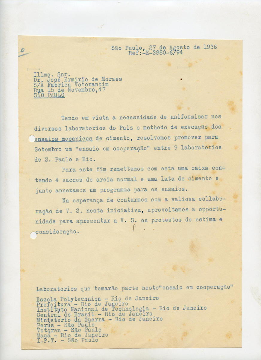 01.001.0112.0236 Baixar Número de registro01.001.0112.0236Conjunto de itens Conteúdo Envio de amostras de cimento pelo IPT, para que sejam submetidos à análises na Fabrica Votorantim; Reporte ao IPT dos resultados obtidos da analyse feita com a Amostra Padrão que lhes foi enviada Grupo Memória Institucional Subgrupo Memória da ciência Data [__/__/1936] Quantidade de documentos A4, 14 folhas Procedência Memória Histórica IPT Item anterior01.001.0112.0235 Próximo item01.001.0112.0237