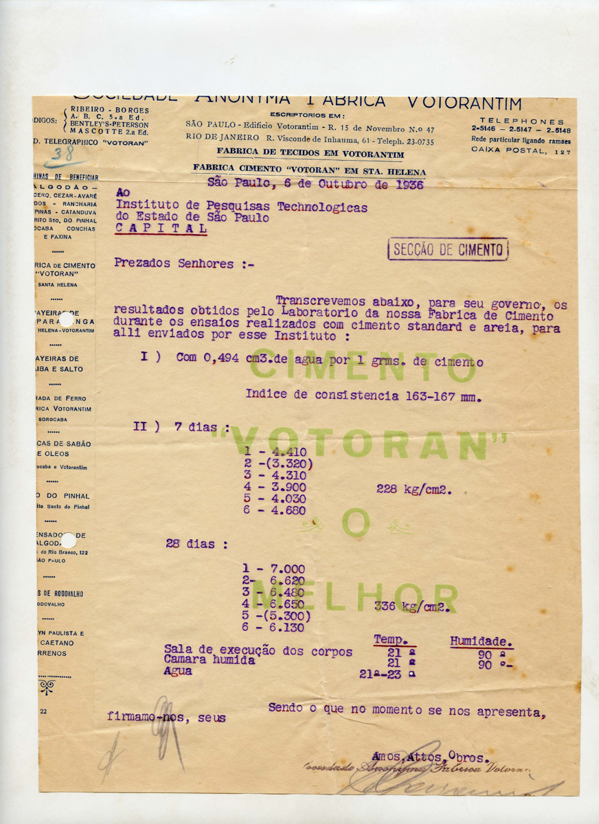 01.001.0112.0243 Baixar Número de registro01.001.0112.0243Conjunto de itens Conteúdo Envio de amostras de cimento pelo IPT, para que sejam submetidos à análises na Fabrica Votorantim; Reporte ao IPT dos resultados obtidos da analyse feita com a Amostra Padrão que lhes foi enviada Grupo Memória Institucional Subgrupo Memória da ciência Data [__/__/1936] Quantidade de documentos A4, 14 folhas Procedência Memória Histórica IPT Item anterior01.001.0112.0242 Próximo item01.001.0112.0244