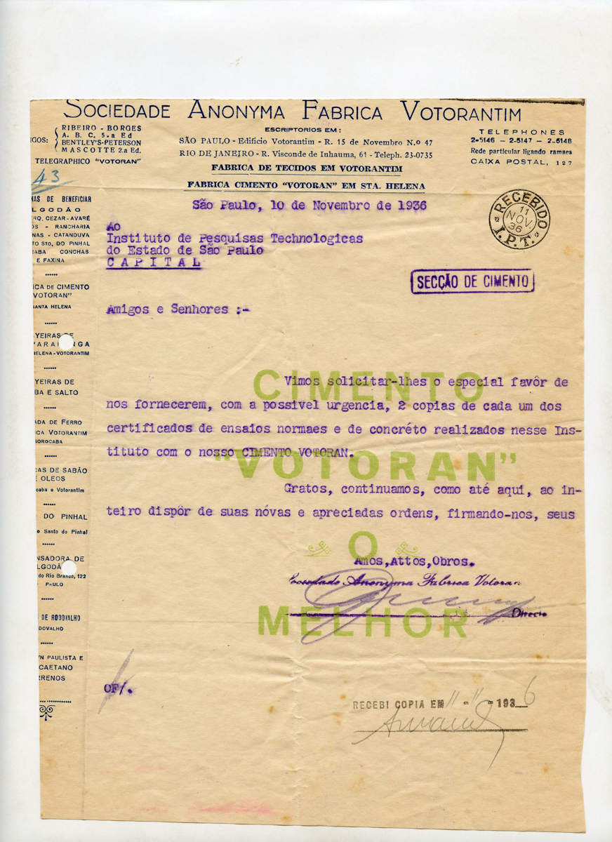 01.001.0112.0248 Baixar Número de registro01.001.0112.0248Conjunto de itens Conteúdo Comunicados do IPT relativos ao envio do relatório correspondente à "1ª série de ensaios mecânicos em cooperação" de cimento Portland; Solicitação de analyse chimica do CIMENTO VOTORAN Grupo Memória Institucional Subgrupo Memória da ciência Data [__/__/1936] Quantidade de documentos A4, 4 folhas Procedência Memória Histórica IPT Item anterior01.001.0112.0247 Próximo item01.001.0112.0249
