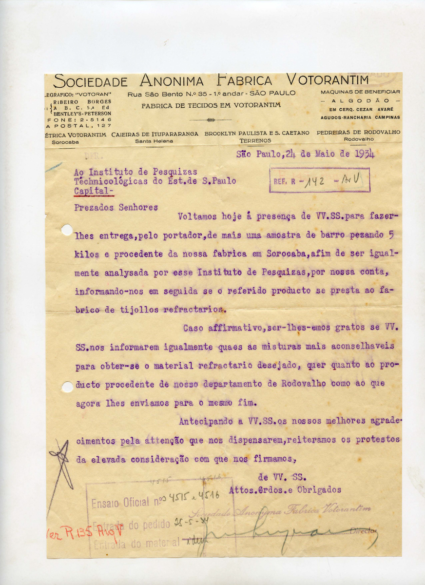 Resultado encontrado pelo Laboratório da Fabrica Votorantim na Analyse da Amostra-Padrão 1-D-6, enviada pelo IPT; Comunicado do IPT relativos ao envio do relatório correspondente à "4ª série de Analyses chimicas em cooperação" de cimento Portland, juntamente com a amostra 1E 1F, que constituirão material para as 5ª e 6ª séries; Envio de amostras e solicitações de análises