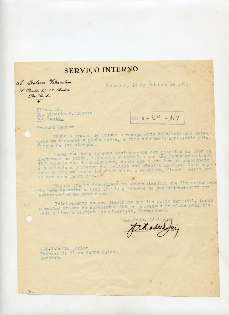 Correspondência enviada a José Ermirio de Moraes pelo IPT, dizendo que como um dos frutos do estudo sistemático a que este instituto vem procedendo há vários anos, e dentro dos institutos da sua criação, têm estudado a possibilidade do emprego de madeiras do IPT para a fabricação de lançadeiras para teares; Correspondência da Sociedade Anonima Fabrica Votorantim ao Dr. Ary Torres, do IPT, indicando que o Dr. José Ermirio de Moraes vai ao Instituto aprender o processo de verificação da proteína contida na torta e a saponificação do sabão; correspondências em resposta as duas cartas