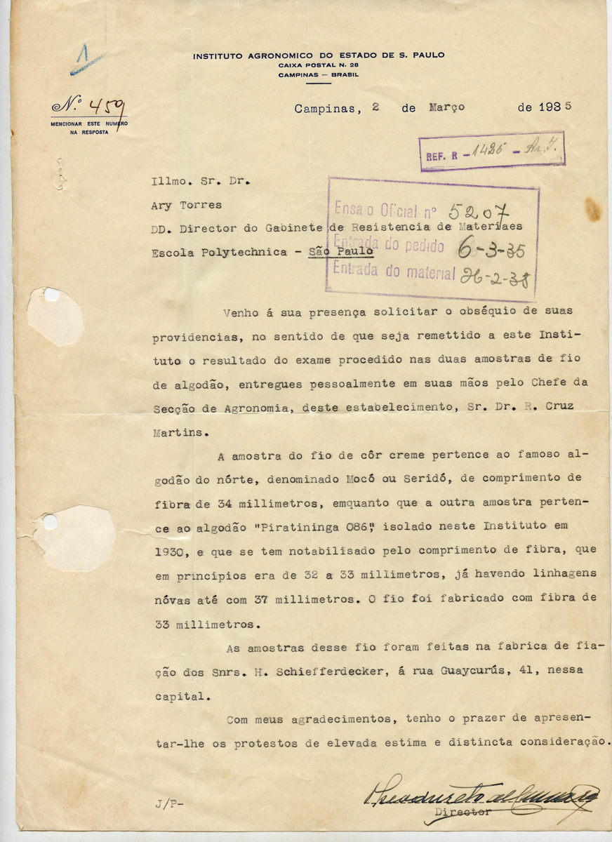 Envio de J. E. Rombouts, botânico da Secção de Solos do Instituto Agronômico do Estado de São Paulo, de alguns pedaços de madeira que o Snr. Dr. J. Aranha Pereira, do Laboratório de Ensaio de Materiais da Escola Politécnica, se promtificou a identificar